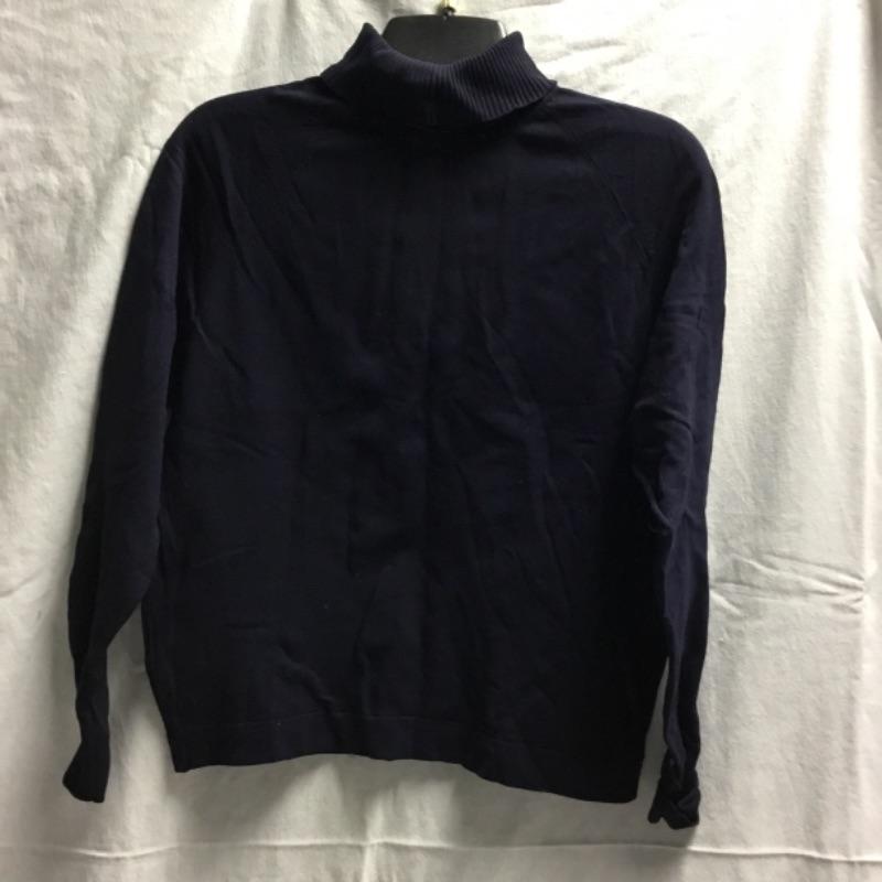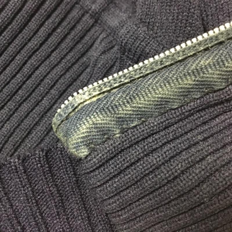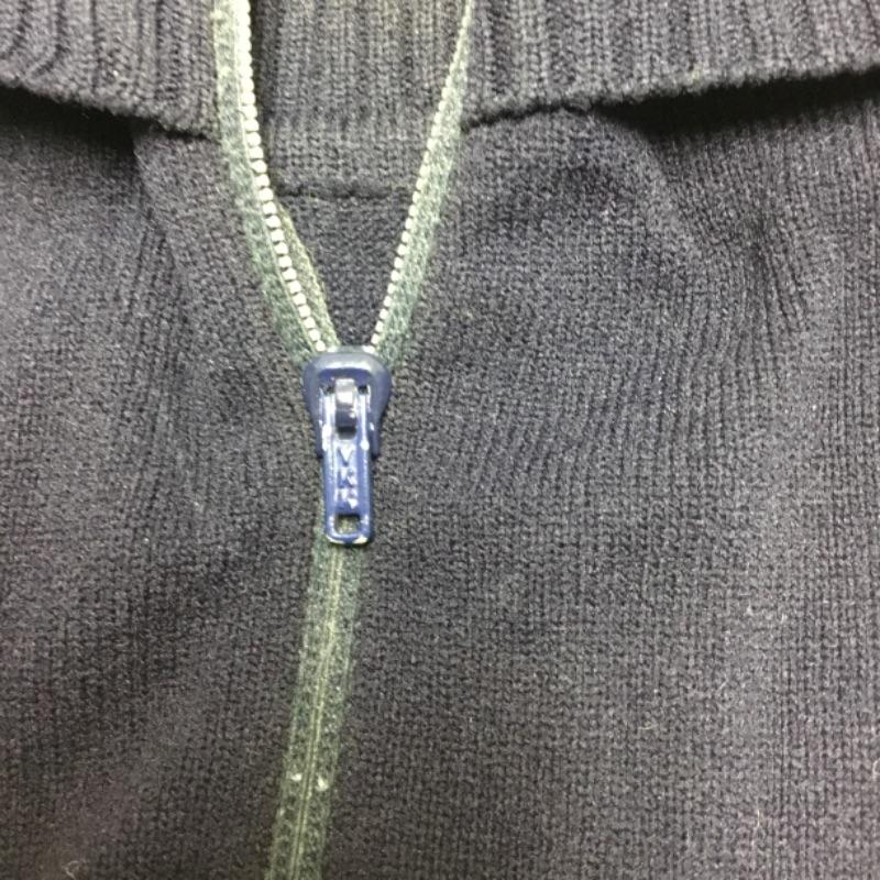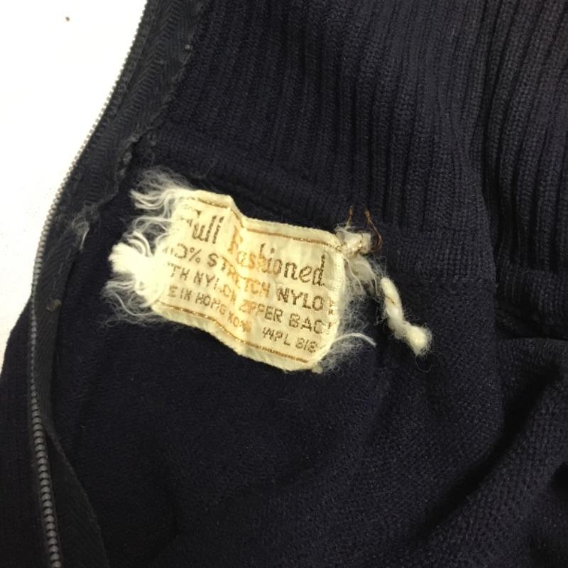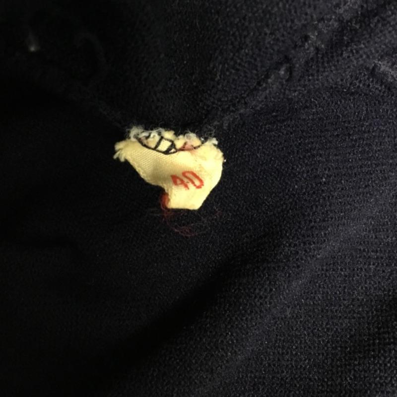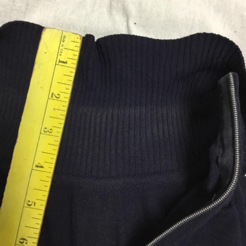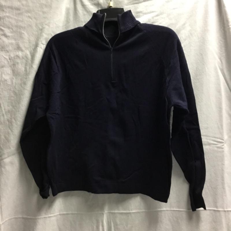 Here we have a navy blue sweater with a zipper collar. Tag says it is a size 40 equivalent to a size to an adult size small. Material is in decent shape, there are sweat stains in the rim of the collar. The zipper seems to have trouble zipping due to age. Clothing tag is frayed and hanging on by thread. See pictures.