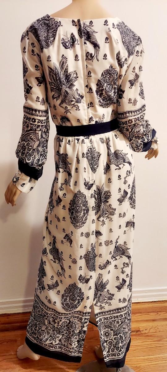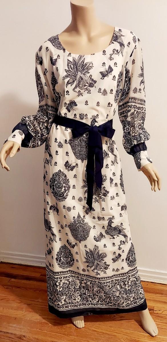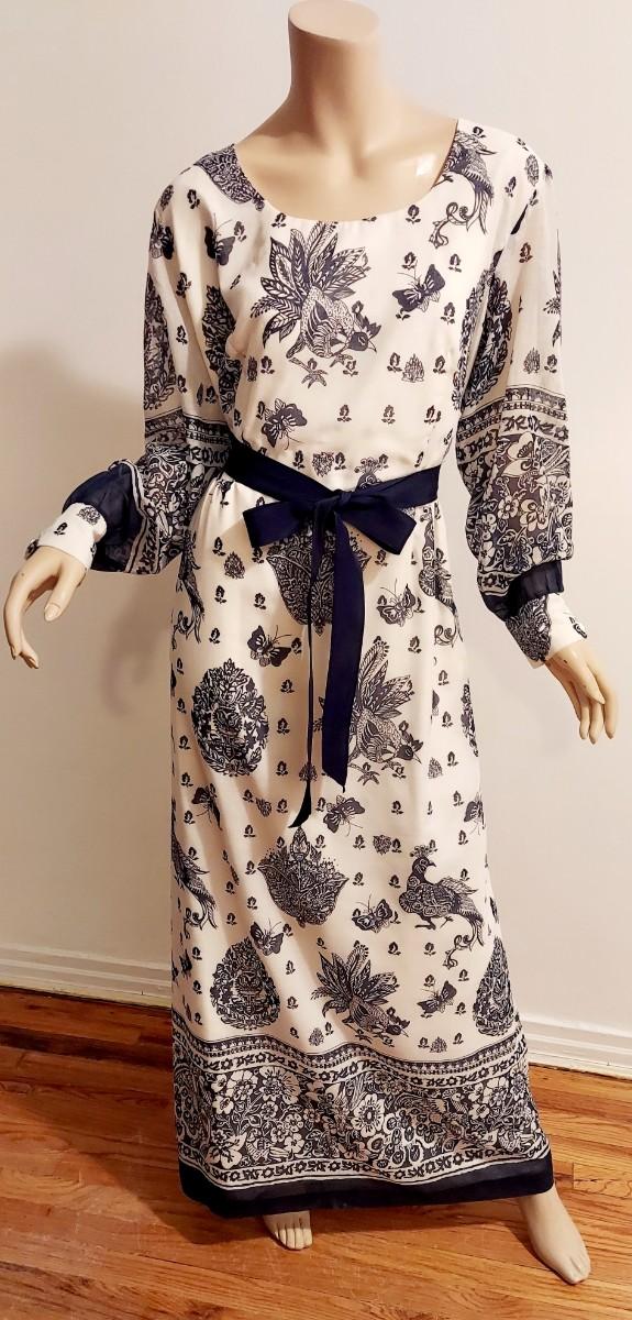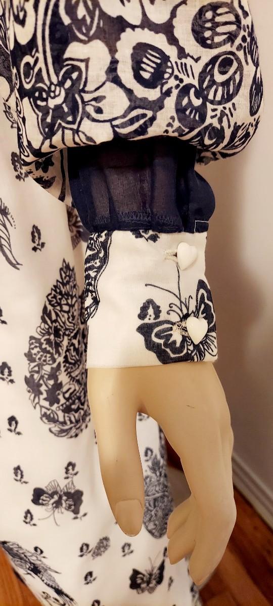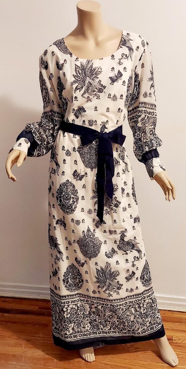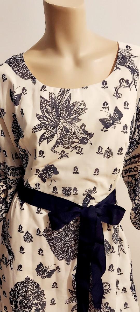 This one is truly Beauty ,a Large Size hand printed Peacock and Butterfly Blue on white Backgroud. And look at those Heart Shspe Buttons at Sleeves . Dress is lined
