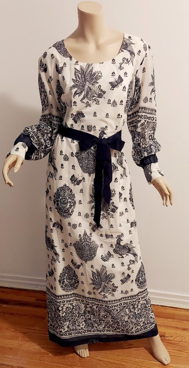 Full Figured Babe vtg 1970's Navy/White Voile Batiste Maxu Novelty Dress Sash Blue Ribbon