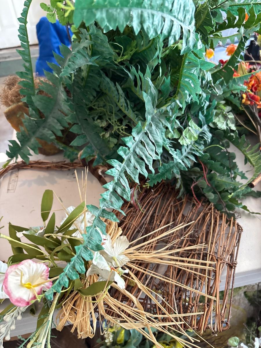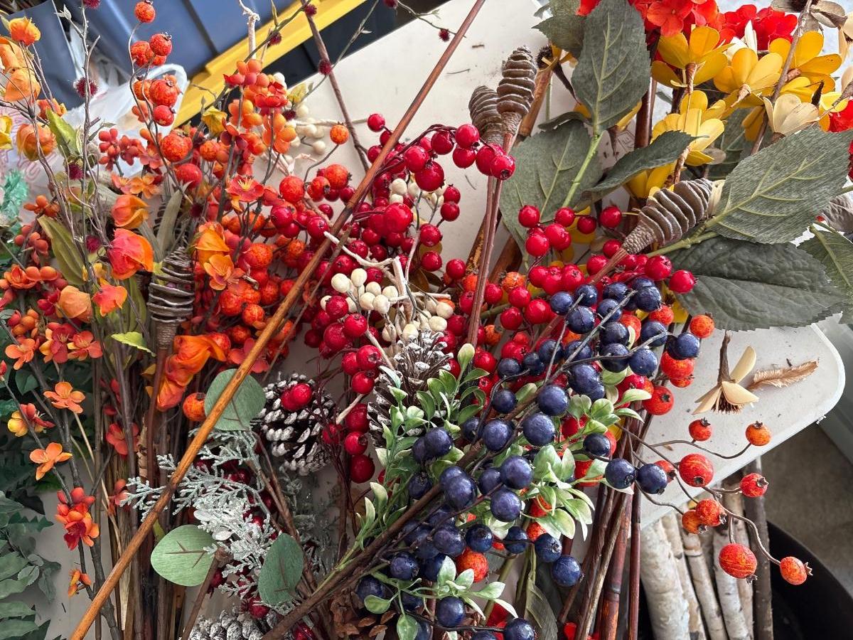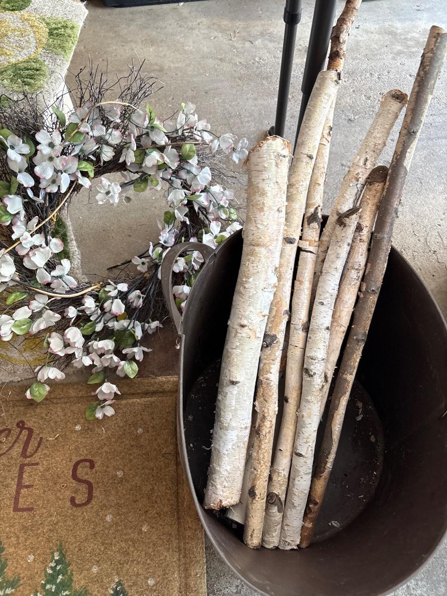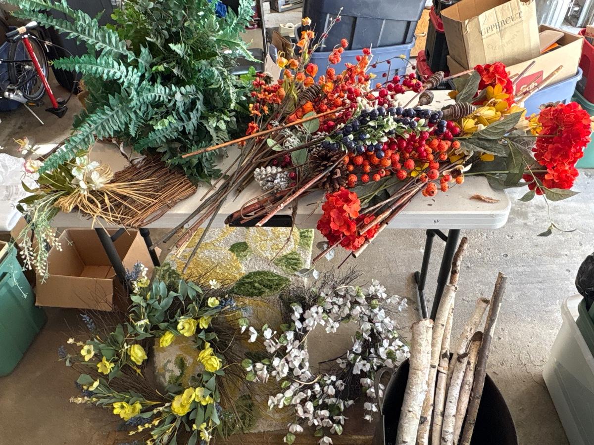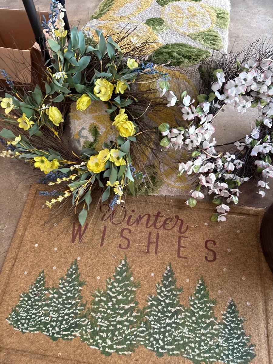 Fall flowers, two wreaths, two rugs, birch, and tote