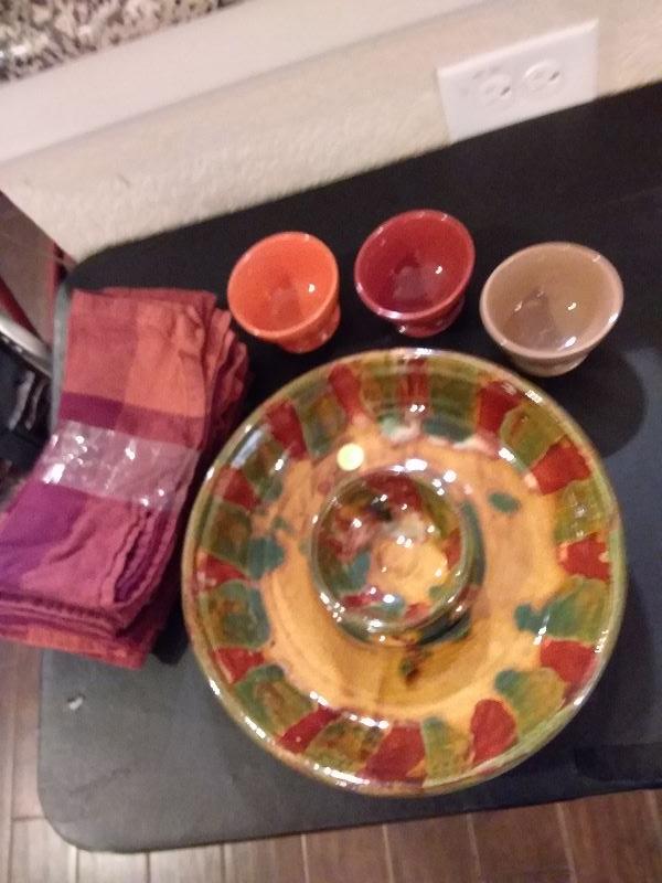 Chip and dip bowl, 8 cloth napkins, 3 small dip bowls.