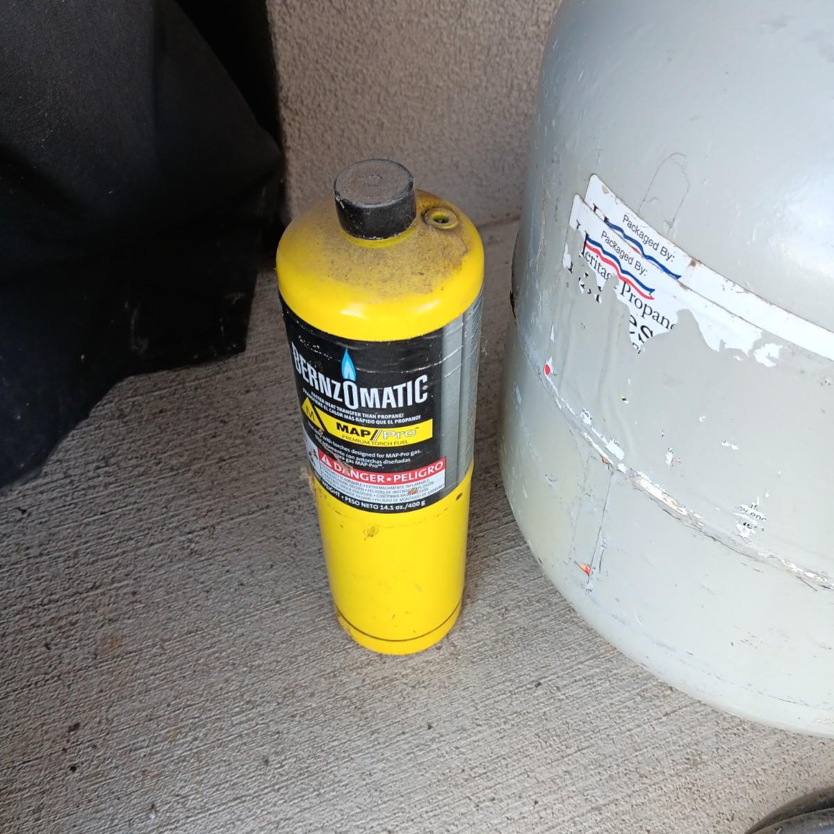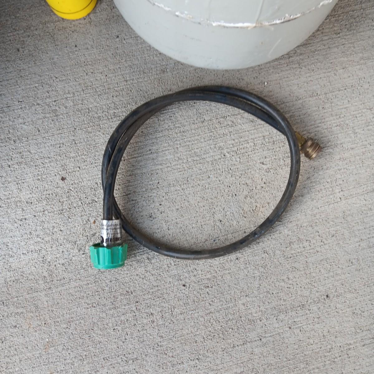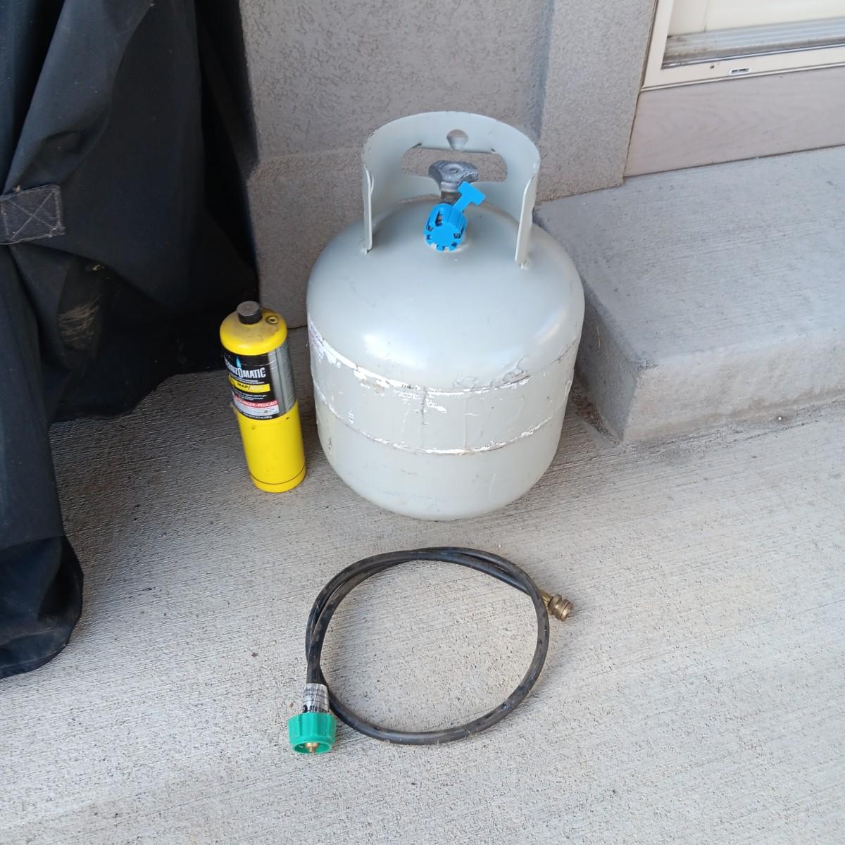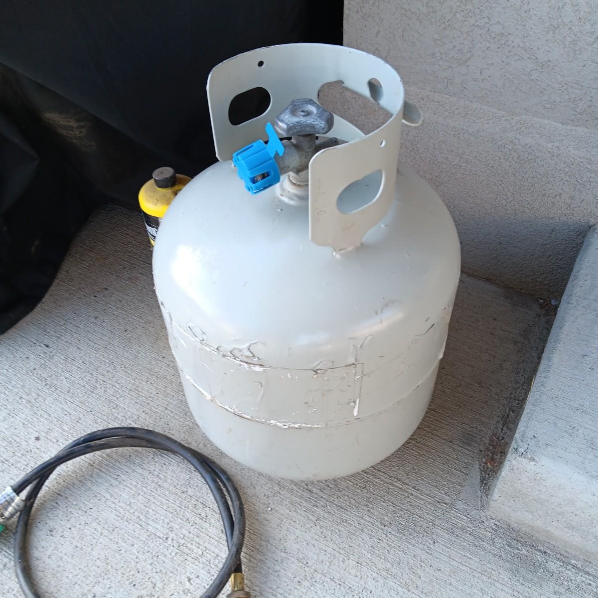 FULL PROPANE TANK, GAS HOSE AND PARTIAL BENZO
