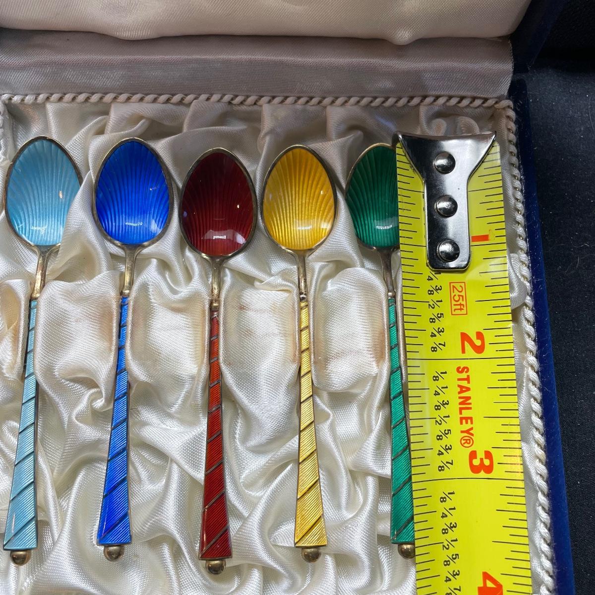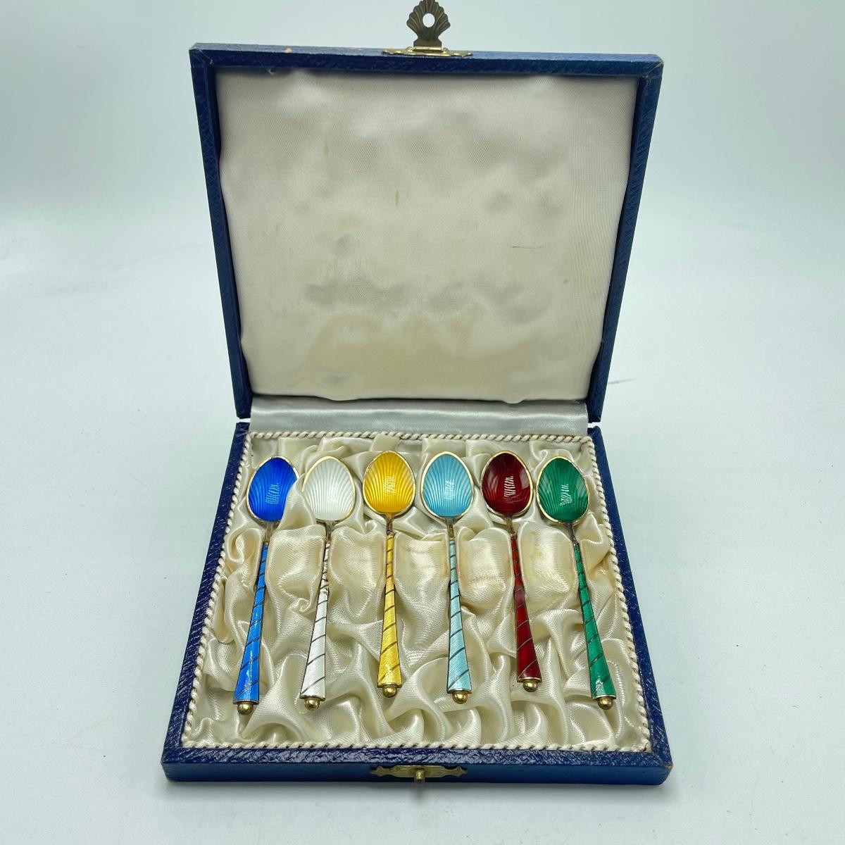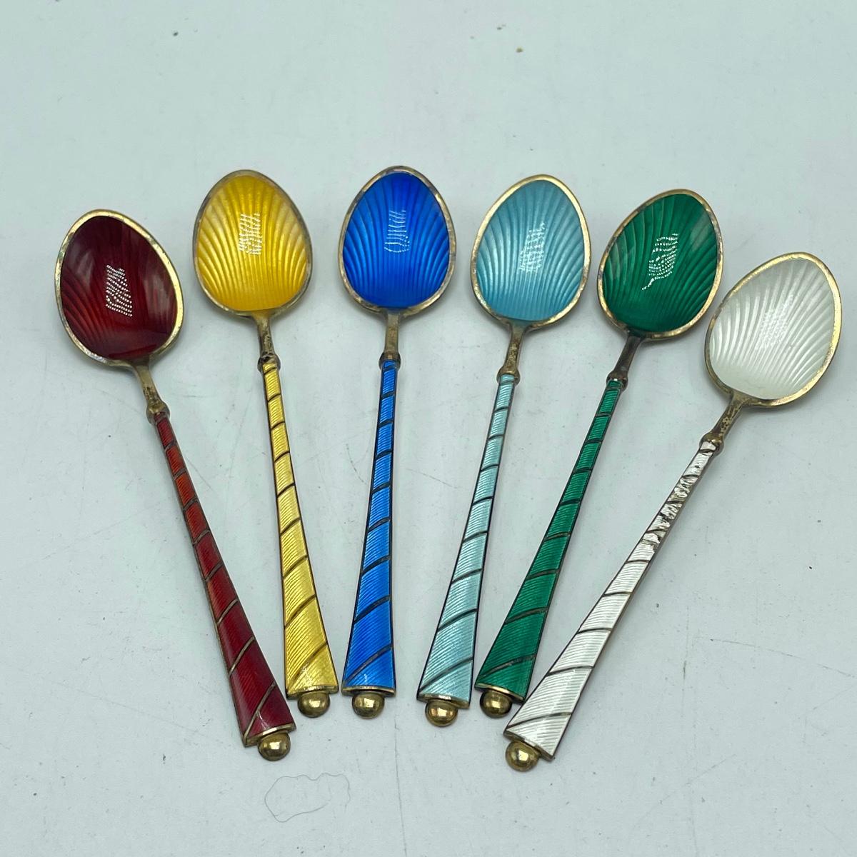 This gorgeous set of six enamel coated sterling teaspoons are marked ELA Denmark. Each spoon is a different color enamel.