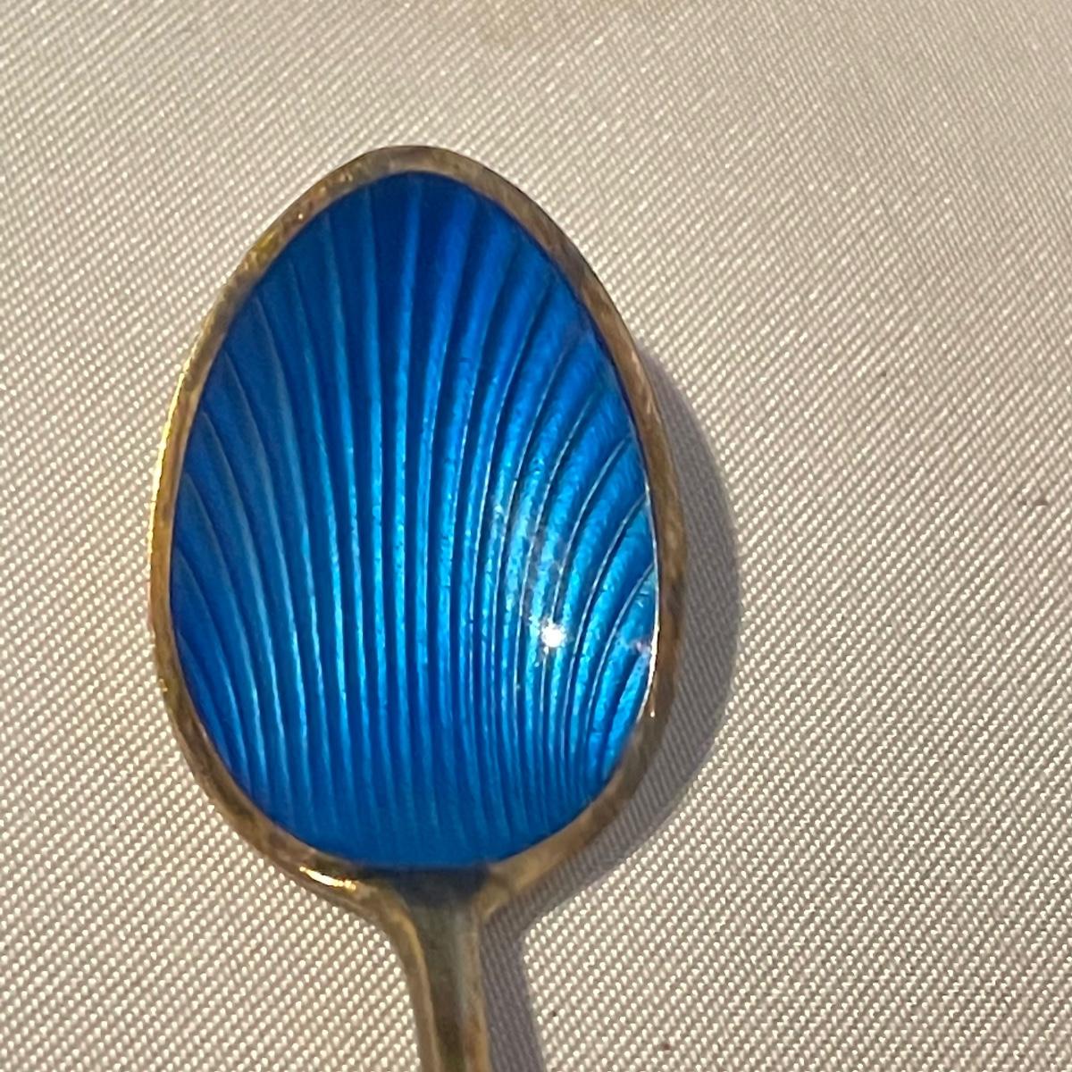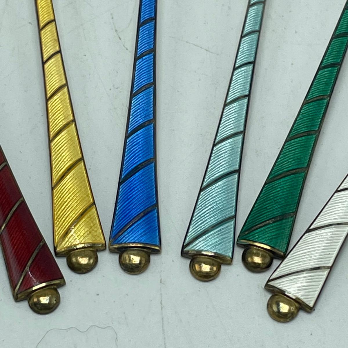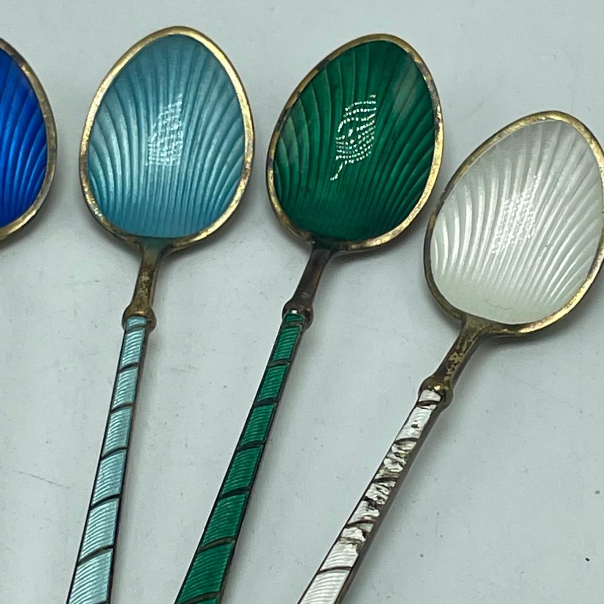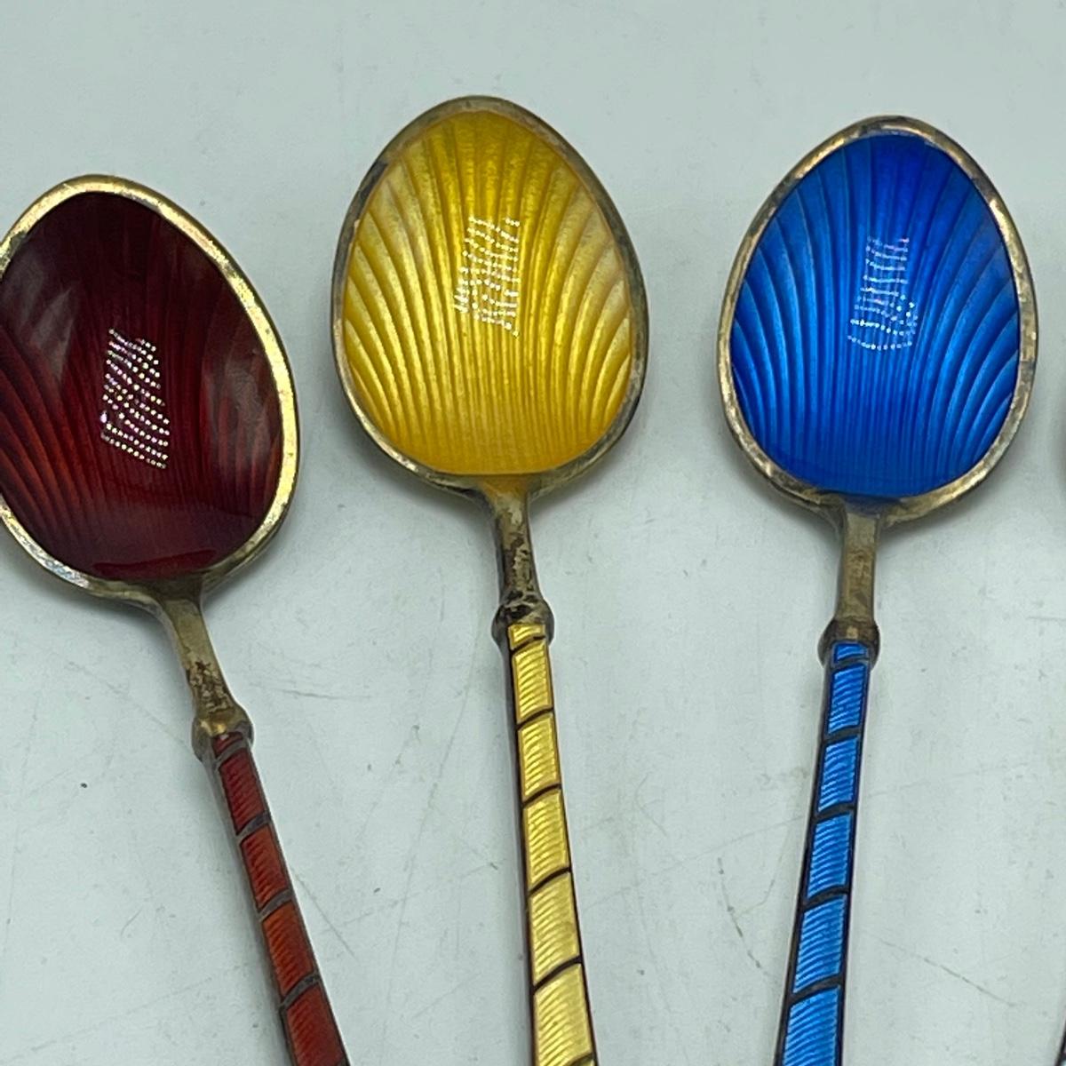 This gorgeous set of six enamel coated sterling teaspoons are marked ELA Denmark. Each spoon is a different color enamel.