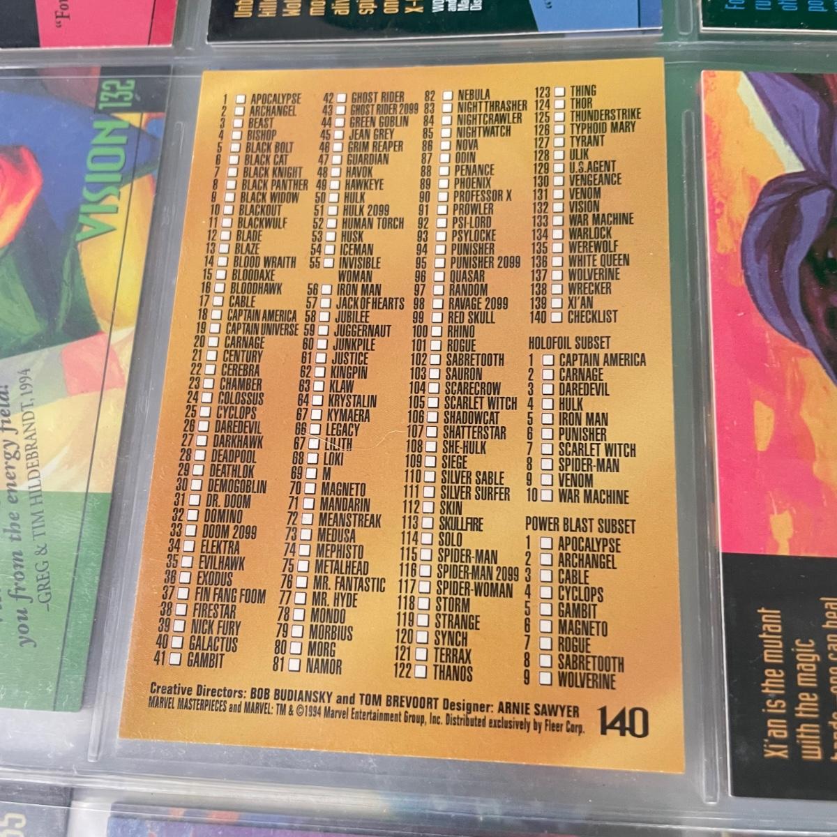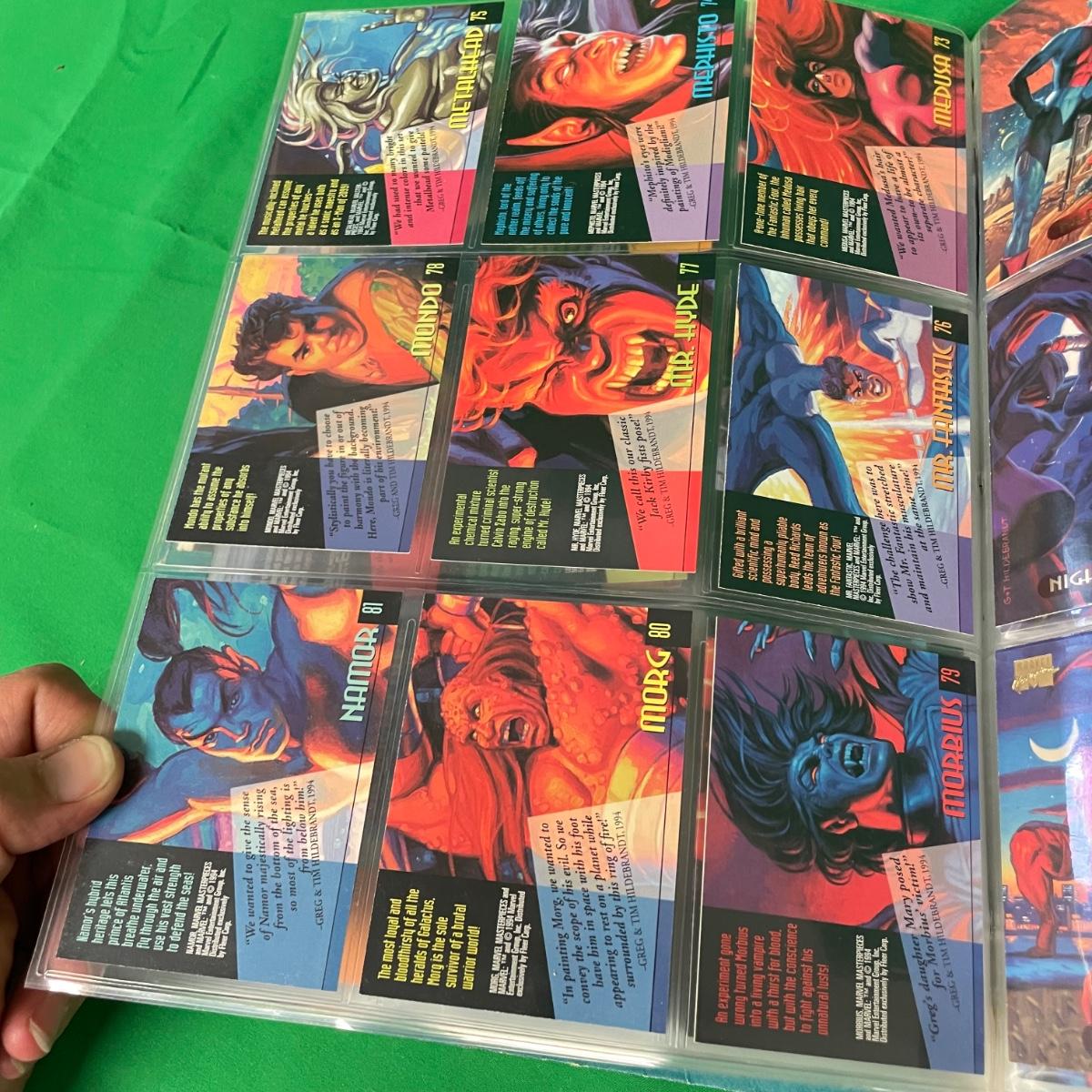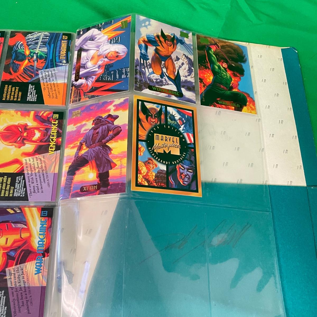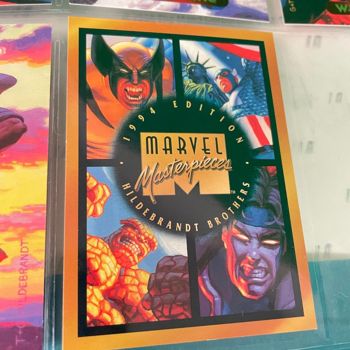 Stored in protective sheets are 140 Marvel Masterpieces trading cards by Fleer. Two cards have two Hildebrandt gold foil signatures (see images). Set appears to be complete- see photos. Items are sold as-is. No returns or refunds. Please bid accordingly.