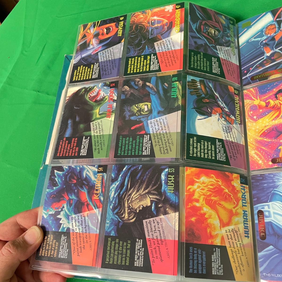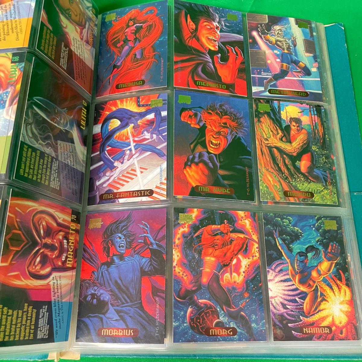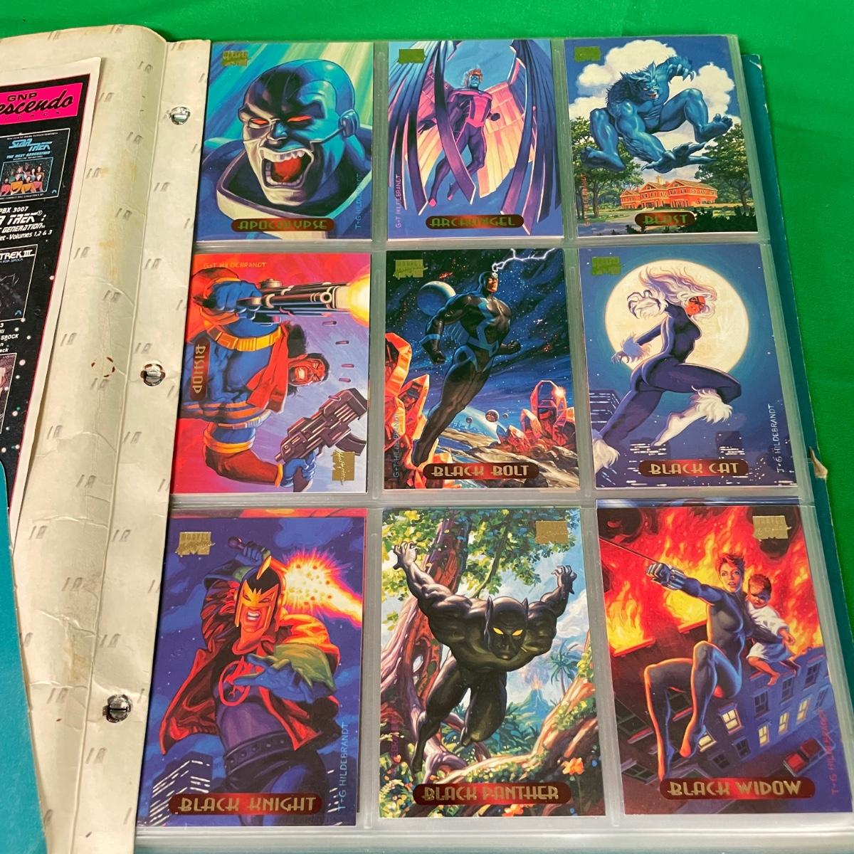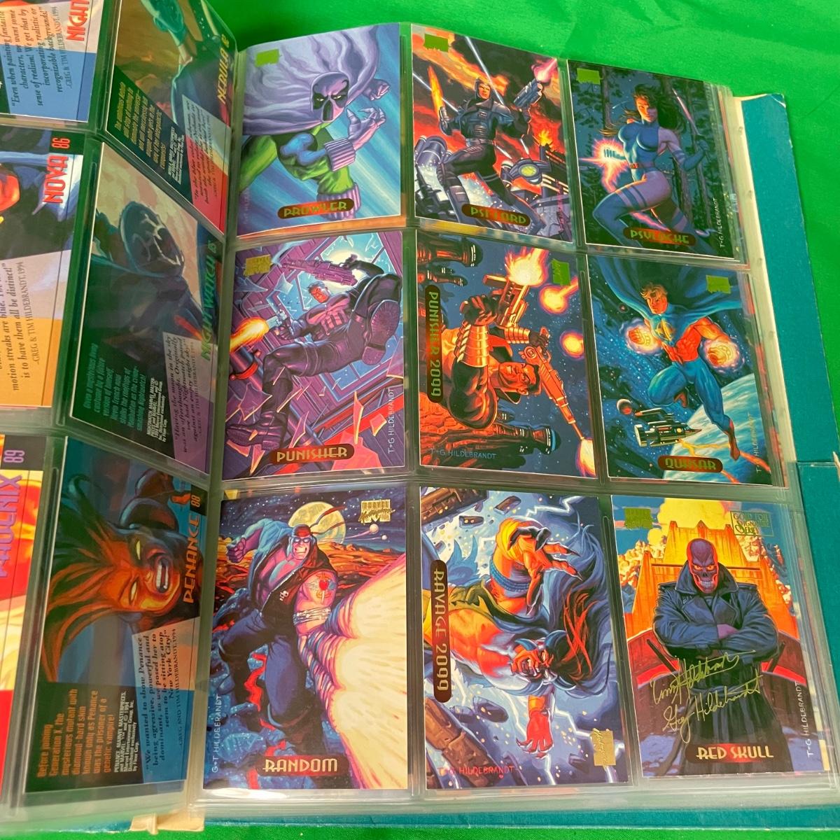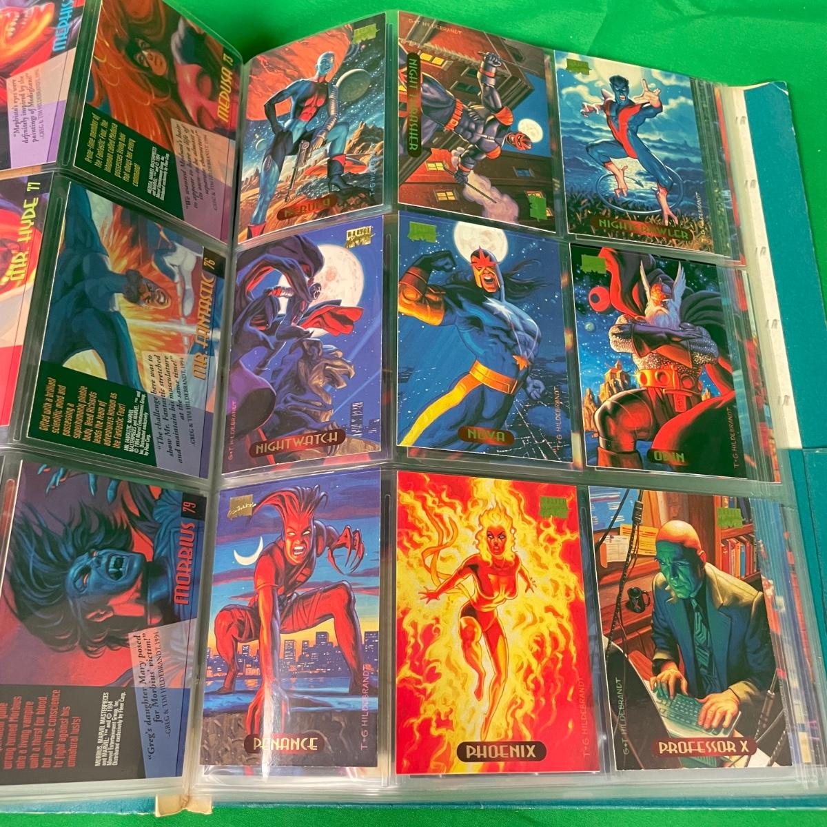 Stored in protective sheets are 140 Marvel Masterpieces trading cards by Fleer. Two cards have two Hildebrandt gold foil signatures (see images). Set appears to be complete- see photos. Items are sold as-is. No returns or refunds. Please bid accordingly.