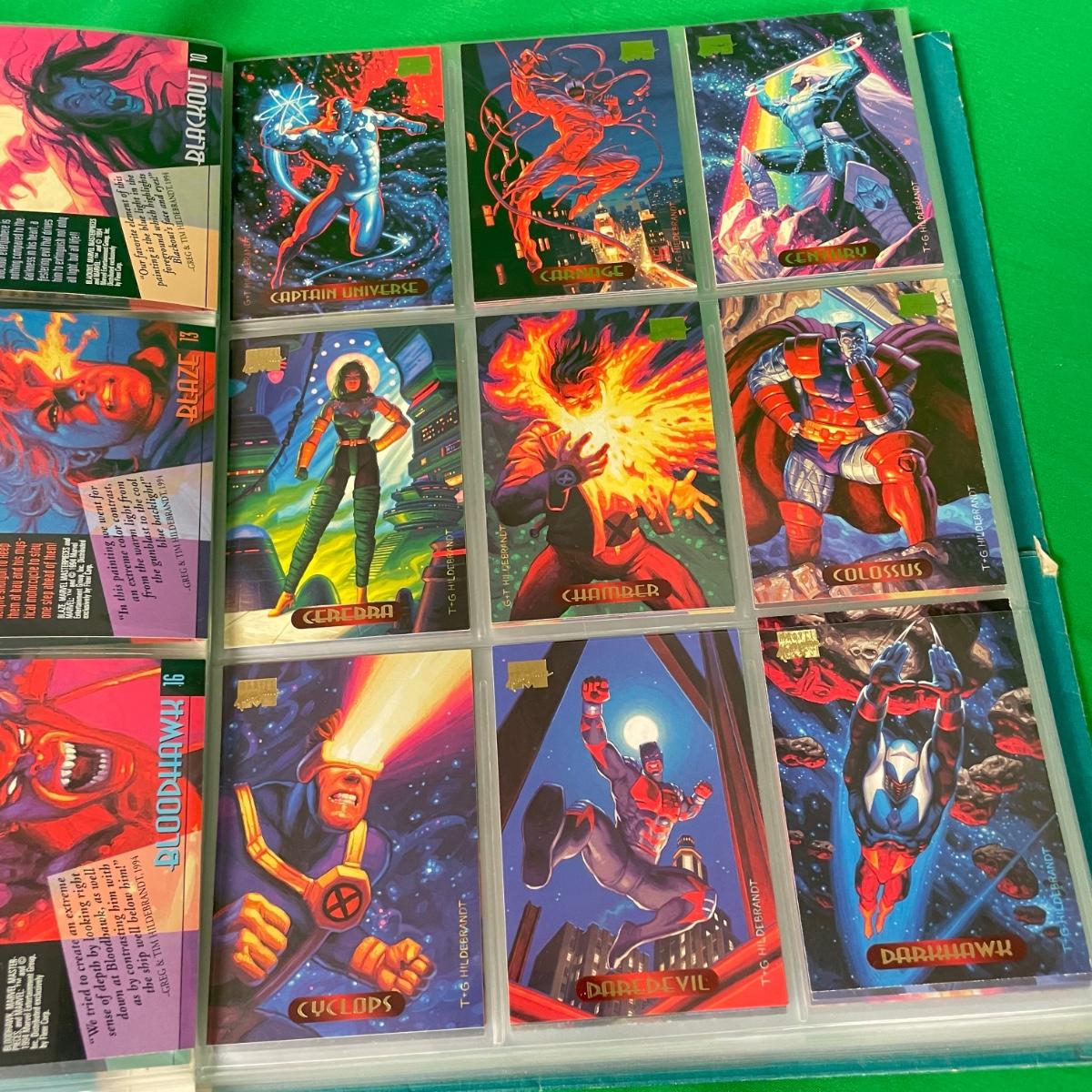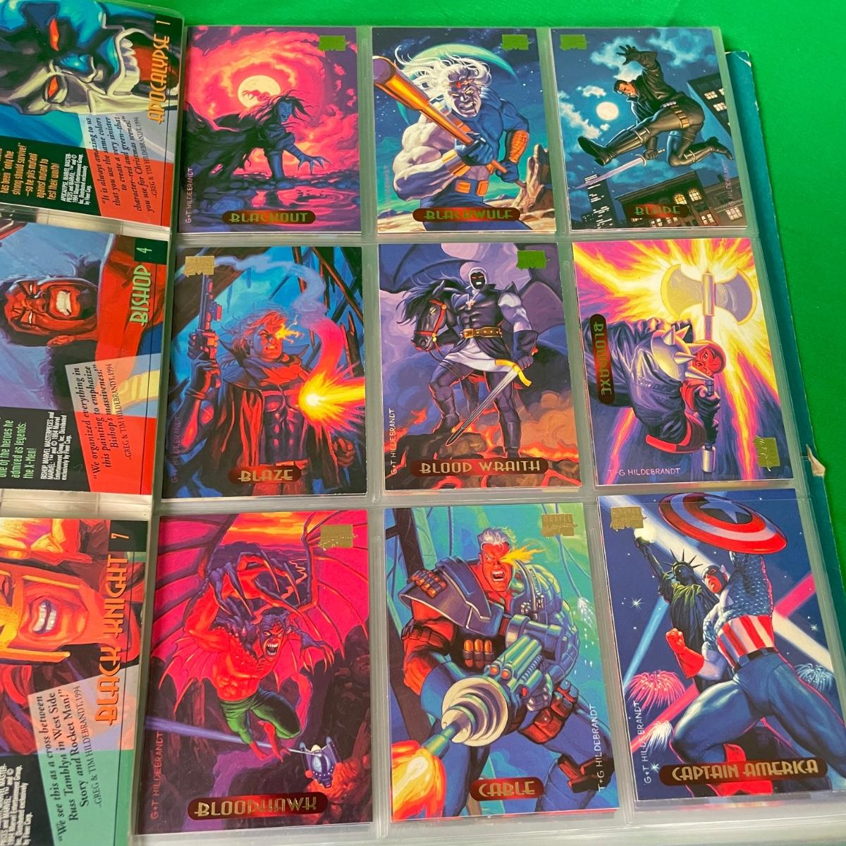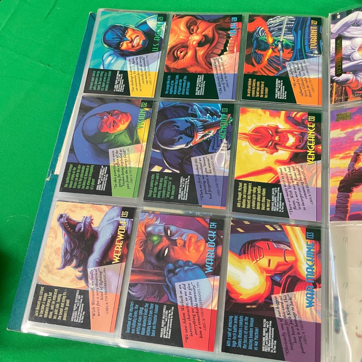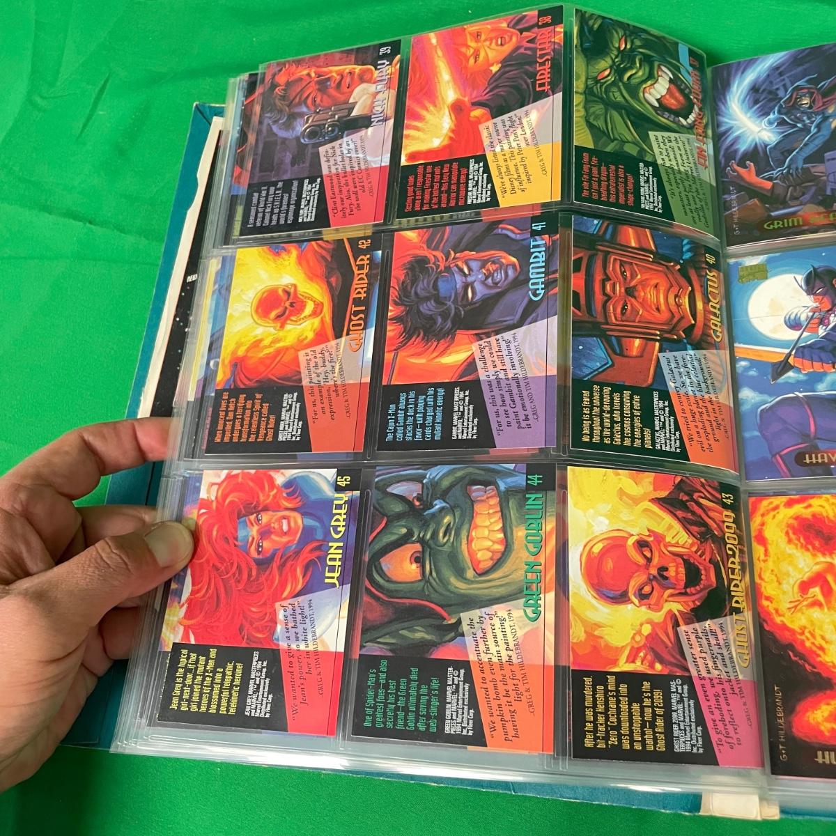 Stored in protective sheets are 140 Marvel Masterpieces trading cards by Fleer. Two cards have two Hildebrandt gold foil signatures (see images). Set appears to be complete- see photos. Items are sold as-is. No returns or refunds. Please bid accordingly.