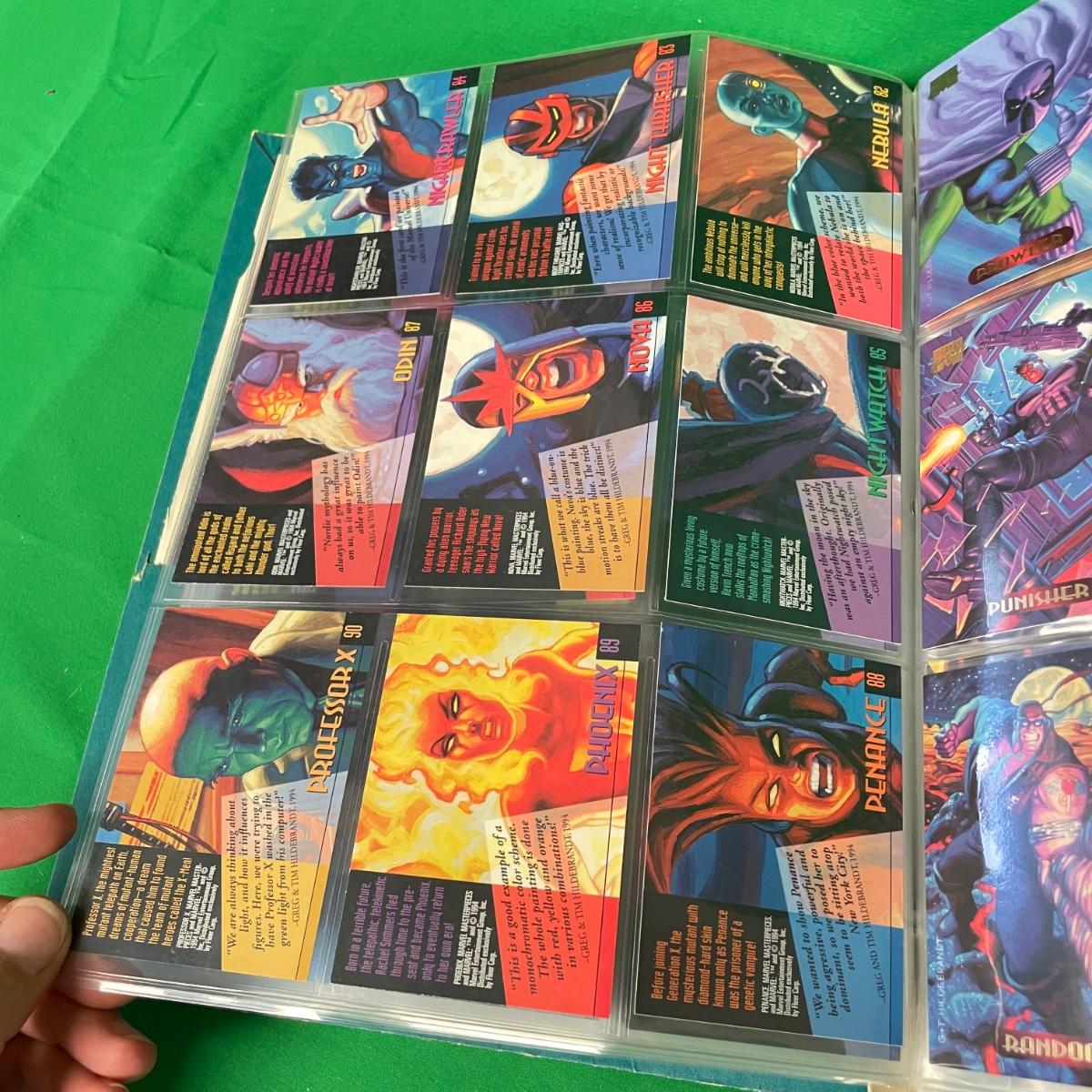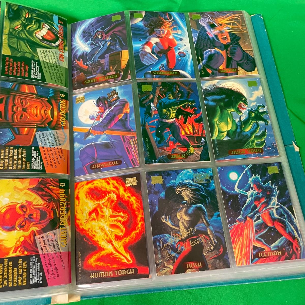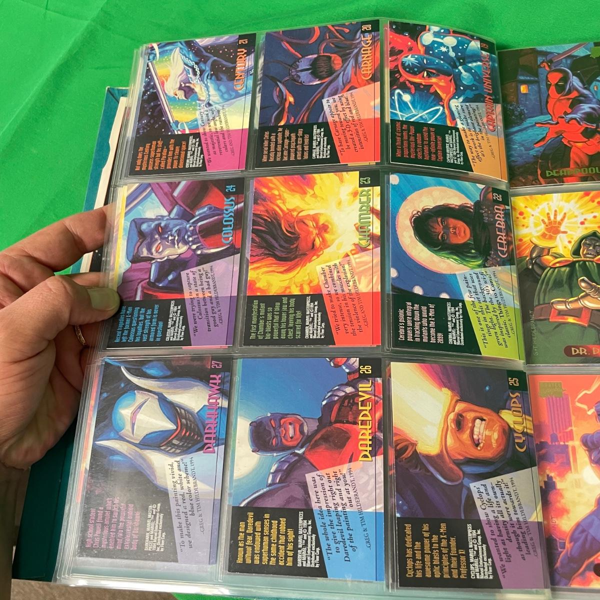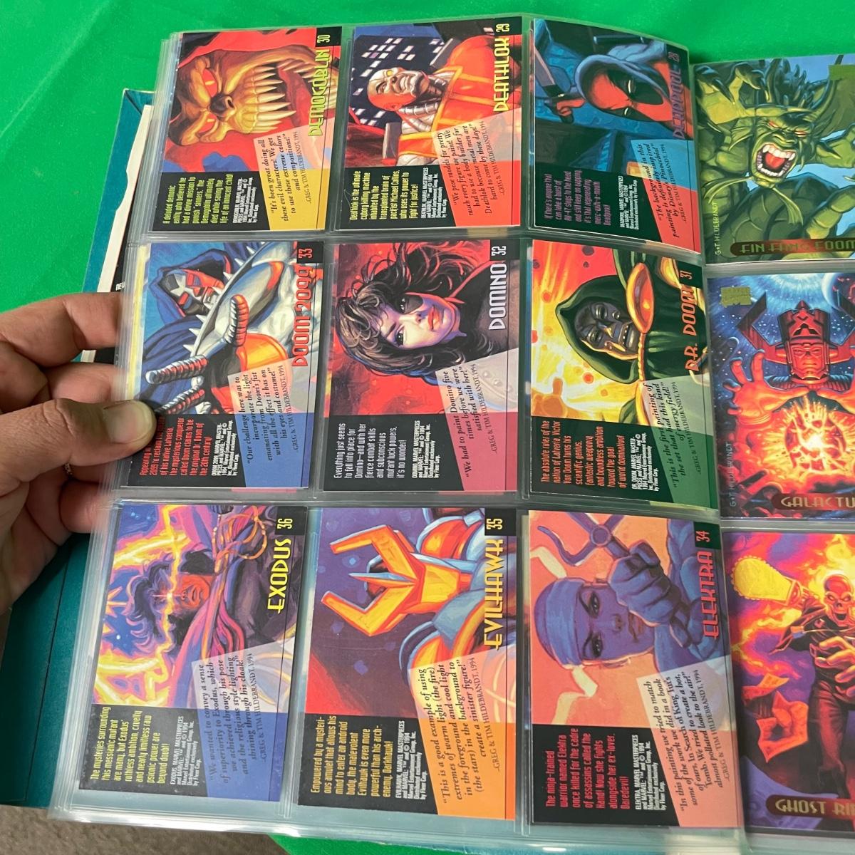 Stored in protective sheets are 140 Marvel Masterpieces trading cards by Fleer. Two cards have two Hildebrandt gold foil signatures (see images). Set appears to be complete- see photos. Items are sold as-is. No returns or refunds. Please bid accordingly.