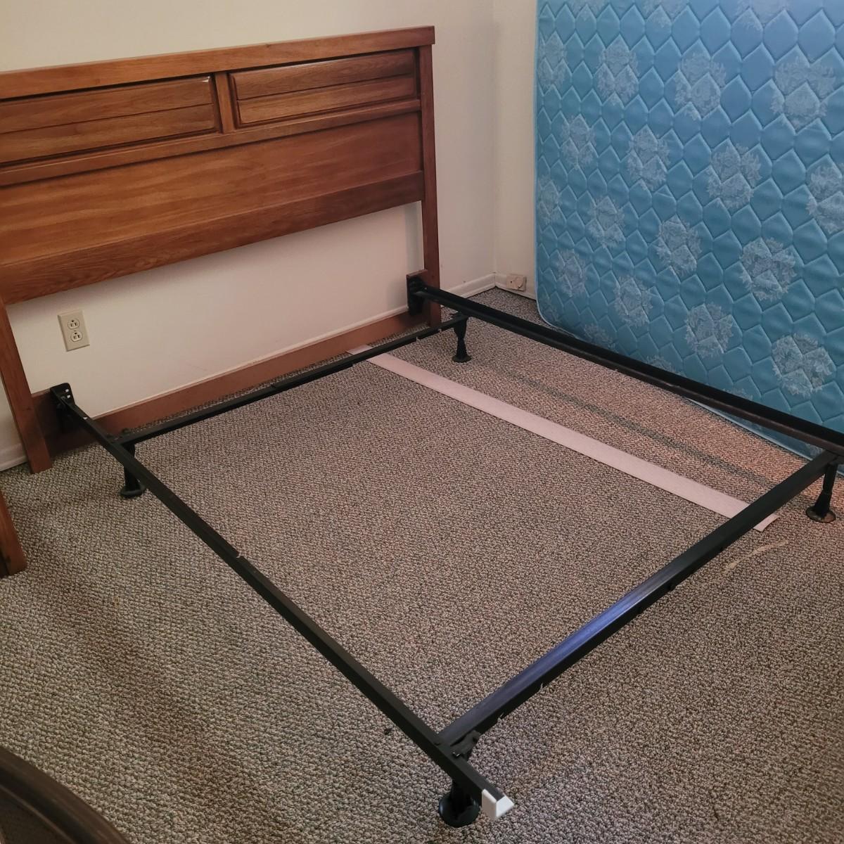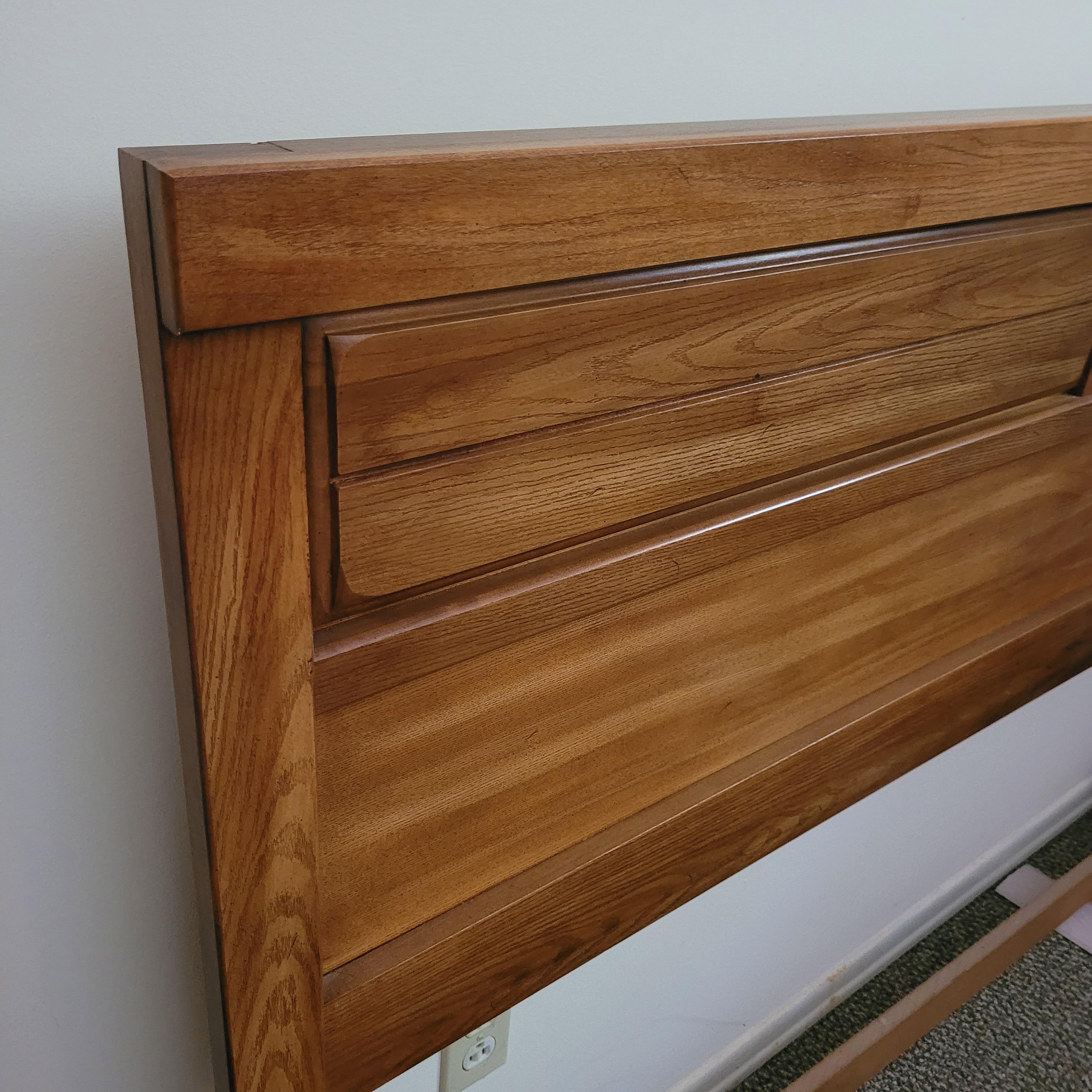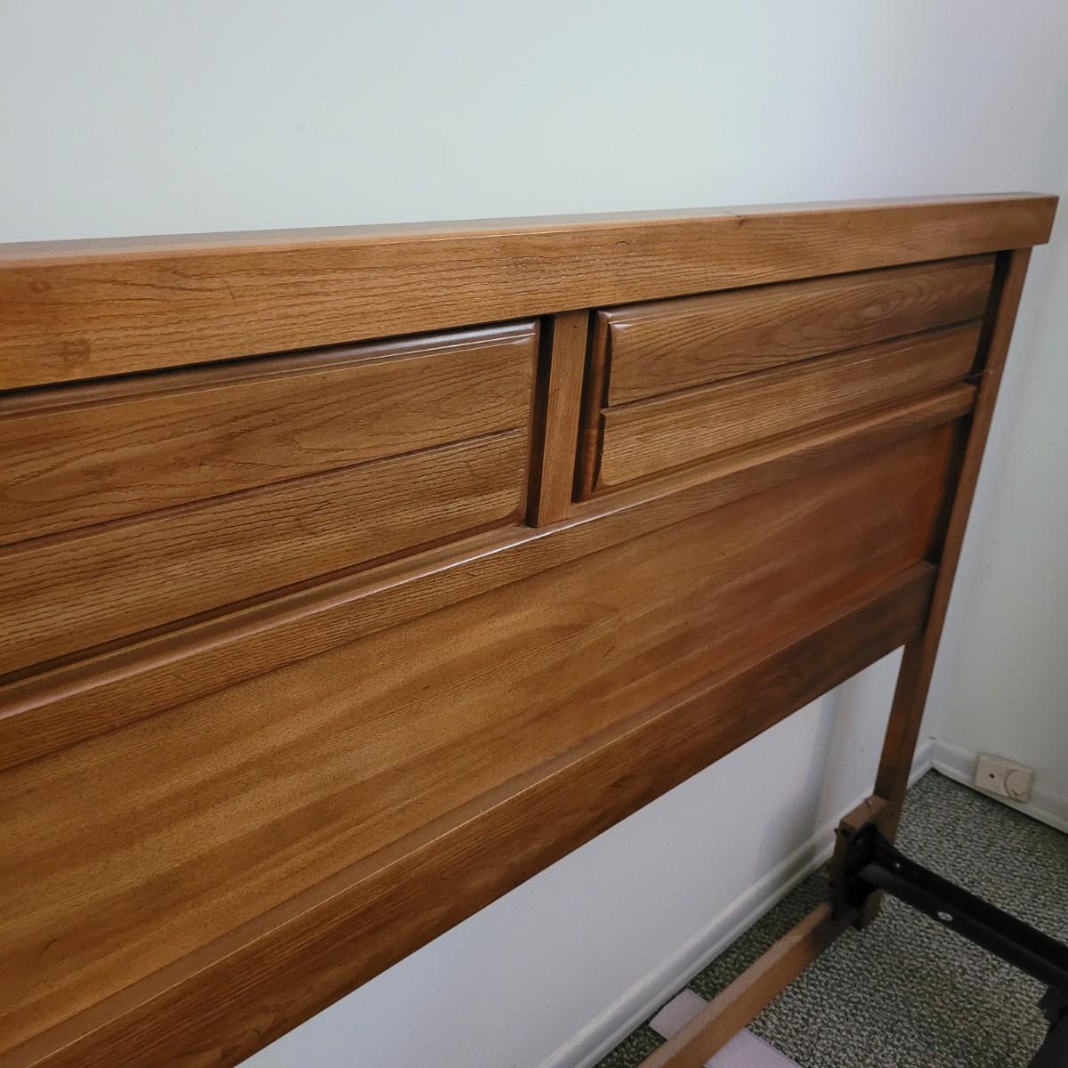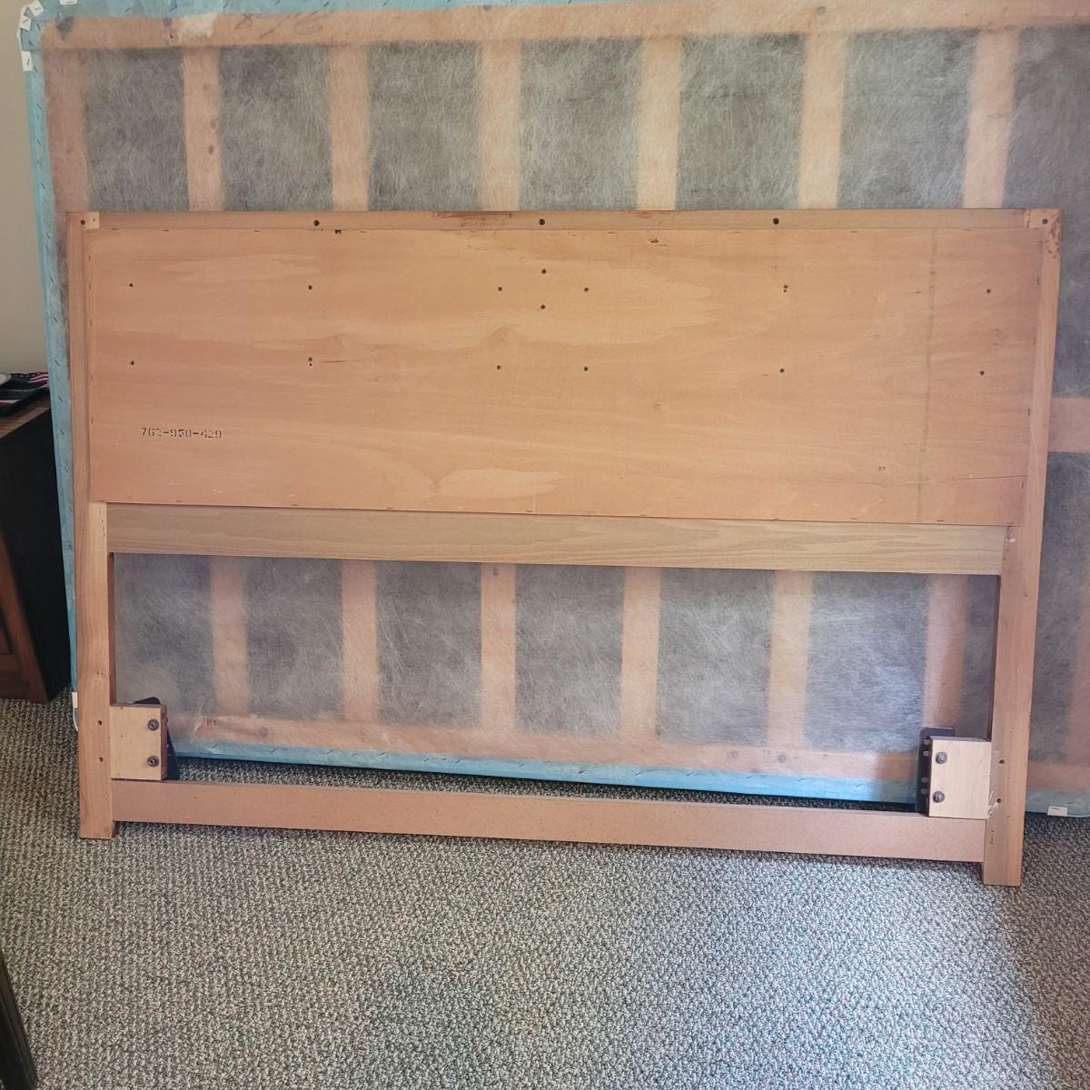 Solid wood headboard on metal frame. Headboard measures approximately 62.5” x 42.” The mattress and box spring are NOT included. Local pickup only. Winning bidder must bring assistance to help move and load this item due to its weight and size.