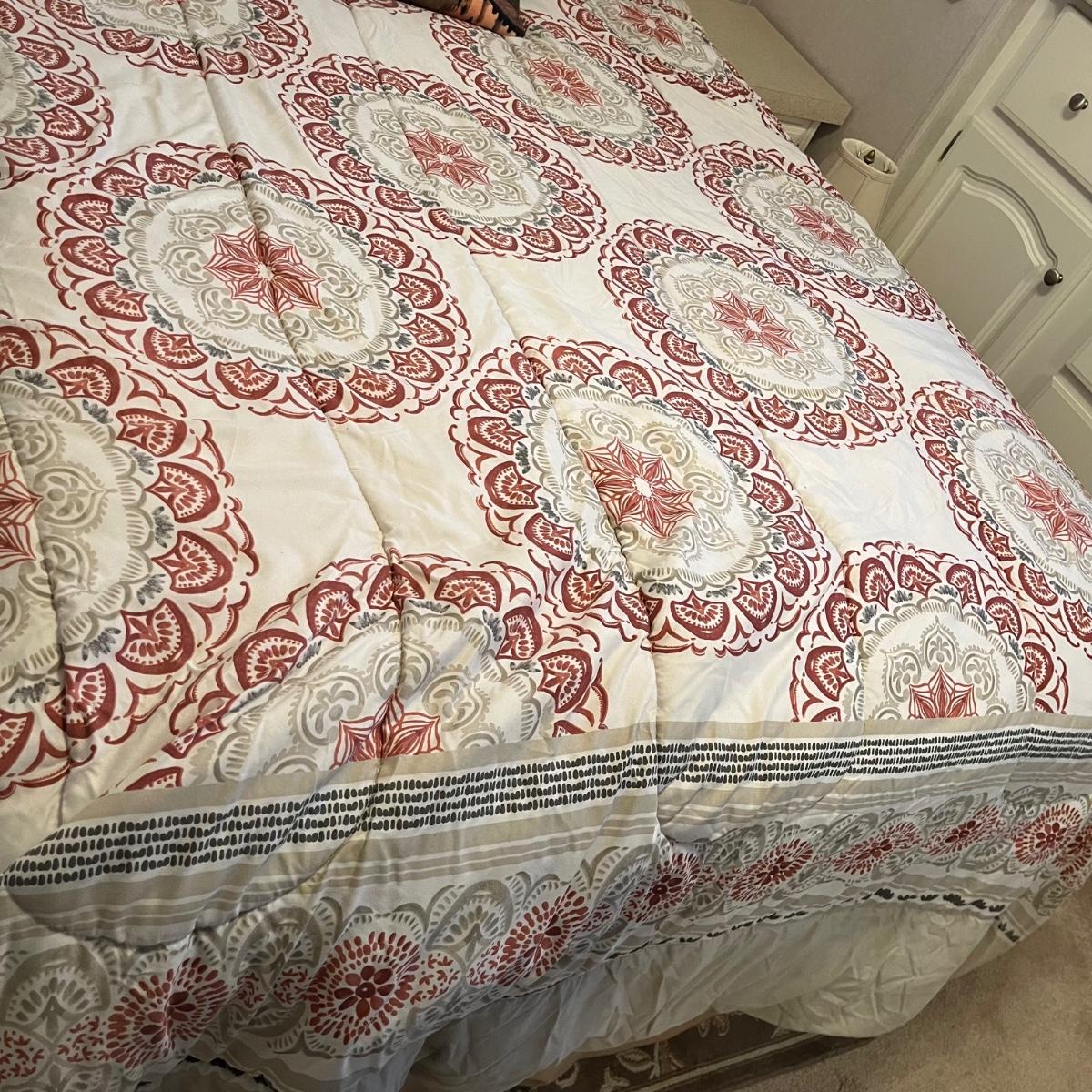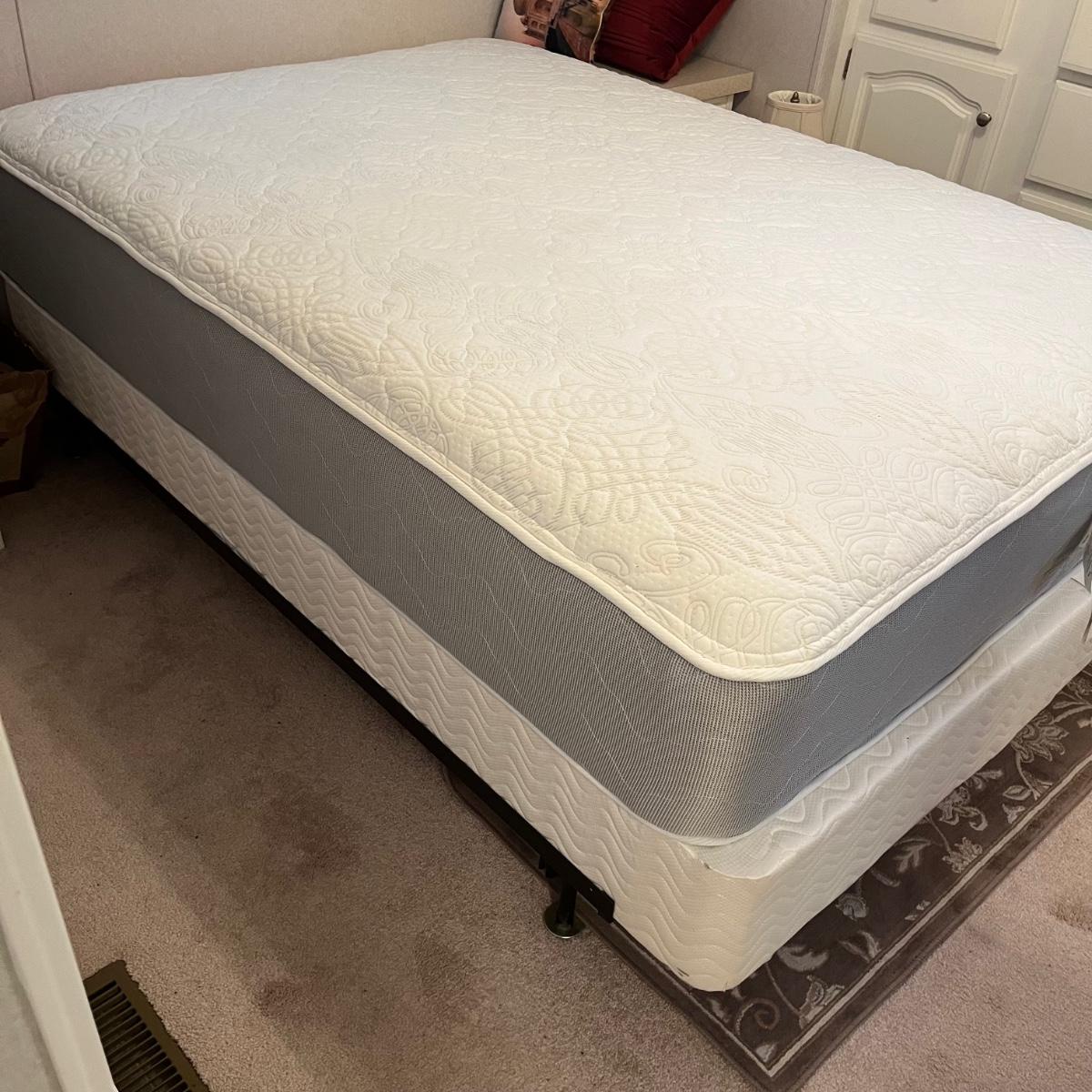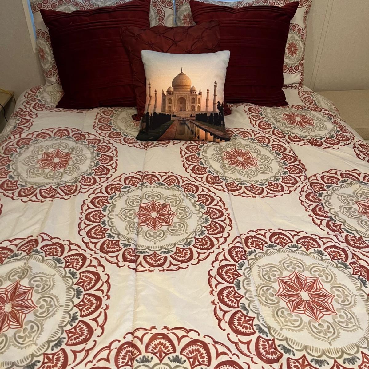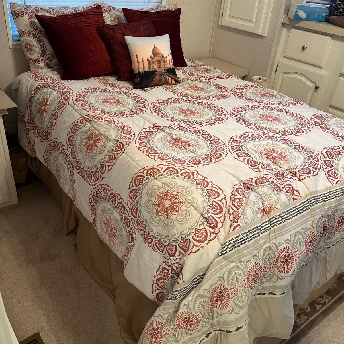 Lot includes a full size metal bed frame with comforter, mattress cover, bed skirt, two pillow cases and five accent pillows. Mattress and box spring is available to winning bidder, but not required to take.