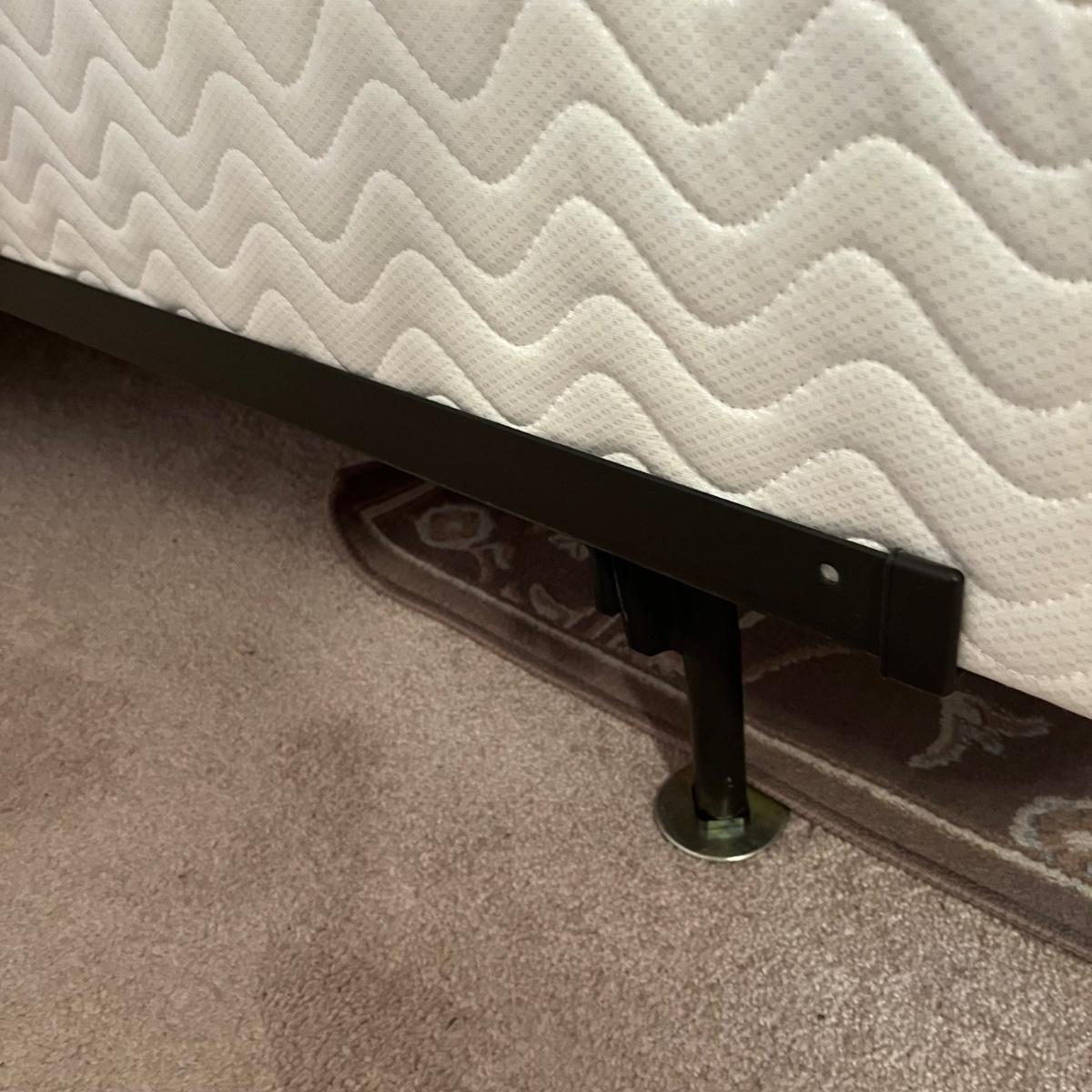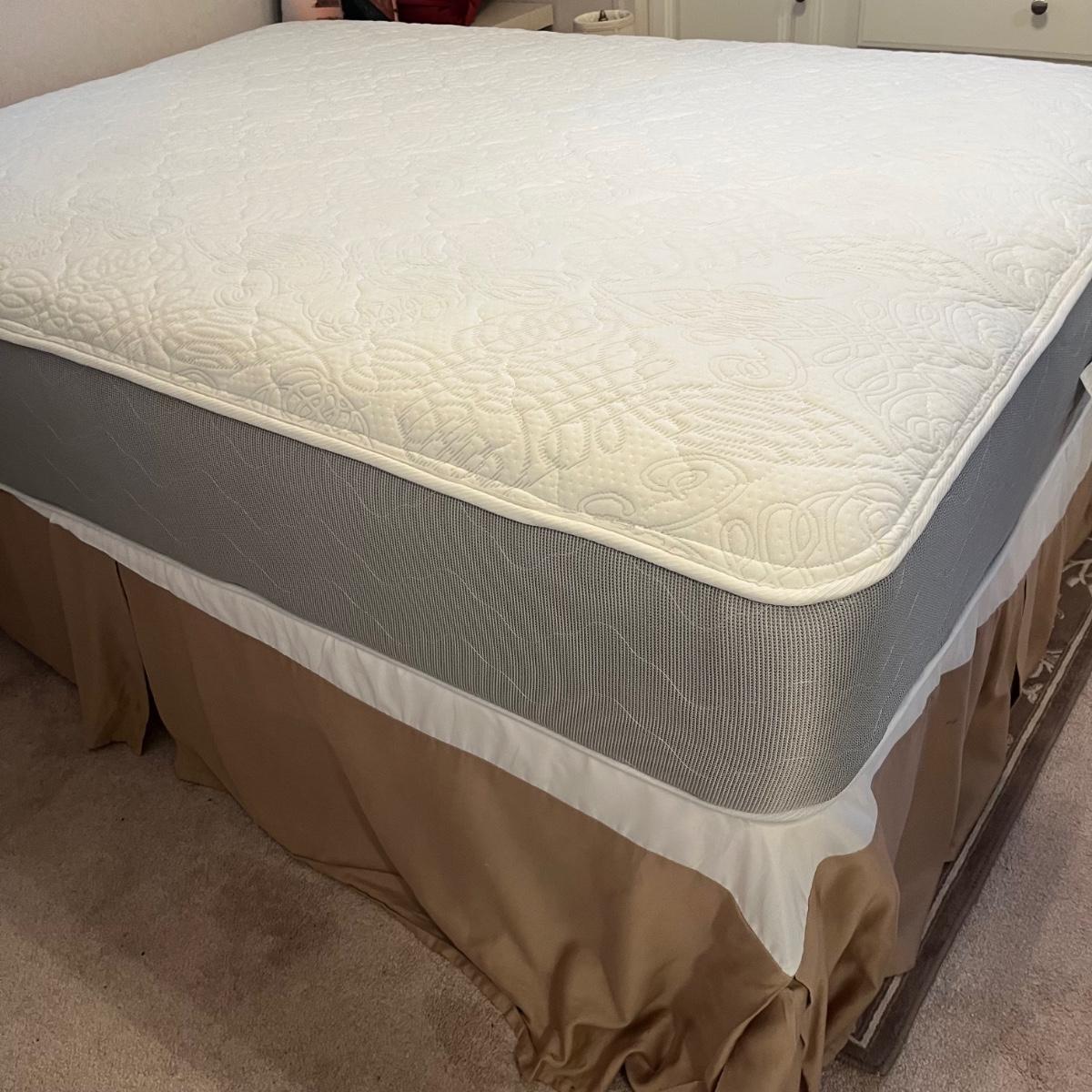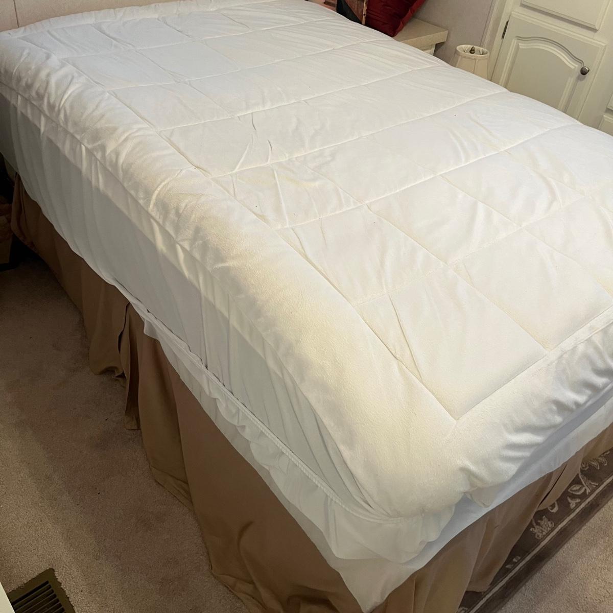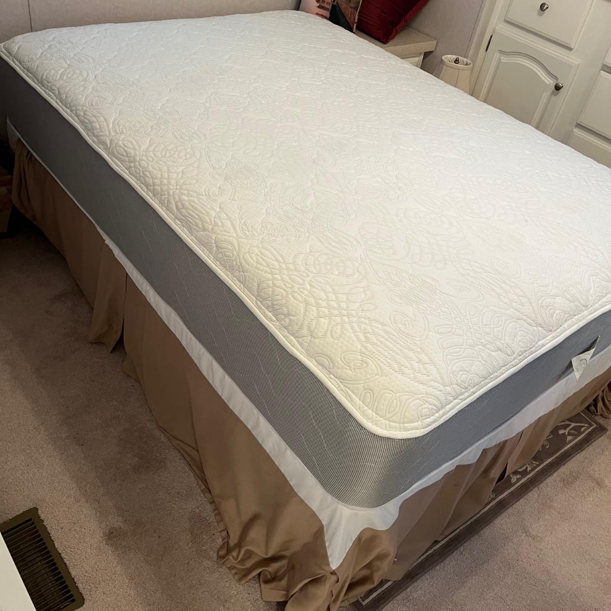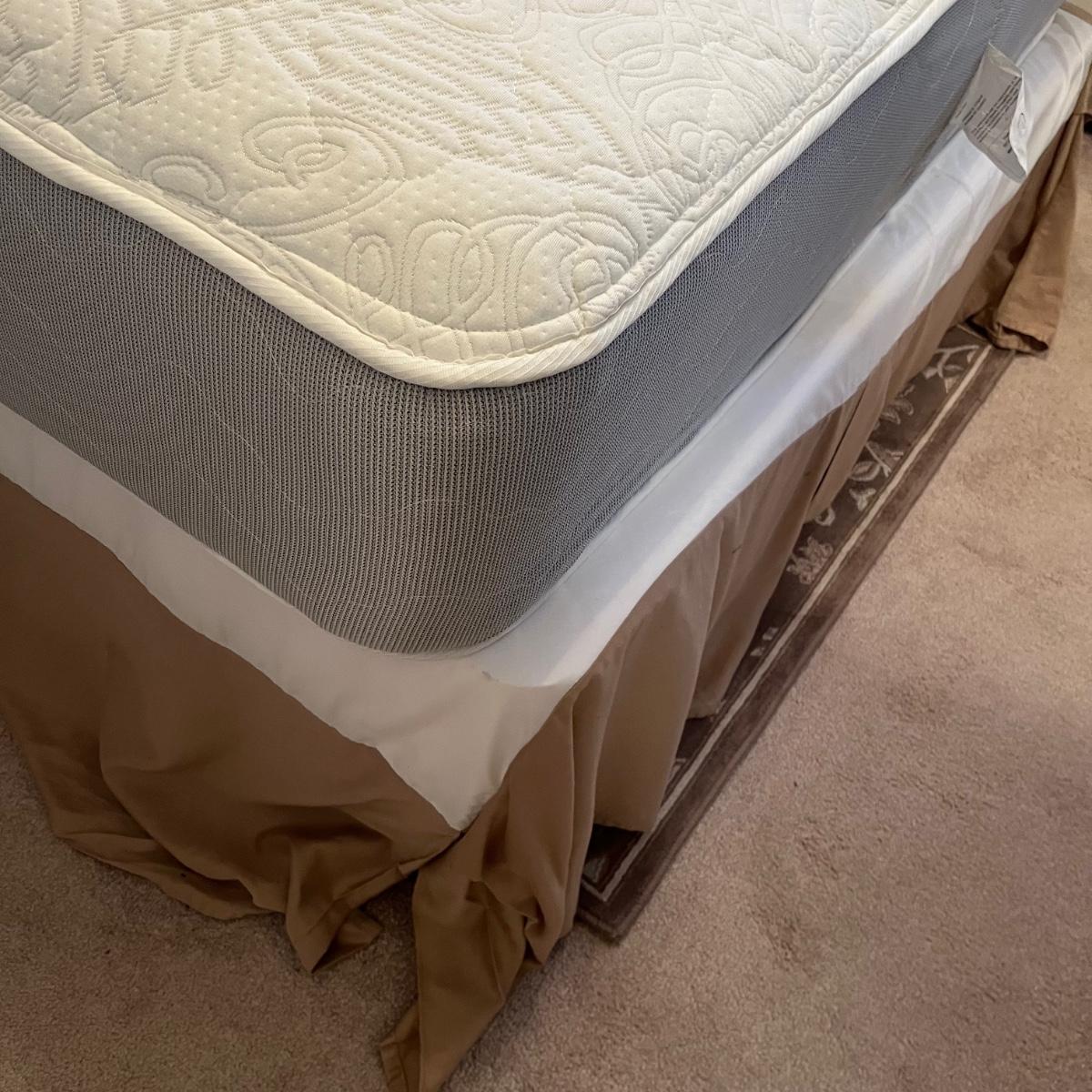 Lot includes a full size metal bed frame with comforter, mattress cover, bed skirt, two pillow cases and five accent pillows. Mattress and box spring is available to winning bidder, but not required to take.