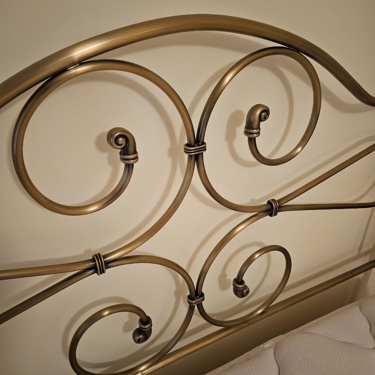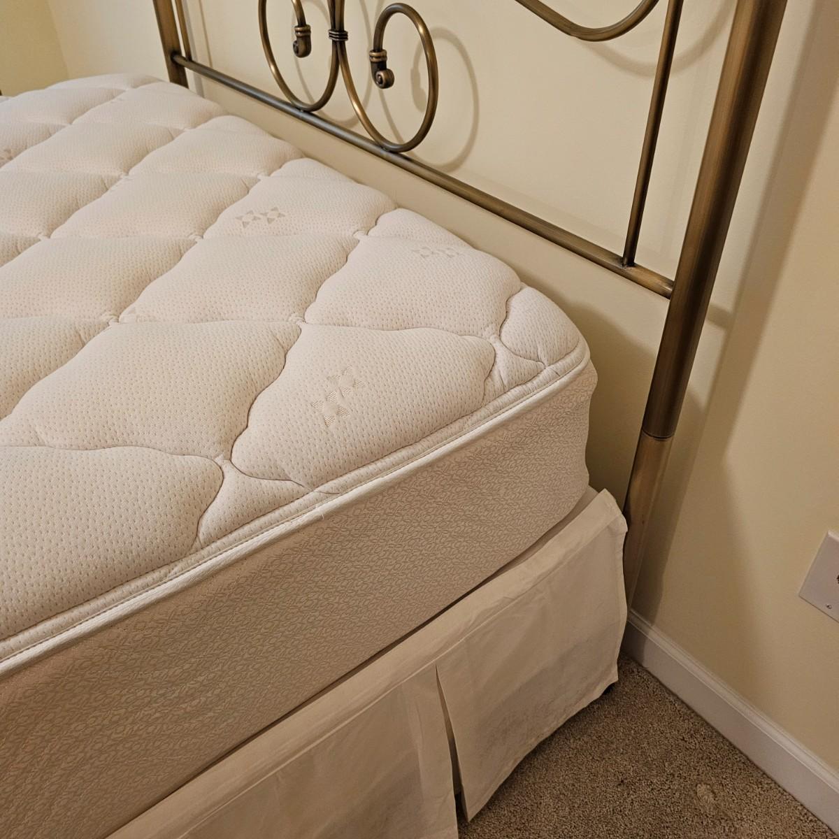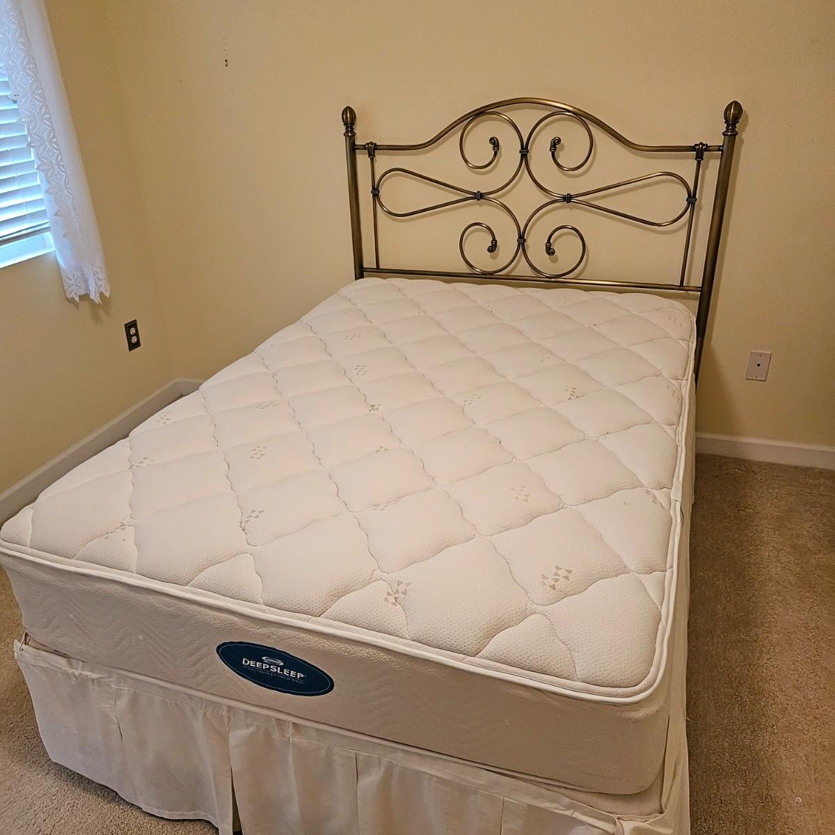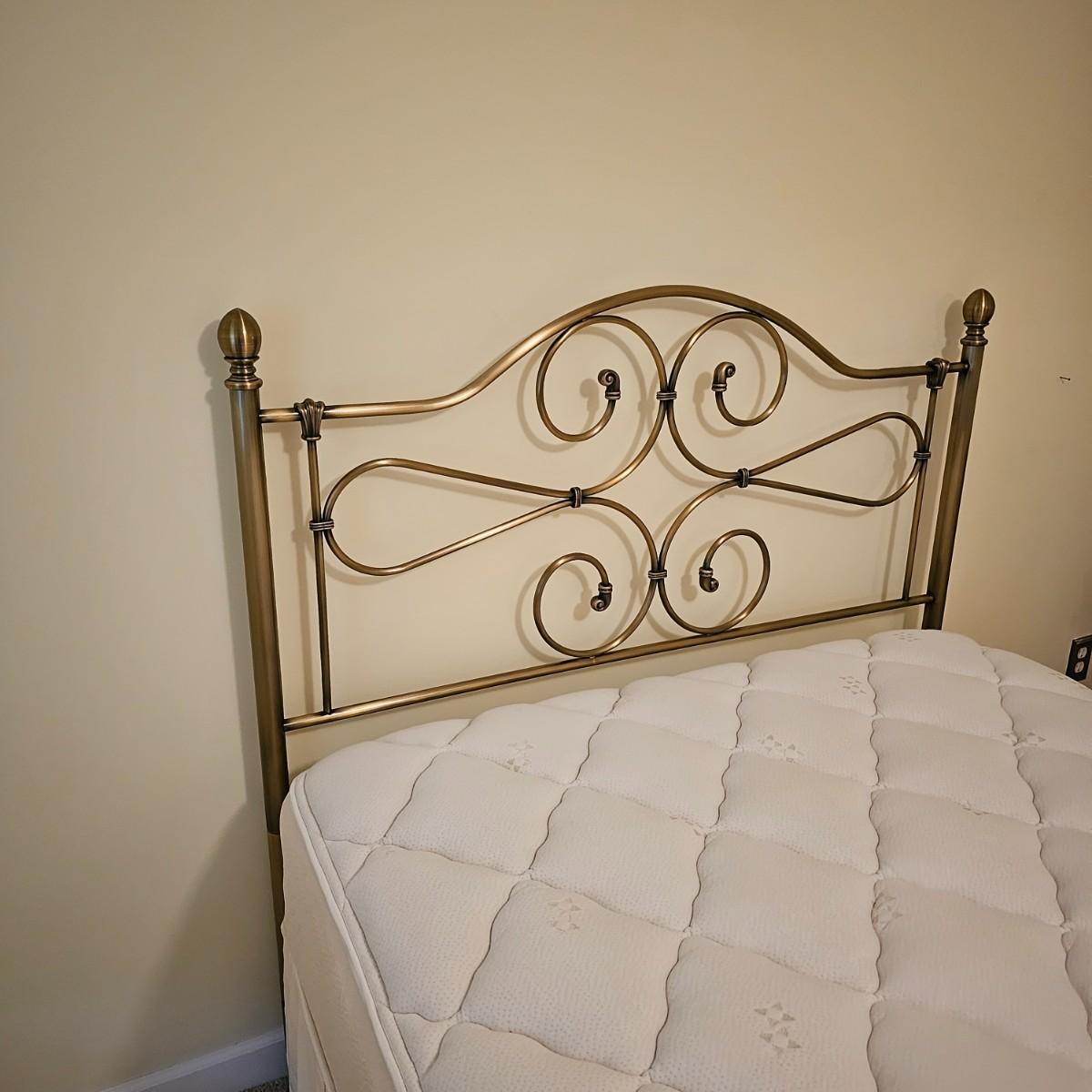 Full size metal bed frame with antique bronze finish. Headboard is steel with steel base frame. Entire bed measures 53" x 77" x 52"H. The mattress and box spring is available to the winning bidder if desired, but the winning bidder is not required to take it. Buyer is responsible for disassembling frame at pick-up. See photos for details. Local pickup only.