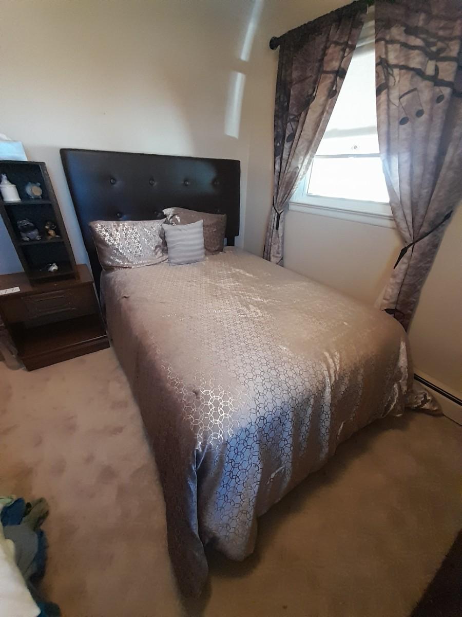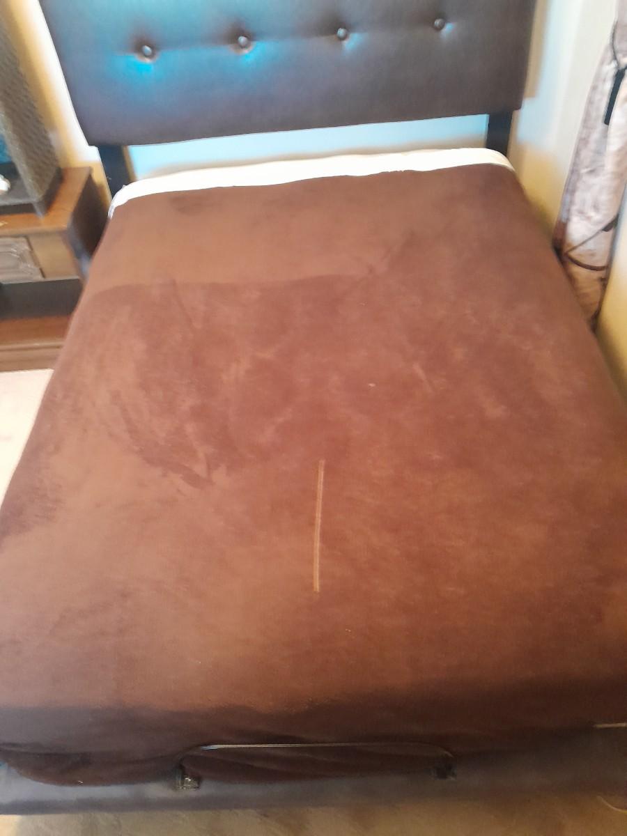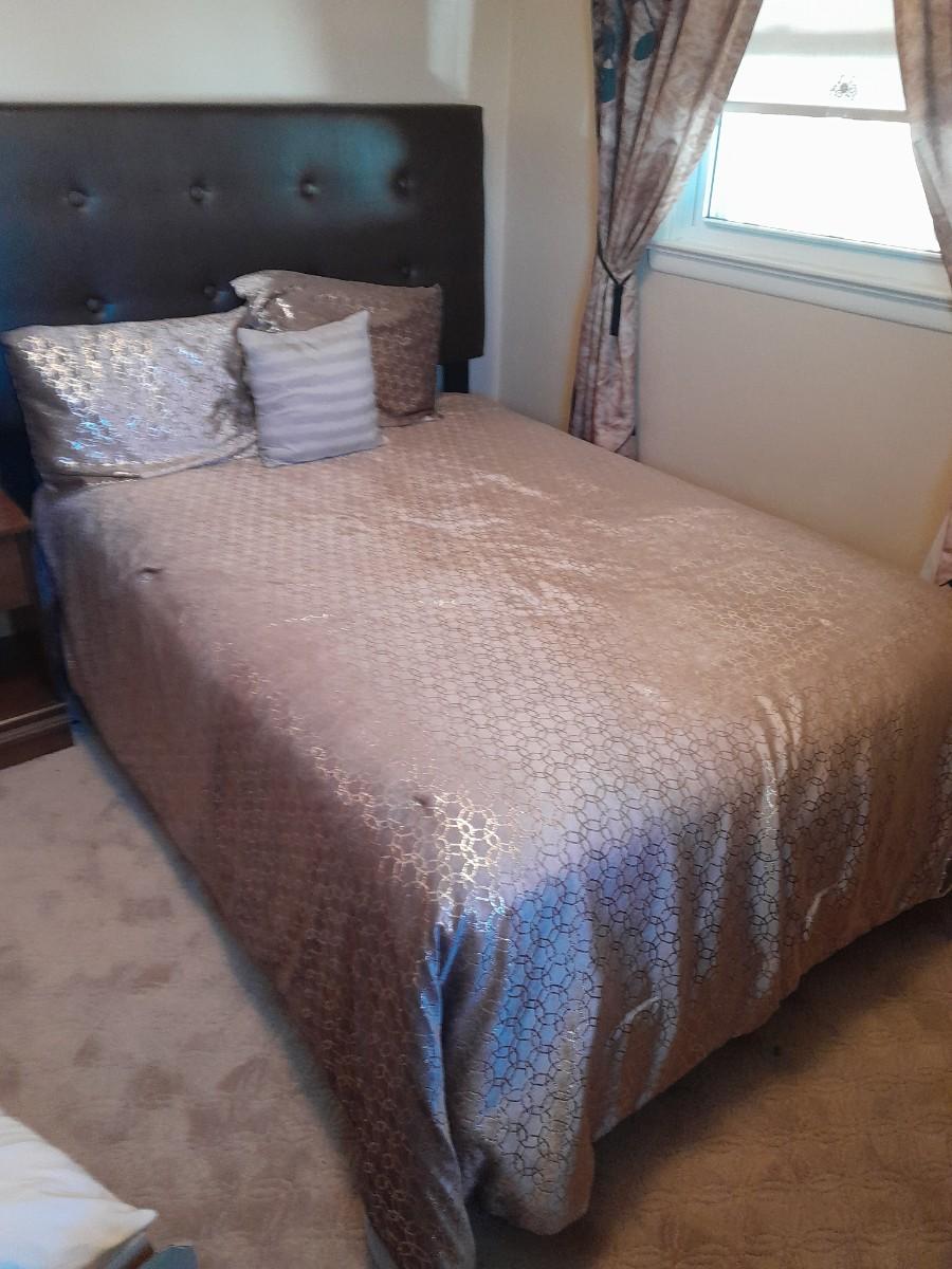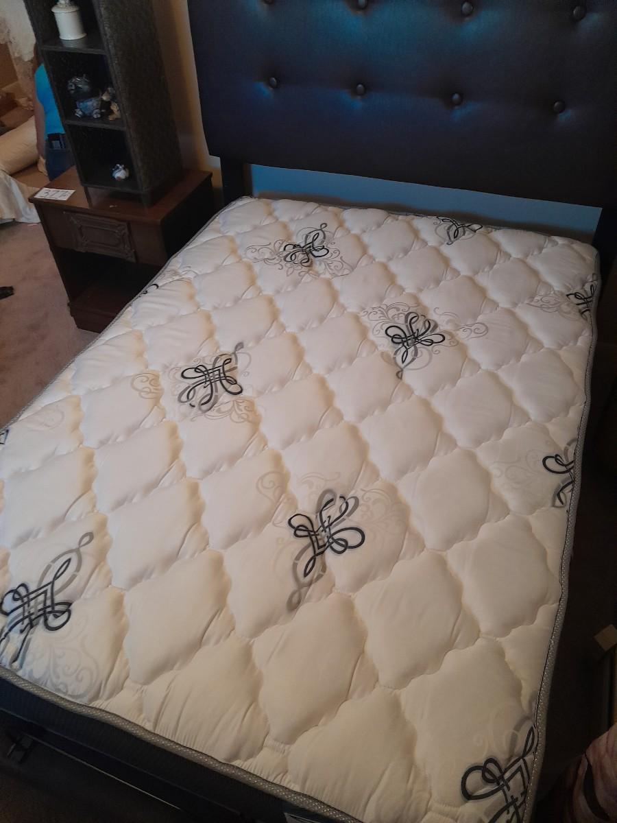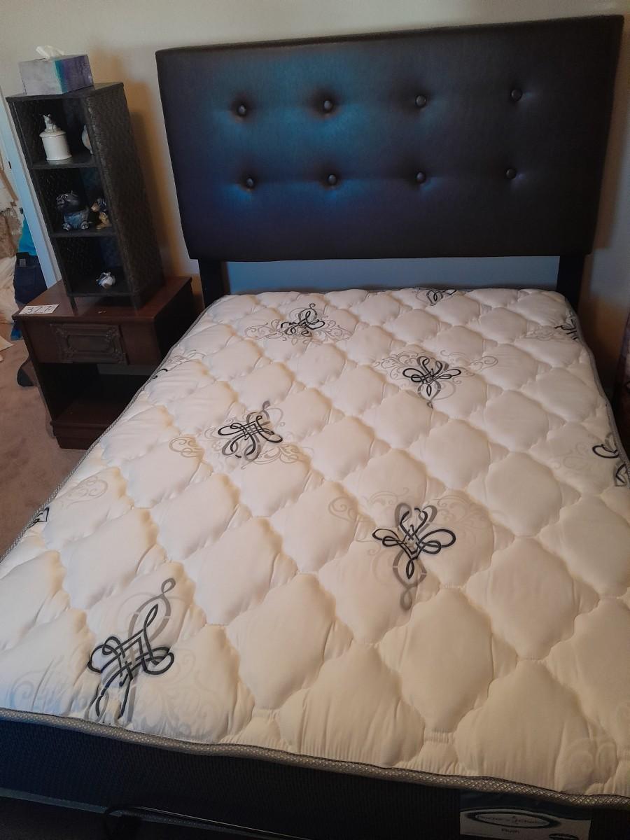 FULL SIZE BED, PLATFORM FRAME, TUFFTED HEADBOARD, NICE DOCTORS CHOICE MATTRESS WITH BEDDING