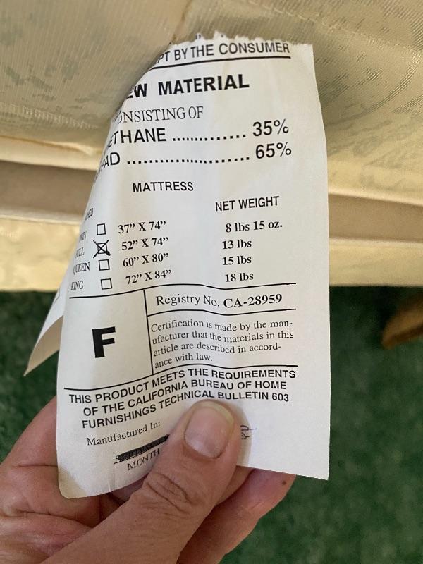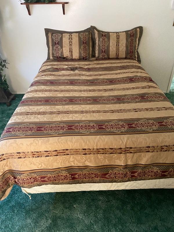 Full size bed. Mattress, box spring, and bedding shown. Looks in good condition, made in 2008.