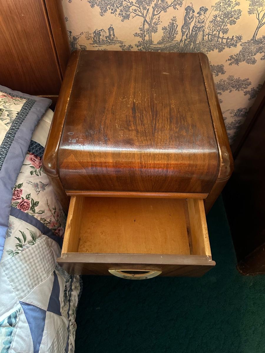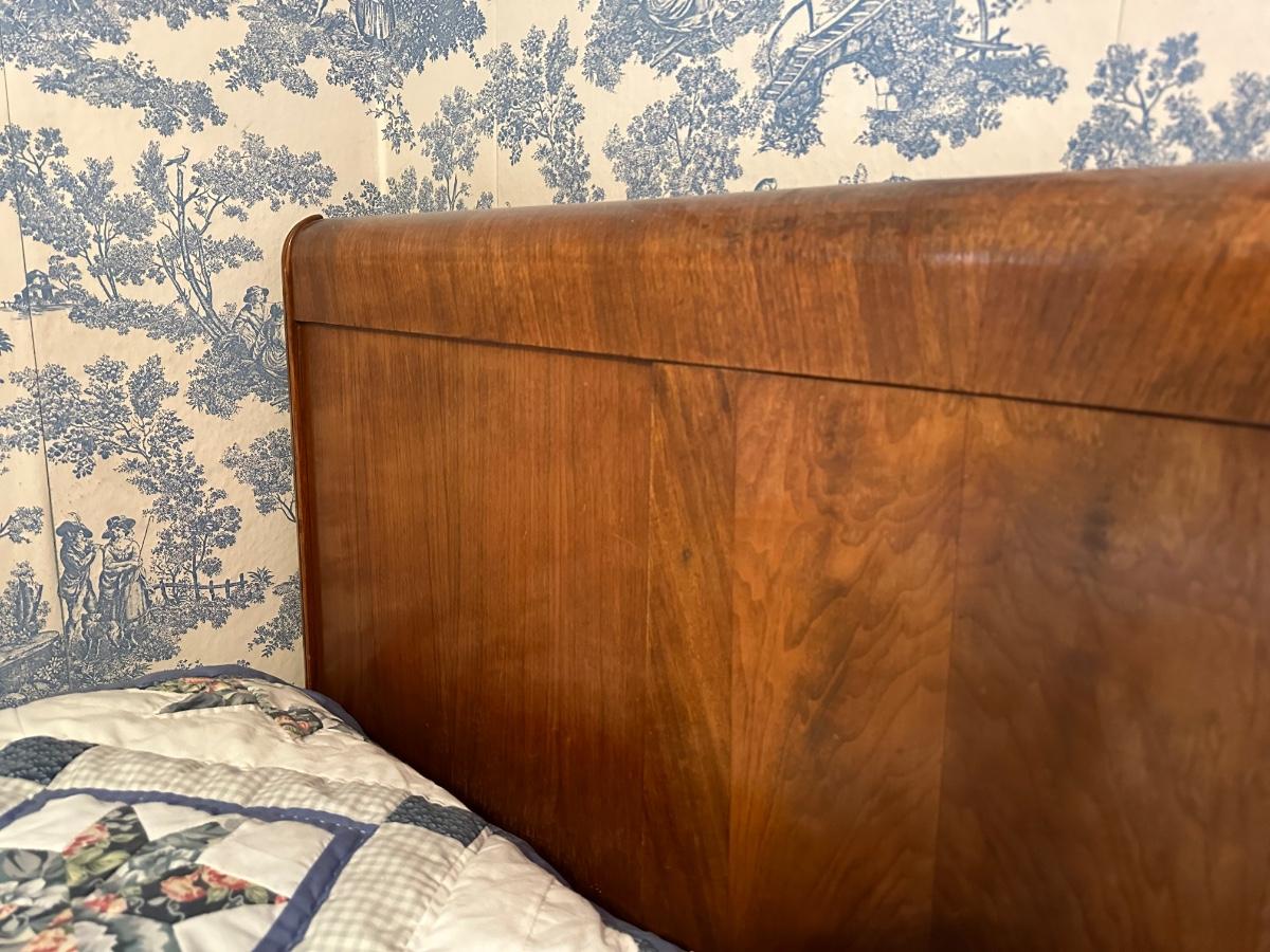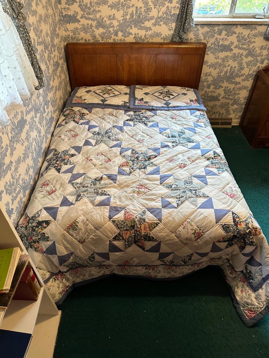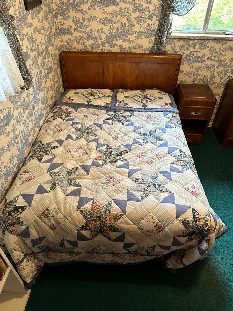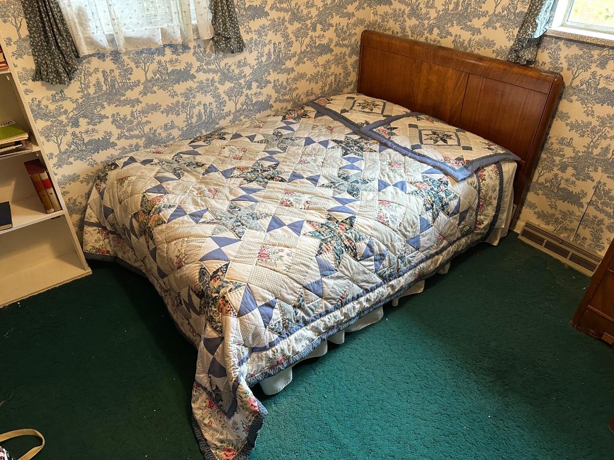 FULL SIZE BED WITH ANTIQUE HEADBOARD & MATCHING NIGHT STAND PLUS BEDSPREAD