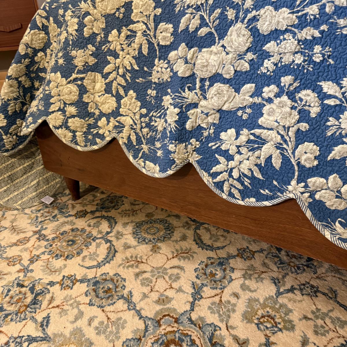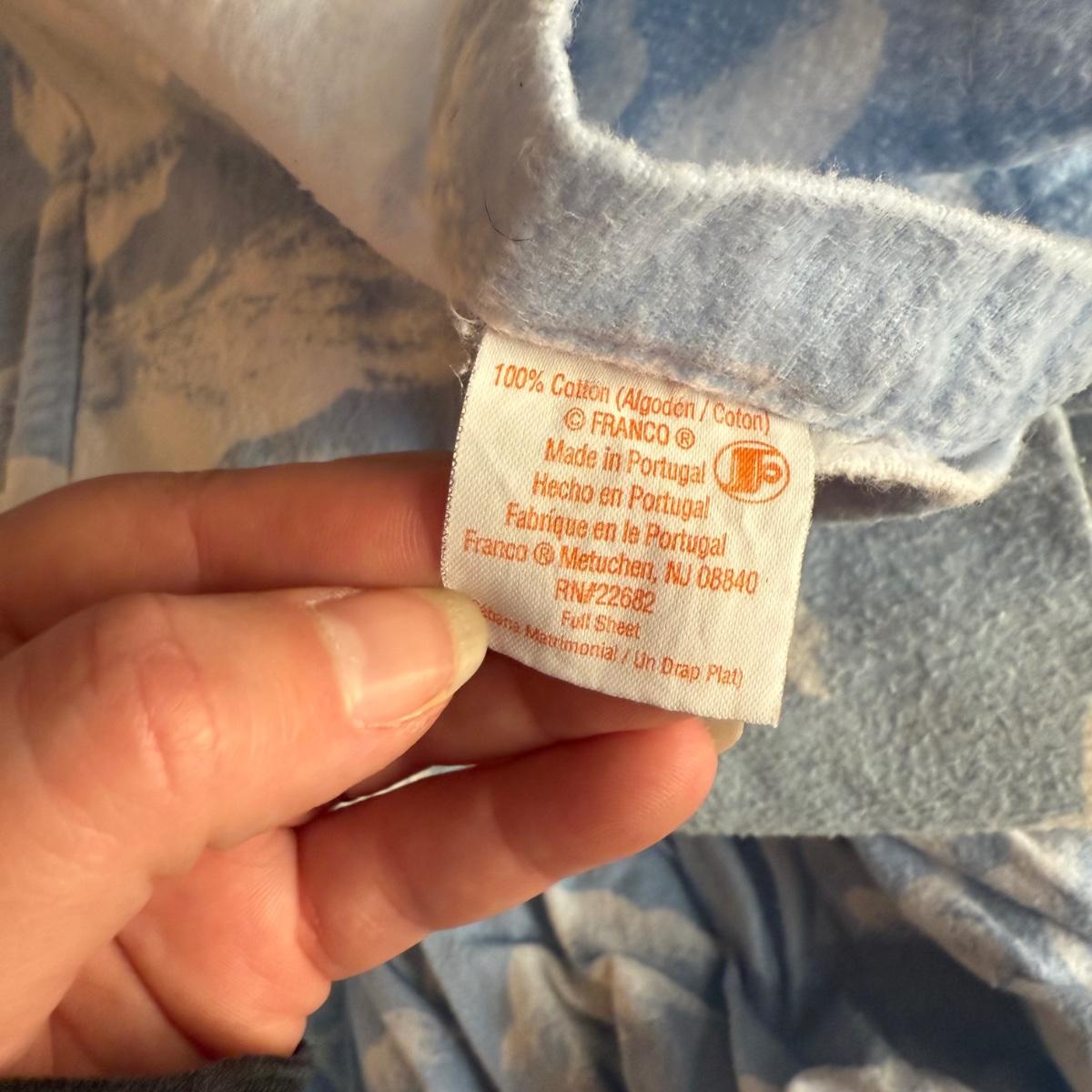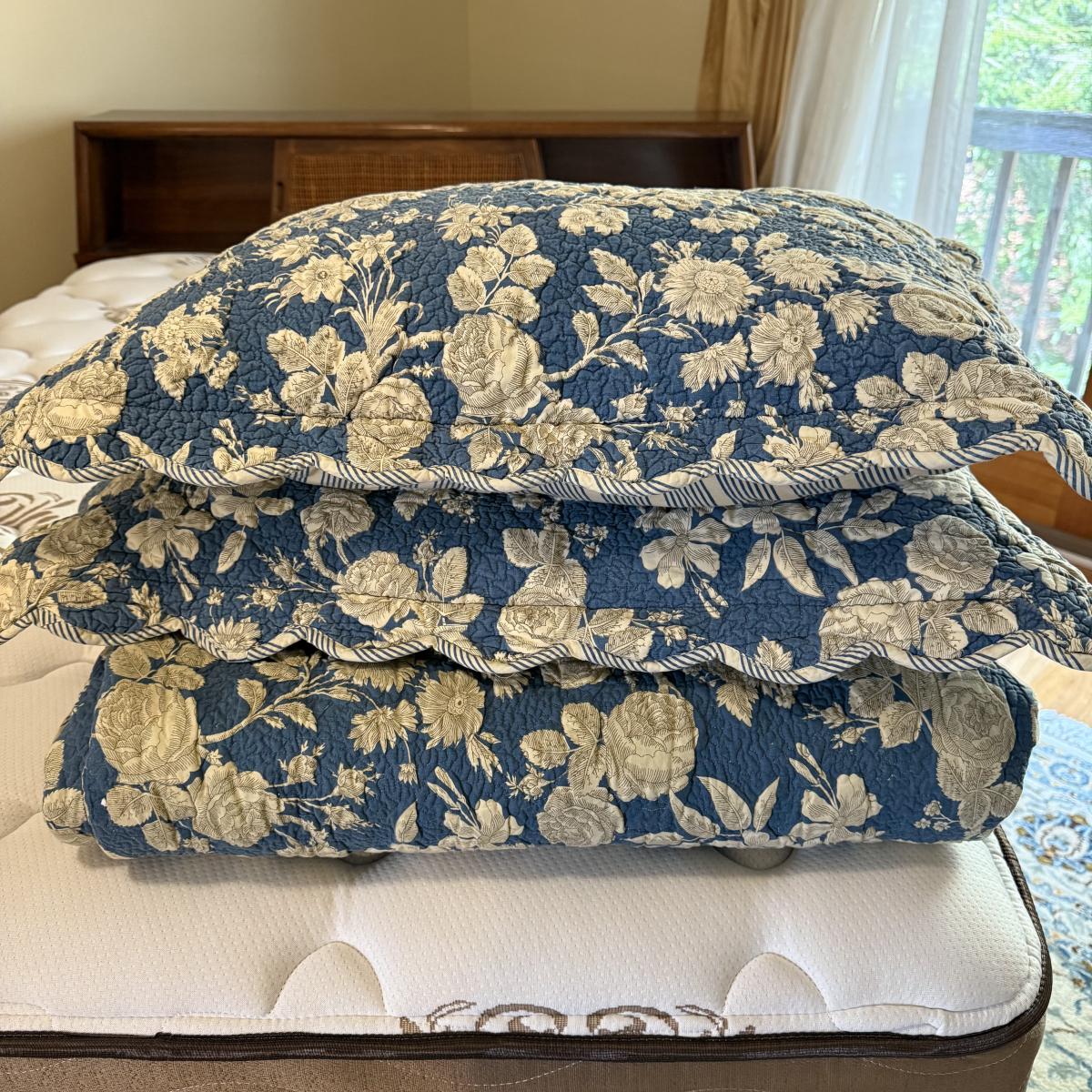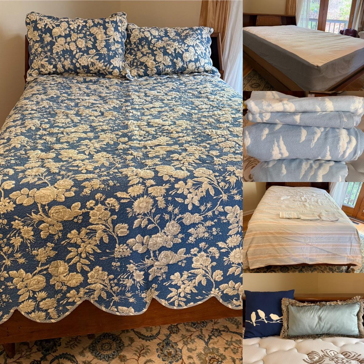 This lot contains several bedding items. First is a Garden Hill cotton, size Full, blue bed fitted sheet This sheet goes around the box spring and sits snug against it. Next is a set of Full sized- dreamy flannel cotton sheets; complete with fitted, top sheets and two pillow cases. Next we have a duvet set with three matching pillow shams. There is a small stain on the duvet, see pictures for details. Then we have a NIB jumbo comforter storage bag that measures 26” x 40”. Also included is two accent pillows. One is navy with three little birds and measures 14” x 14” and one is a lovely shimmery turquoise with frill edges that measures 22” x 7.5”. Last is a stunning full sized blue floral quilt set with scalloped edges made from cotton. This set includes the quilt, two pillows and two matching pillow shams. Bed and rug not included! Shipping available. Shipping can be costly. We suggest contacting our preferred local shipping provider, Postage Express, with dimensions and getting an estimate before bidding: (828) 255-9250 or shipping@postageexpressnc.com.