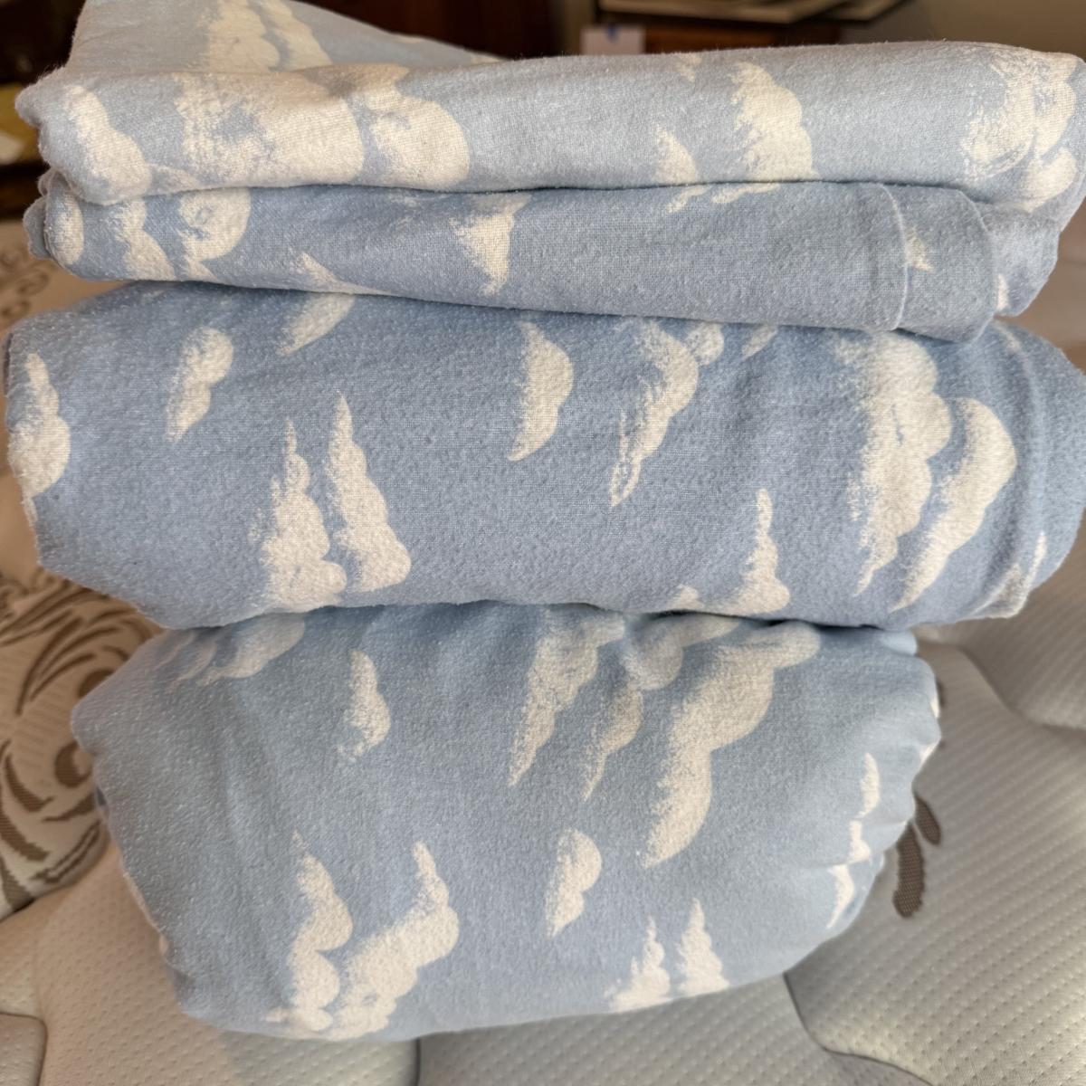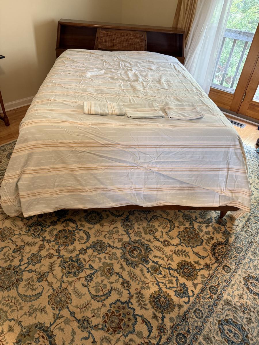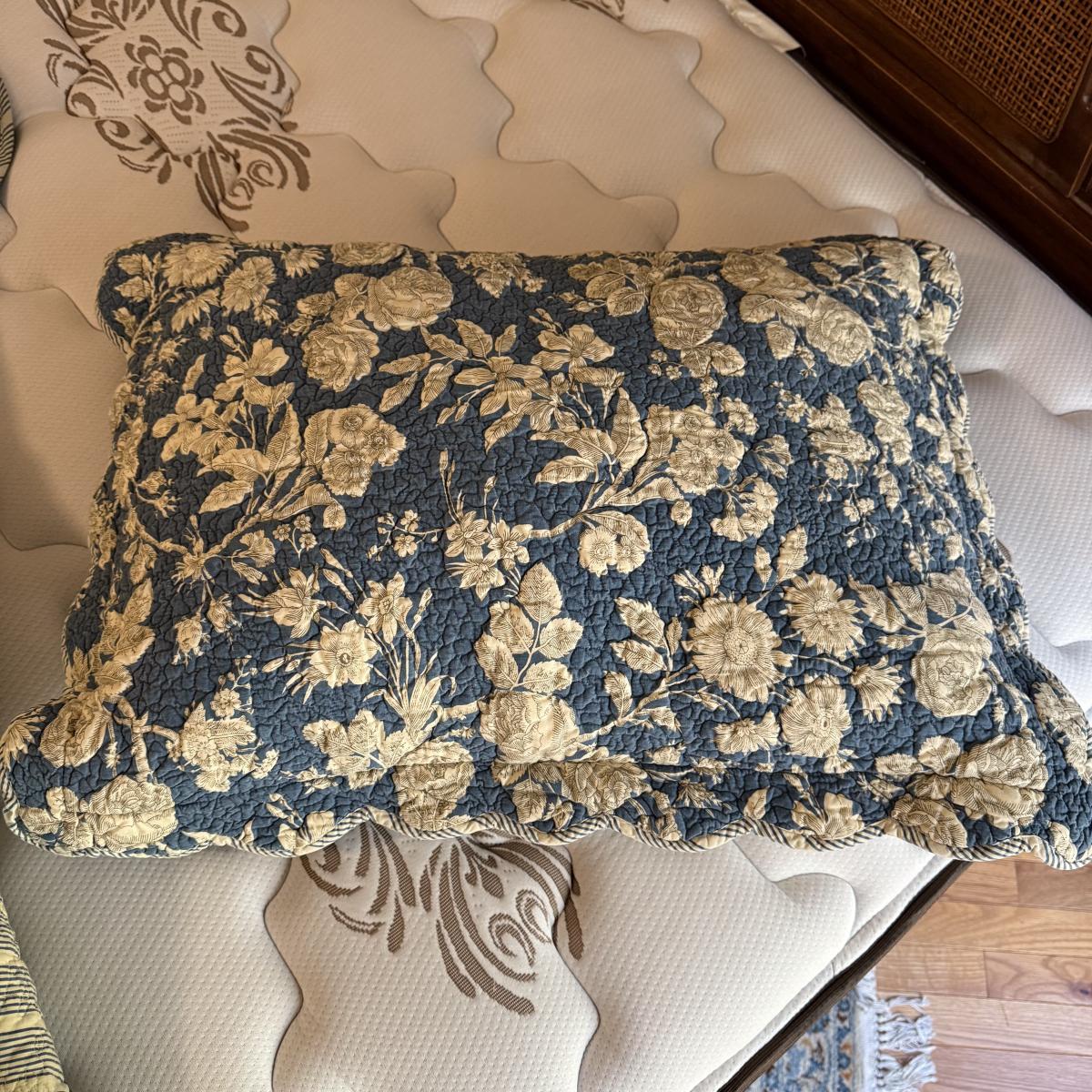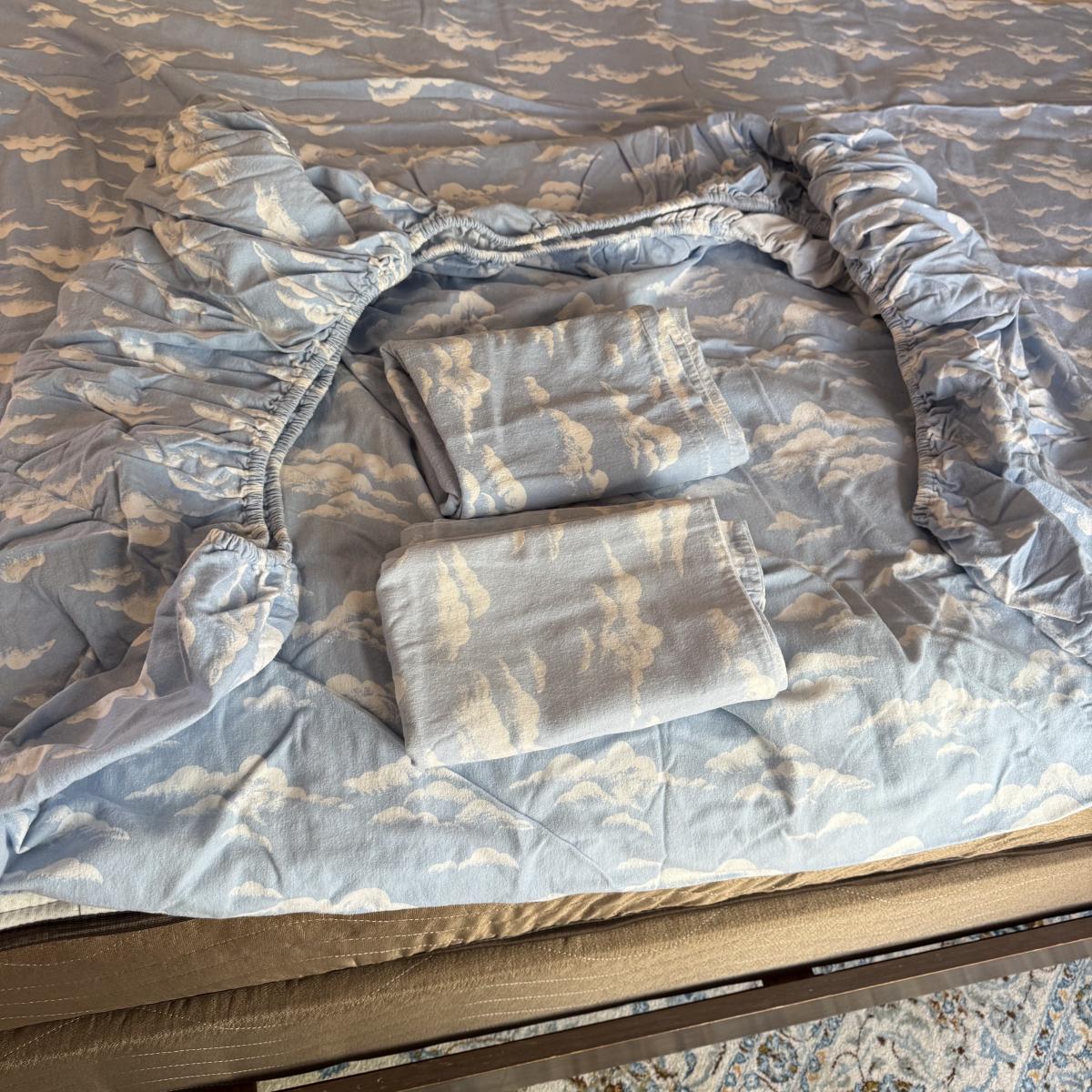 This lot contains several bedding items. First is a Garden Hill cotton, size Full, blue bed fitted sheet This sheet goes around the box spring and sits snug against it. Next is a set of Full sized- dreamy flannel cotton sheets; complete with fitted, top sheets and two pillow cases. Next we have a duvet set with three matching pillow shams. There is a small stain on the duvet, see pictures for details. Then we have a NIB jumbo comforter storage bag that measures 26” x 40”. Also included is two accent pillows. One is navy with three little birds and measures 14” x 14” and one is a lovely shimmery turquoise with frill edges that measures 22” x 7.5”. Last is a stunning full sized blue floral quilt set with scalloped edges made from cotton. This set includes the quilt, two pillows and two matching pillow shams. Bed and rug not included! Shipping available. Shipping can be costly. We suggest contacting our preferred local shipping provider, Postage Express, with dimensions and getting an estimate before bidding: (828) 255-9250 or shipping@postageexpressnc.com.