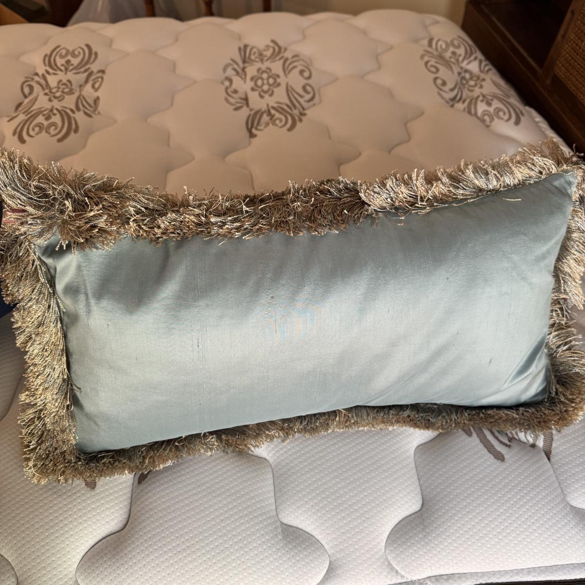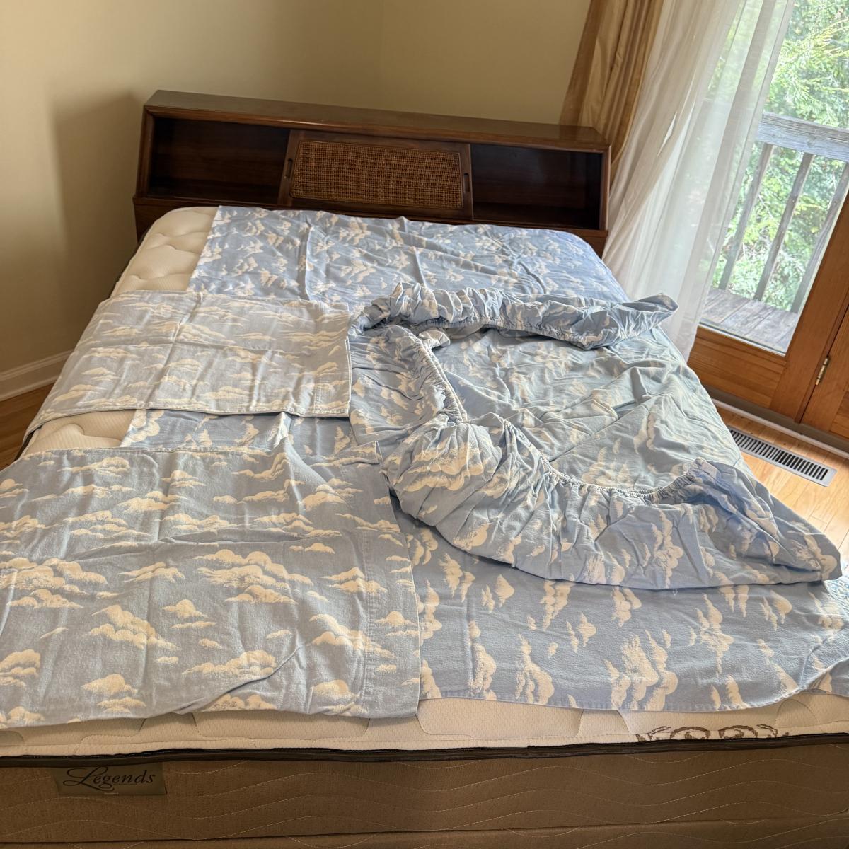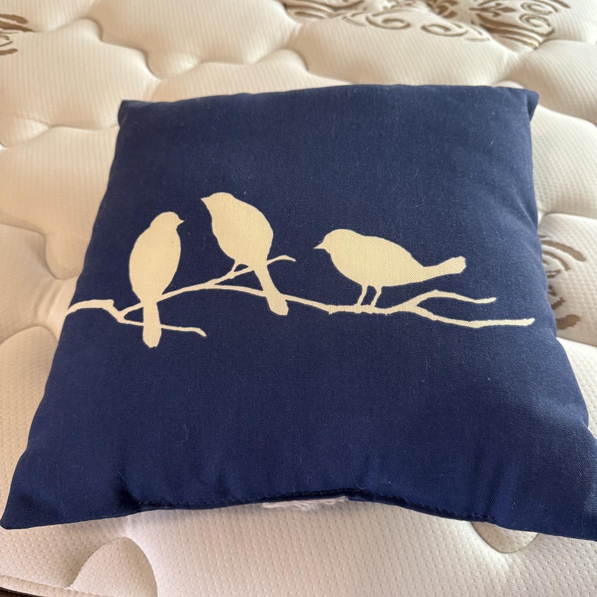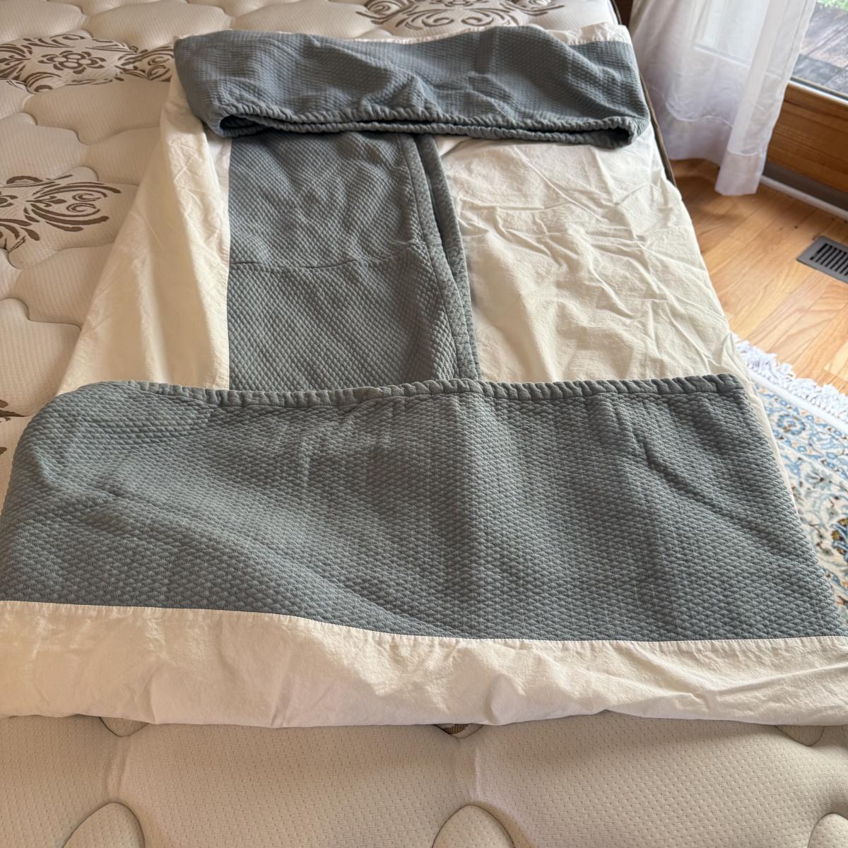 This lot contains several bedding items. First is a Garden Hill cotton, size Full, blue bed fitted sheet This sheet goes around the box spring and sits snug against it. Next is a set of Full sized- dreamy flannel cotton sheets; complete with fitted, top sheets and two pillow cases. Next we have a duvet set with three matching pillow shams. There is a small stain on the duvet, see pictures for details. Then we have a NIB jumbo comforter storage bag that measures 26” x 40”. Also included is two accent pillows. One is navy with three little birds and measures 14” x 14” and one is a lovely shimmery turquoise with frill edges that measures 22” x 7.5”. Last is a stunning full sized blue floral quilt set with scalloped edges made from cotton. This set includes the quilt, two pillows and two matching pillow shams. Bed and rug not included! Shipping available. Shipping can be costly. We suggest contacting our preferred local shipping provider, Postage Express, with dimensions and getting an estimate before bidding: (828) 255-9250 or shipping@postageexpressnc.com.