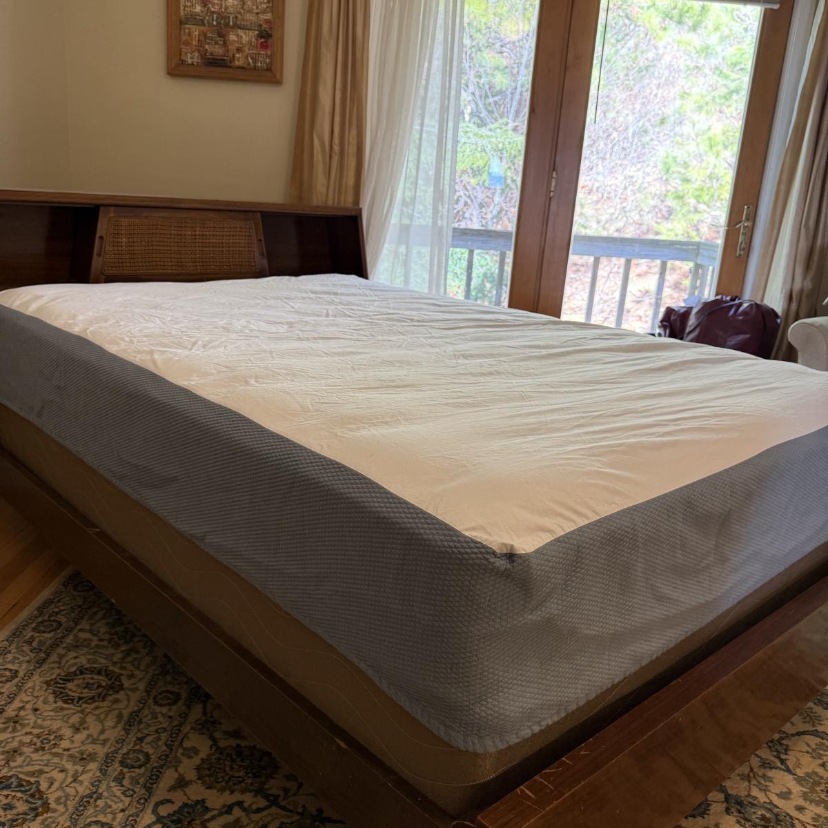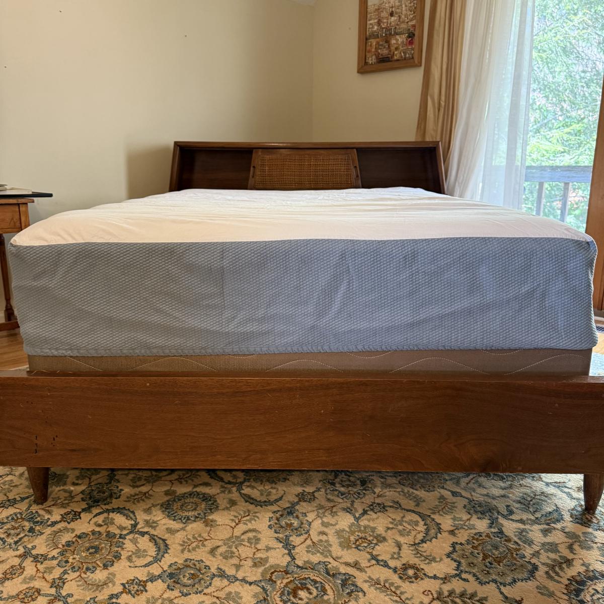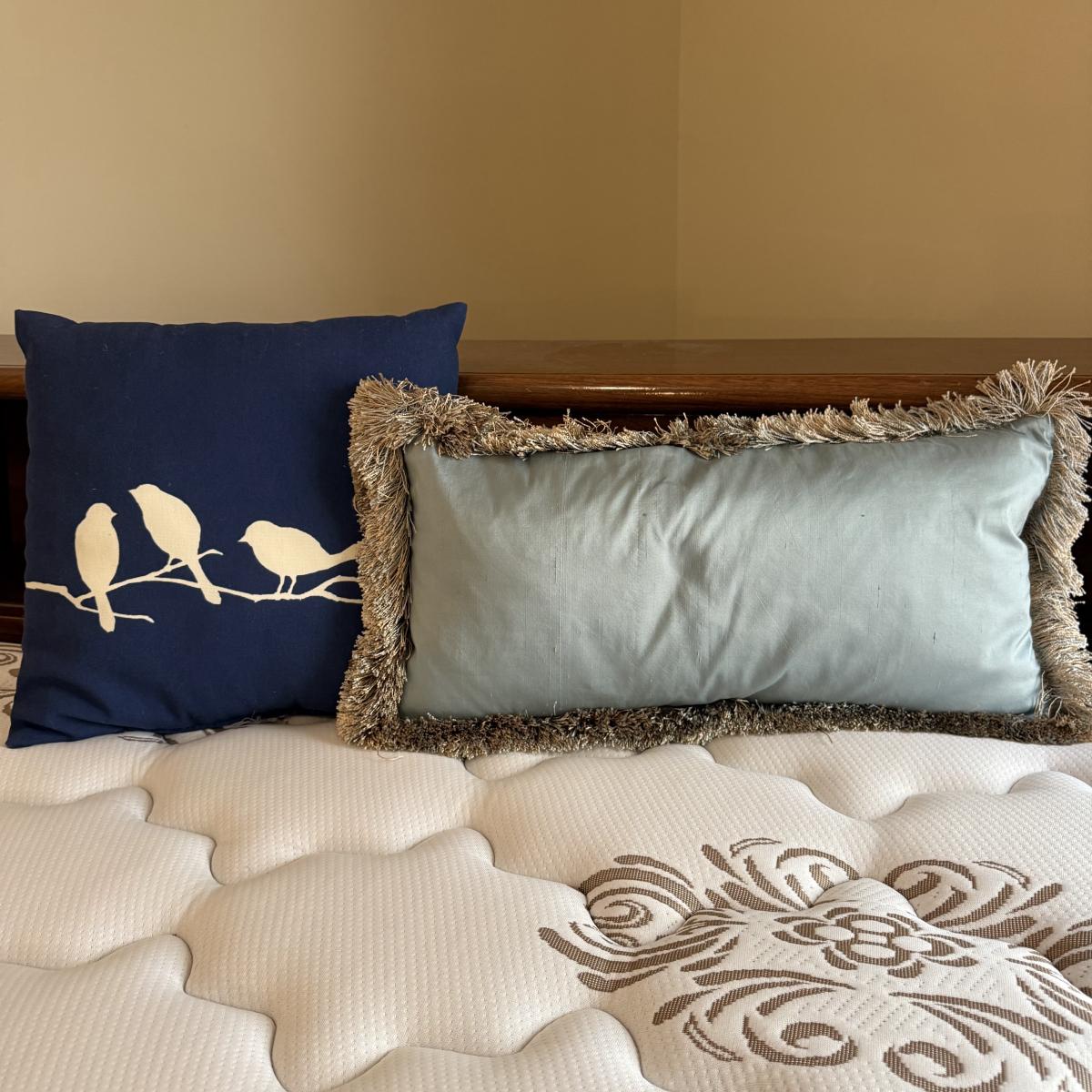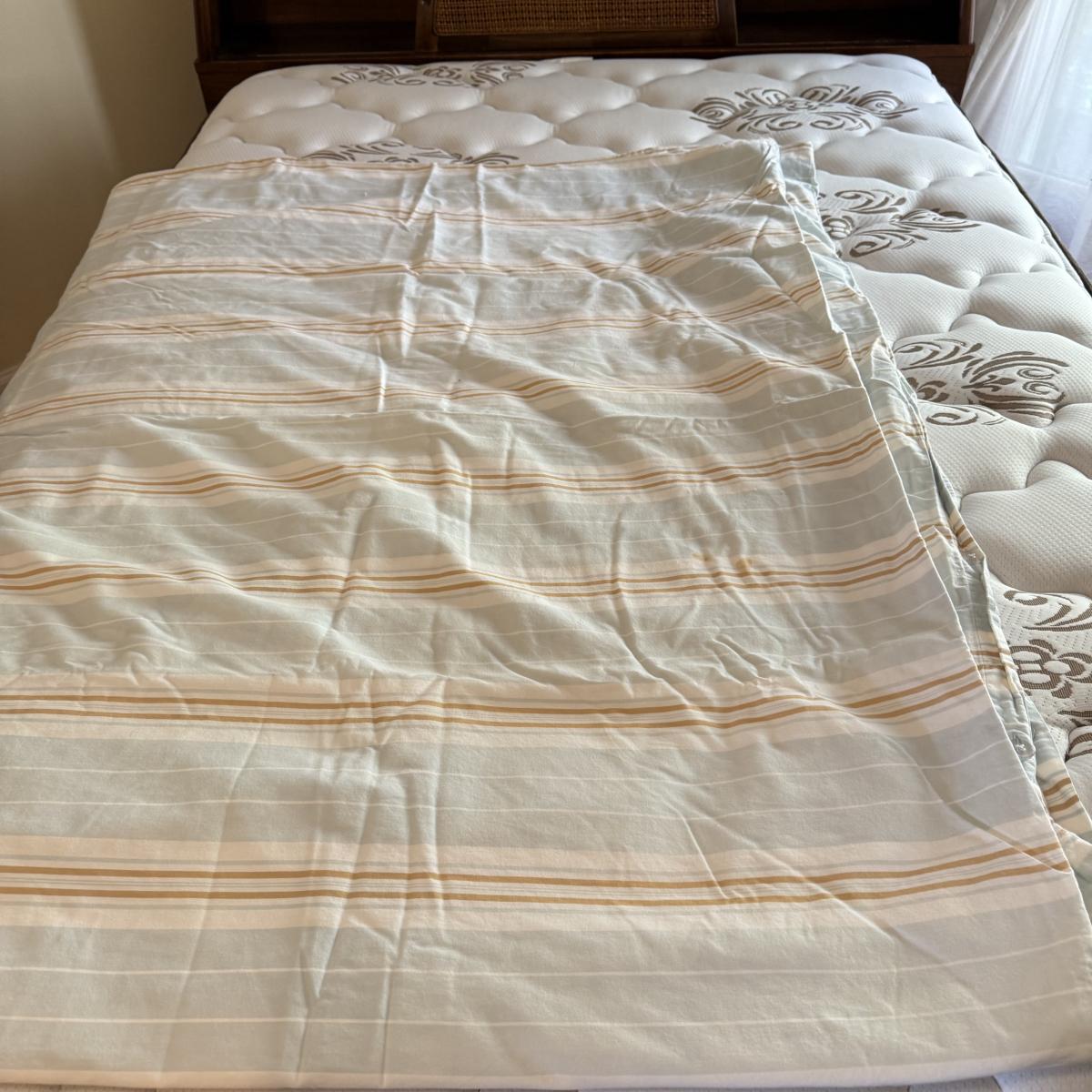 This lot contains several bedding items. First is a Garden Hill cotton, size Full, blue bed fitted sheet This sheet goes around the box spring and sits snug against it. Next is a set of Full sized- dreamy flannel cotton sheets; complete with fitted, top sheets and two pillow cases. Next we have a duvet set with three matching pillow shams. There is a small stain on the duvet, see pictures for details. Then we have a NIB jumbo comforter storage bag that measures 26” x 40”. Also included is two accent pillows. One is navy with three little birds and measures 14” x 14” and one is a lovely shimmery turquoise with frill edges that measures 22” x 7.5”. Last is a stunning full sized blue floral quilt set with scalloped edges made from cotton. This set includes the quilt, two pillows and two matching pillow shams. Bed and rug not included! Shipping available. Shipping can be costly. We suggest contacting our preferred local shipping provider, Postage Express, with dimensions and getting an estimate before bidding: (828) 255-9250 or shipping@postageexpressnc.com.