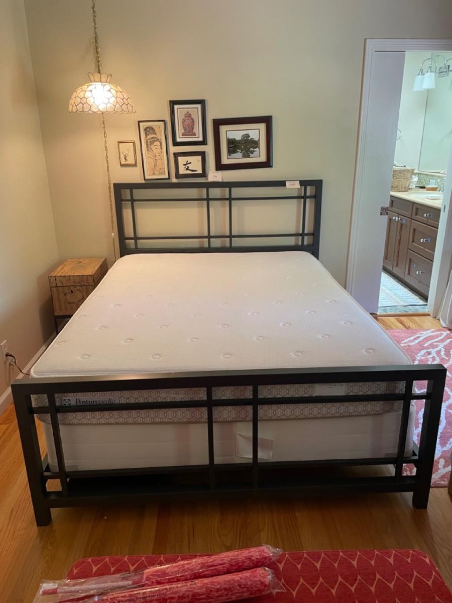 Very solid nice minimalist metal frame.Firm, sealy mattress