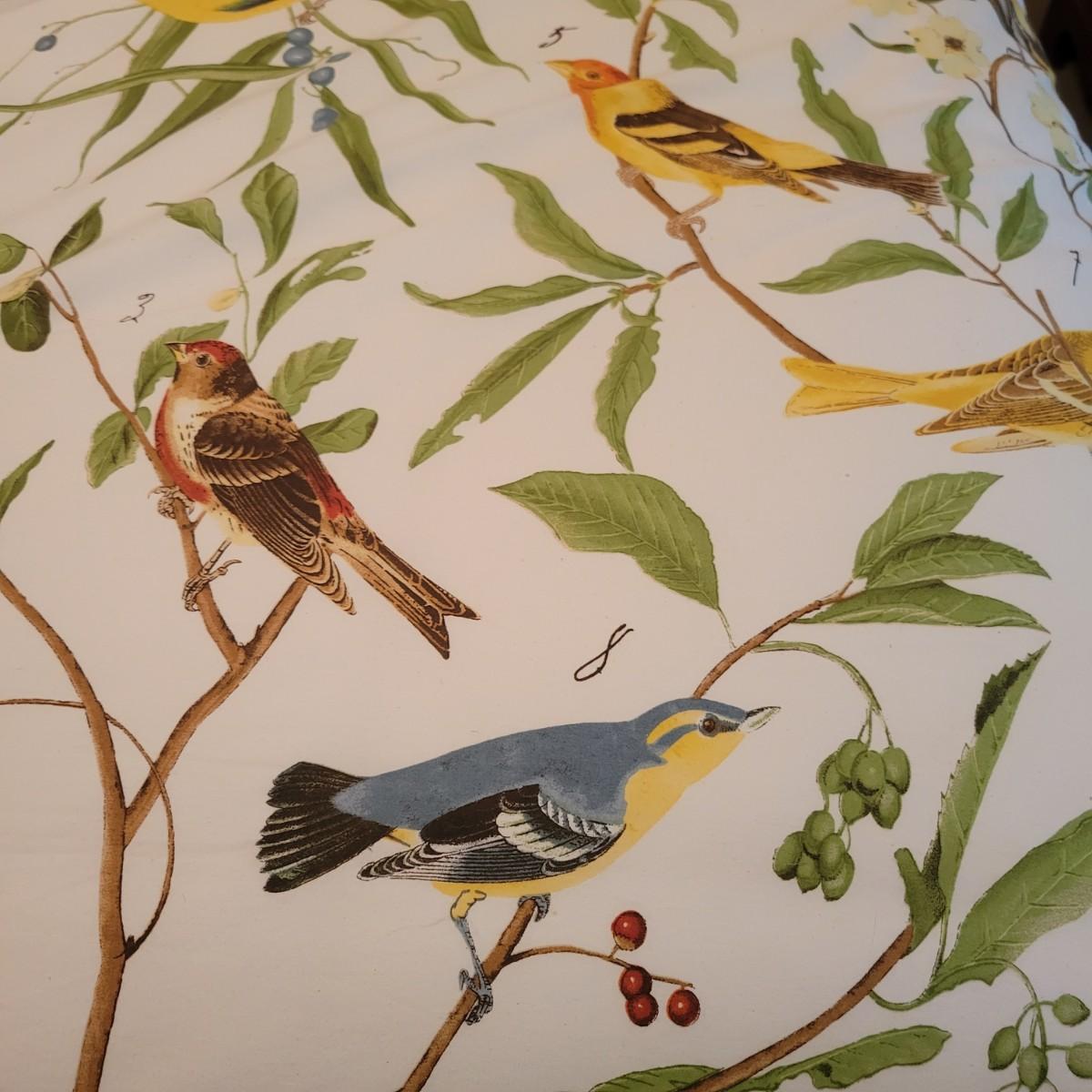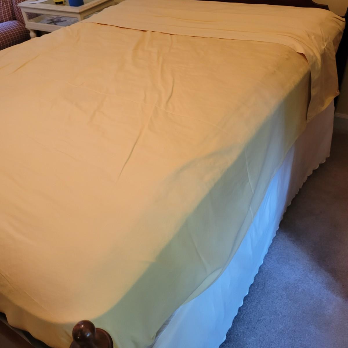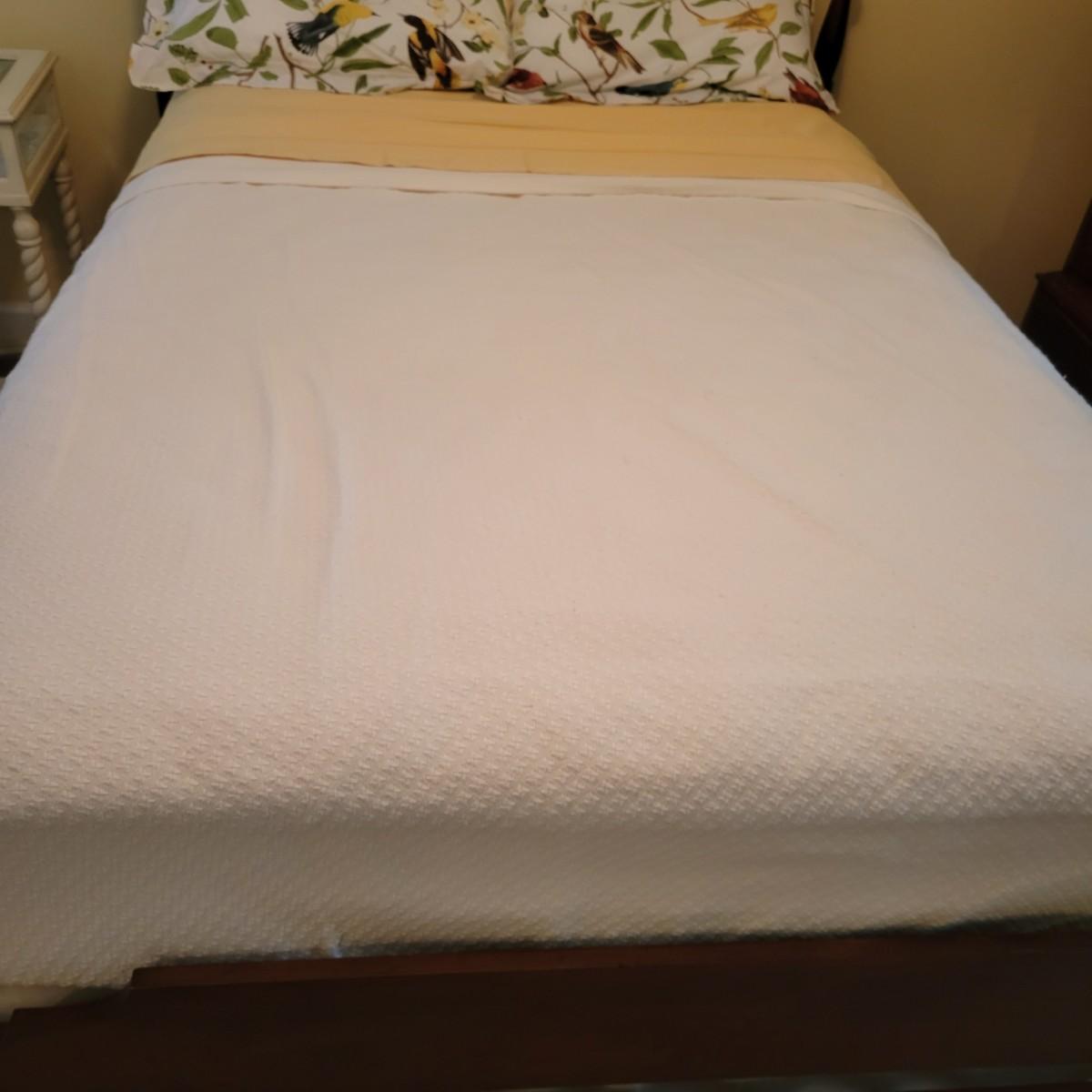 A set of full sized bedding that includes a comforter with matching shams, a cotton blanket, sheets and bed skirt. All items are 100% cotton from a variety of manufacturers. Shipping available. Shipping can be costly. We suggest contacting our preferred local shipping provider, Postage Express, with dimensions and getting an estimate before bidding: (828) 670-5501 or postageexpress@yahoo.com.