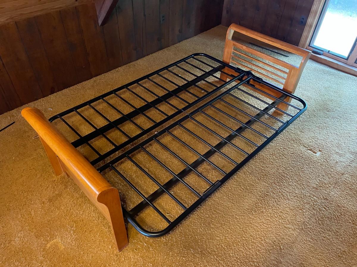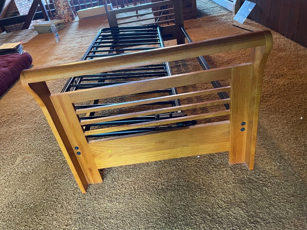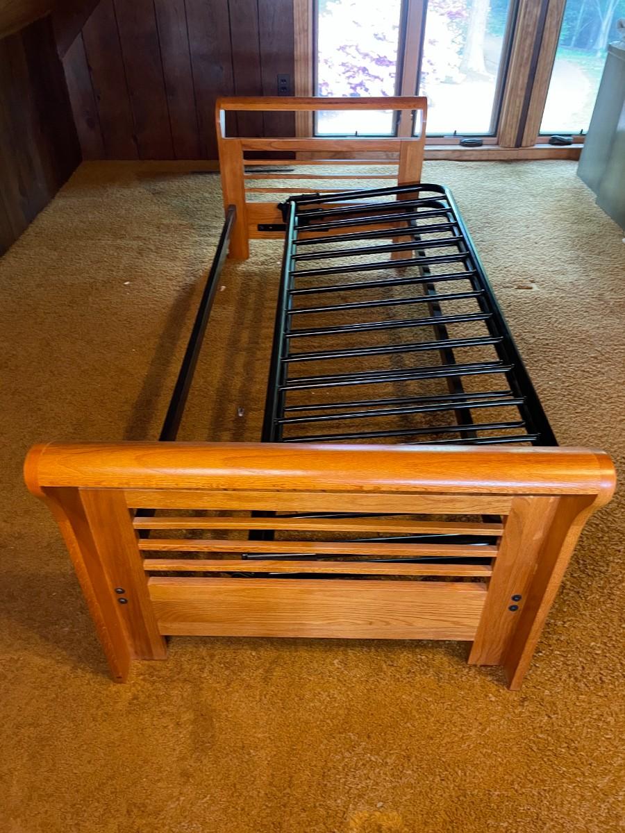 The wood and metal day bed is in excellent condition. Headboard and Footboard: 84L x 33w x 25 1/2h. Mattress area when opened: 74L x 54W x 11h.
