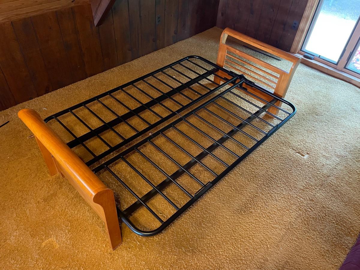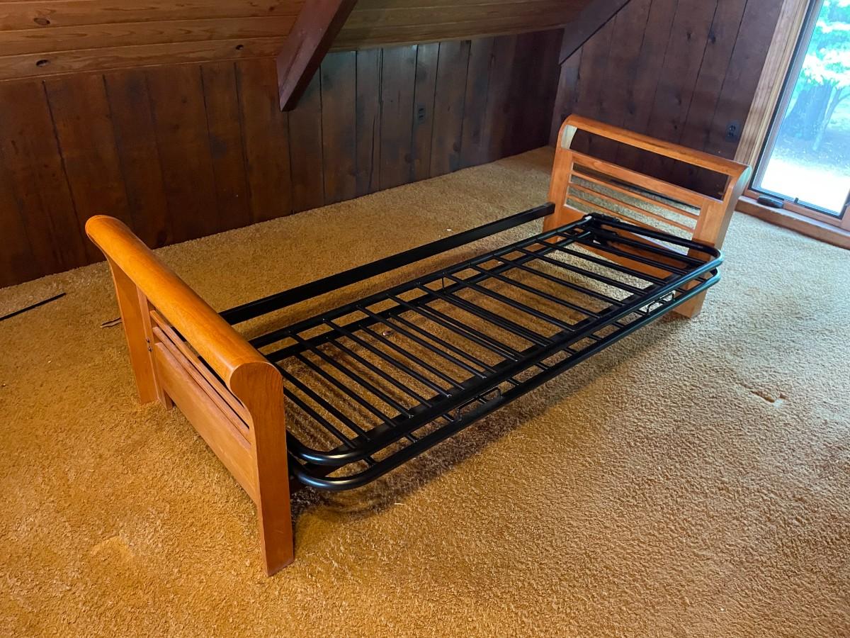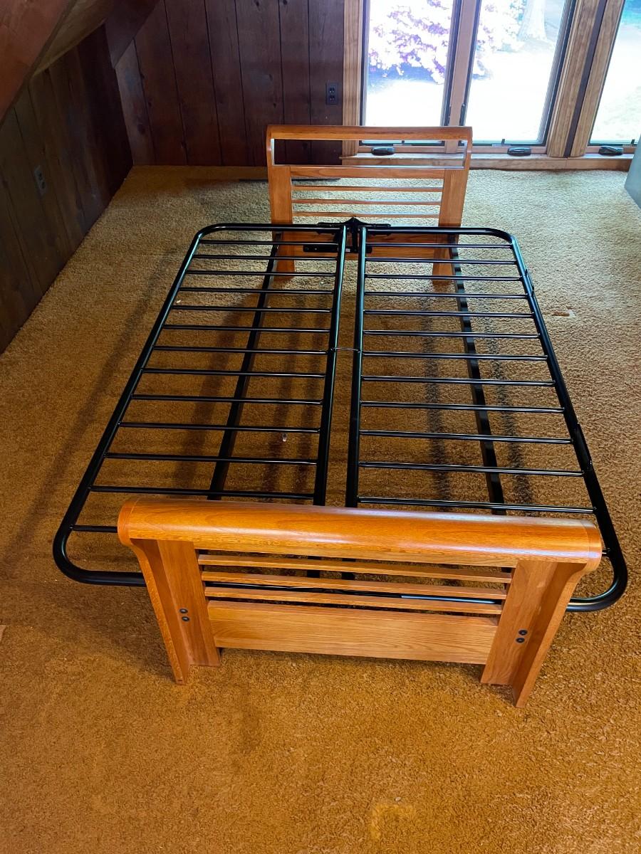 The wood and metal day bed is in excellent condition. Headboard and Footboard: 84L x 33w x 25 1/2h. Mattress area when opened: 74L x 54W x 11h.