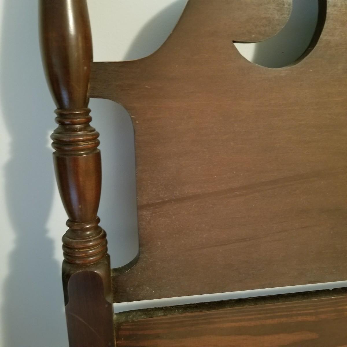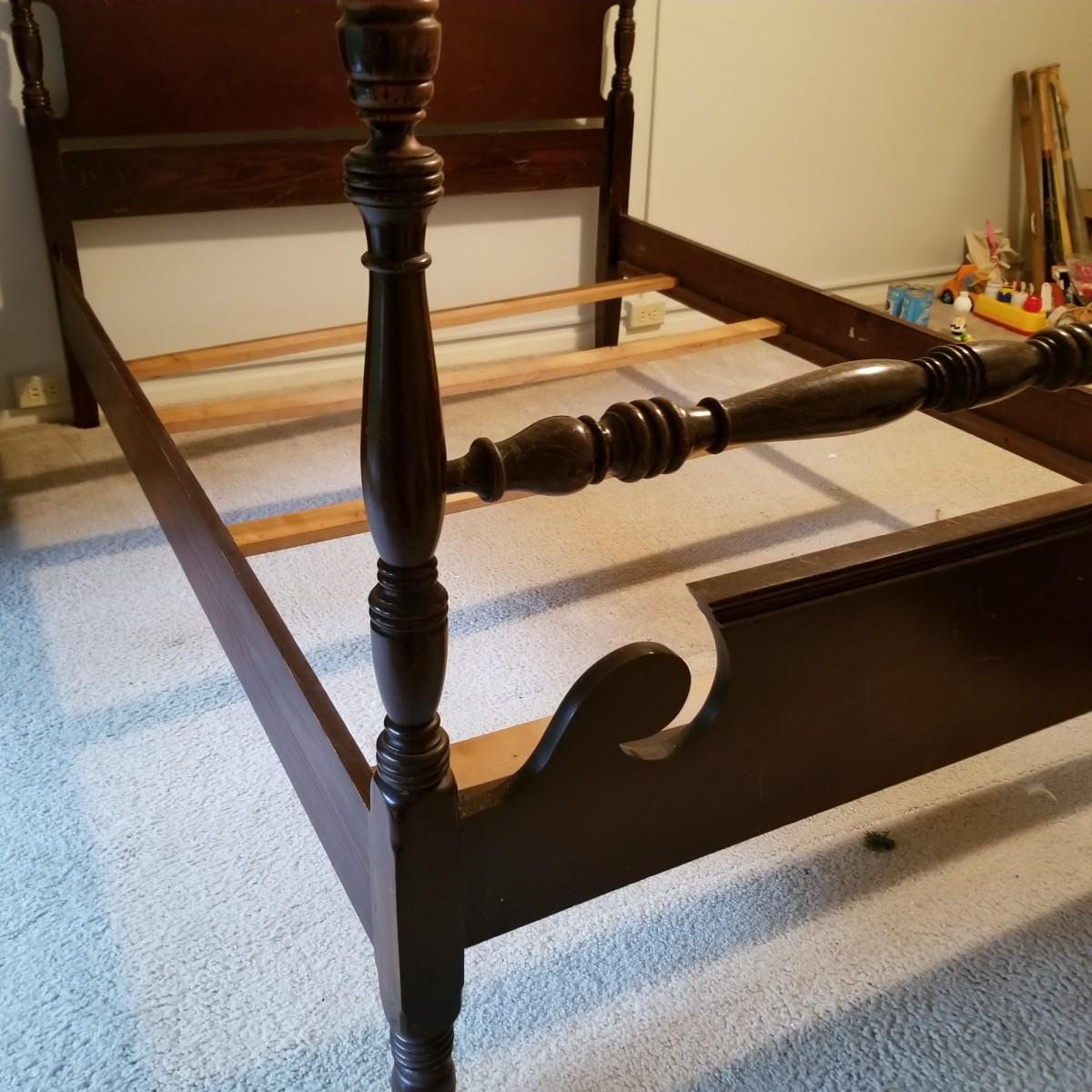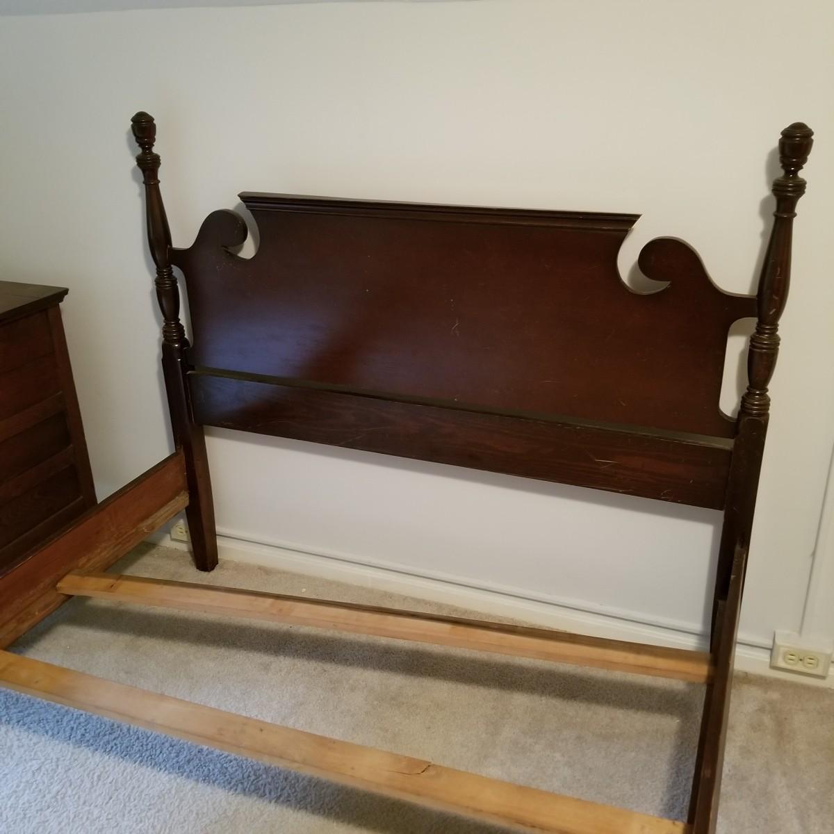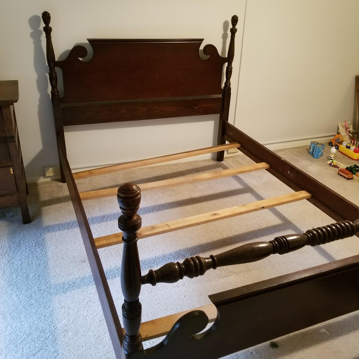 Dark wood full size bed frame with rails and slats. Solid wood with nice spool spindle accents on the footboard. Bed frame measures 56" x 80". Headboard is 48" h. Mattress foundatio height approximately 10". Some marks and superficial scratches, otherwise in good condition. Frame is broken down for transport, but is on second floor. Local pickup only.
