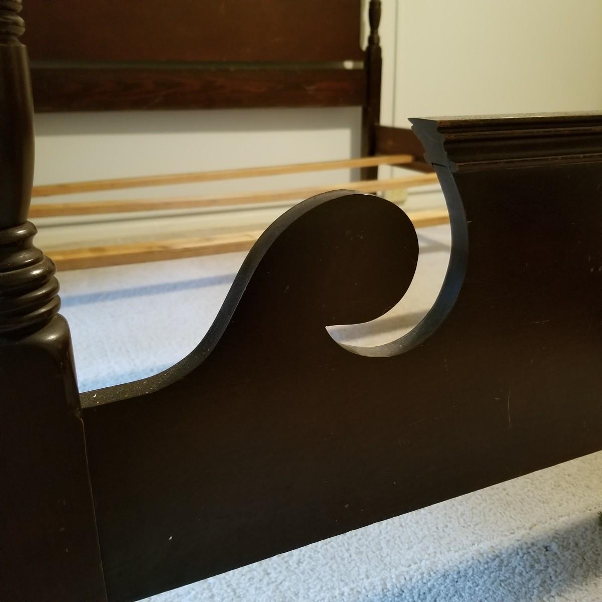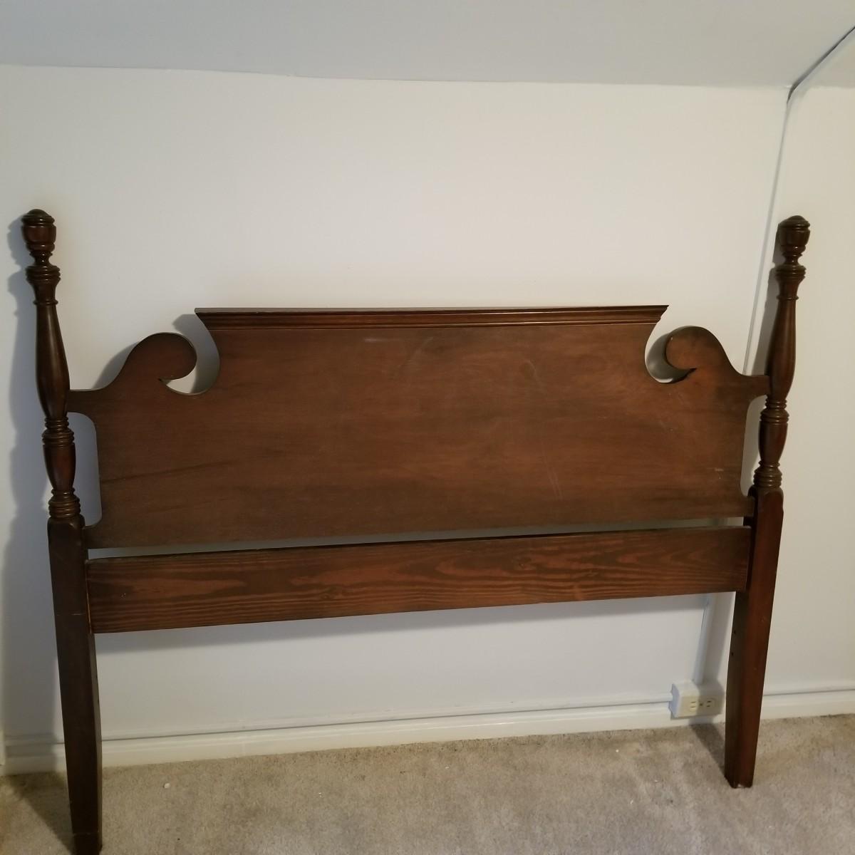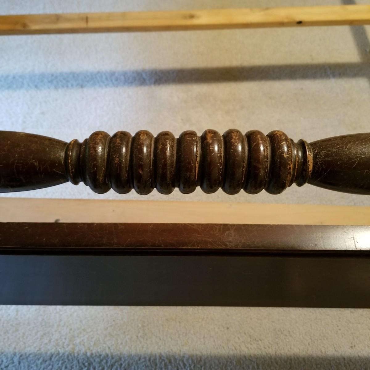 Dark wood full size bed frame with rails and slats. Solid wood with nice spool spindle accents on the footboard. Bed frame measures 56" x 80". Headboard is 48" h. Mattress foundatio height approximately 10". Some marks and superficial scratches, otherwise in good condition. Frame is broken down for transport, but is on second floor. Local pickup only.