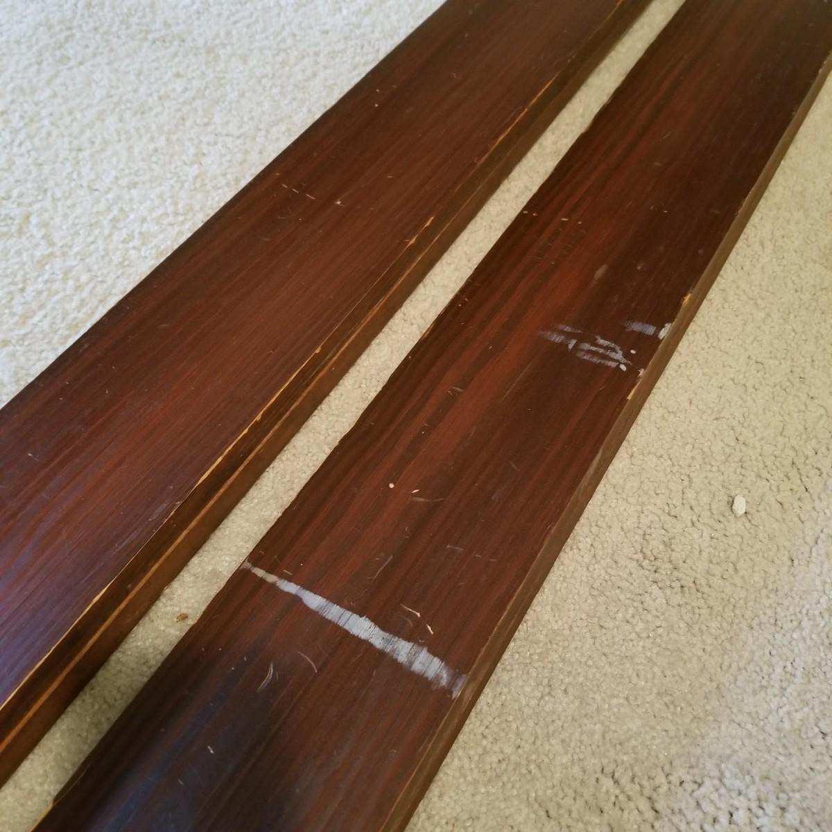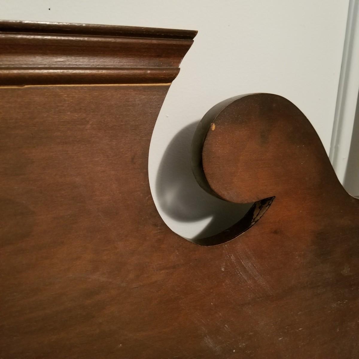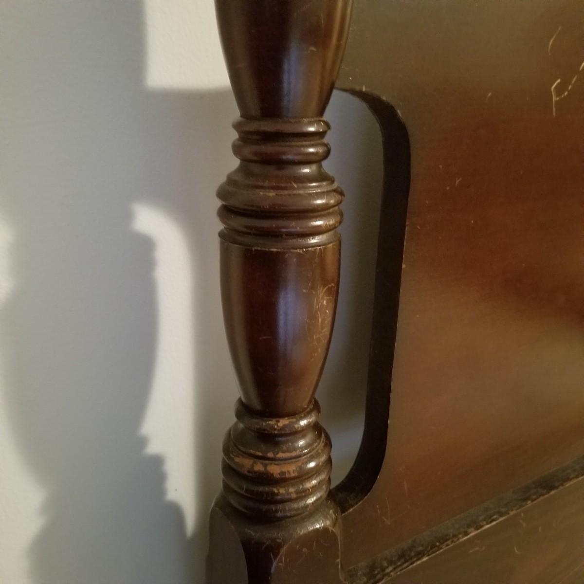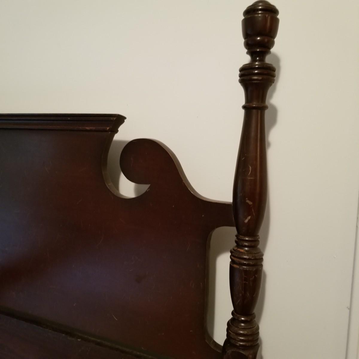 Dark wood full size bed frame with rails and slats. Solid wood with nice spool spindle accents on the footboard. Bed frame measures 56" x 80". Headboard is 48" h. Mattress foundatio height approximately 10". Some marks and superficial scratches, otherwise in good condition. Frame is broken down for transport, but is on second floor. Local pickup only.