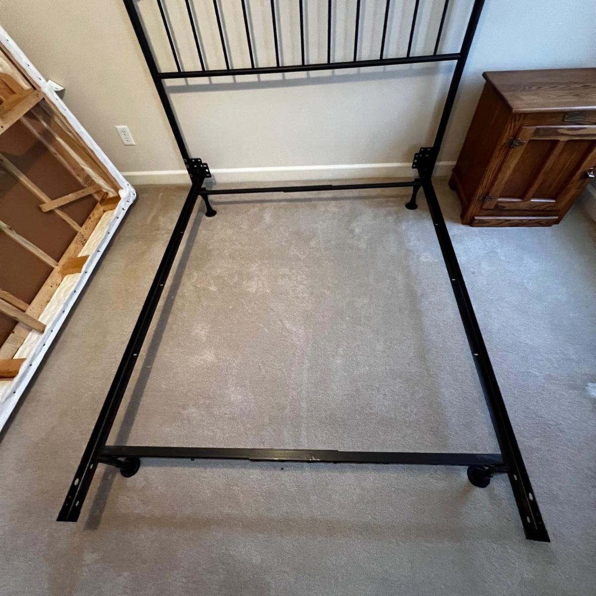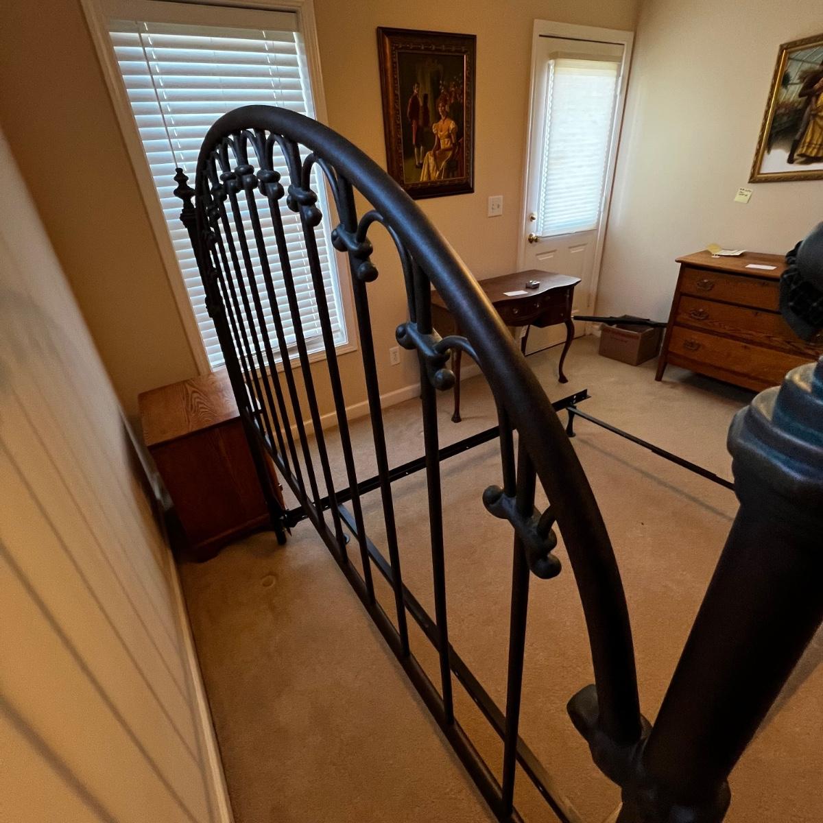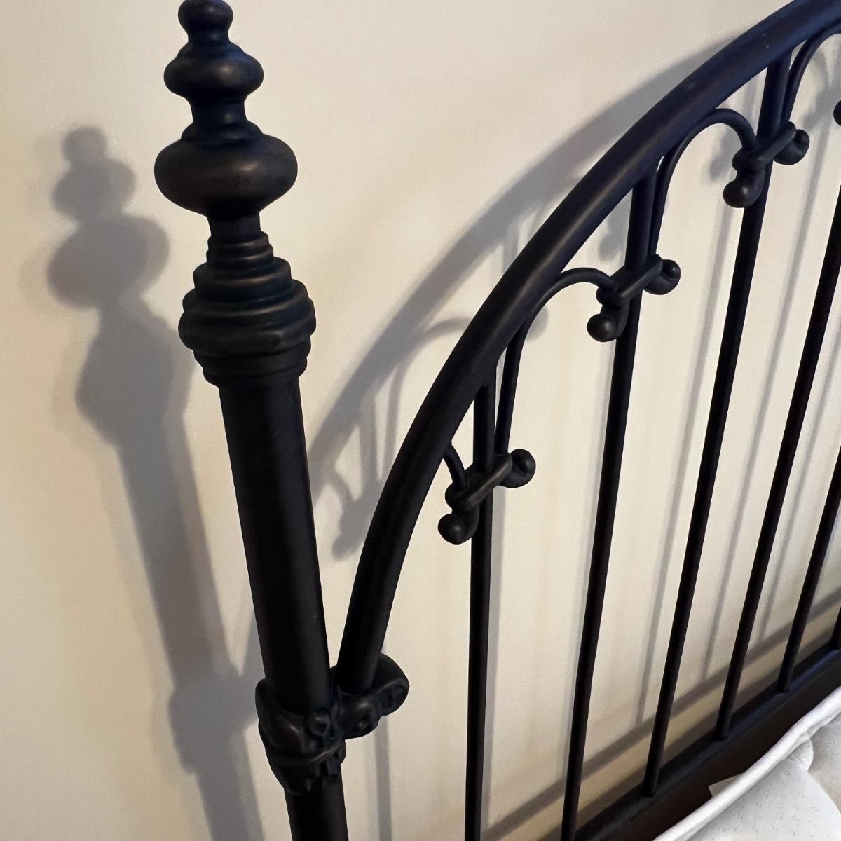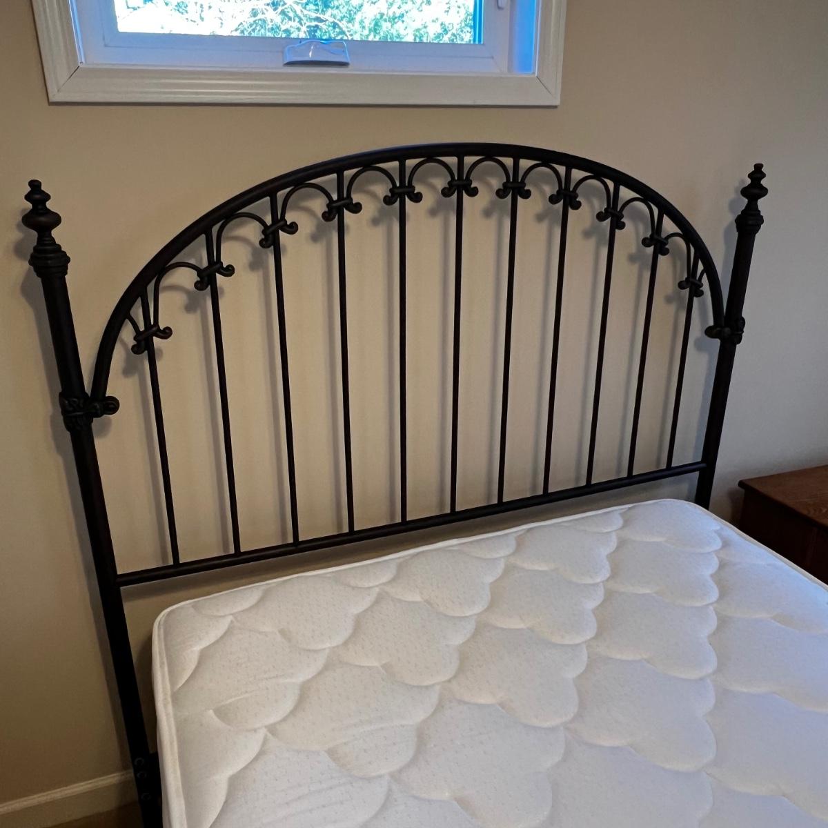 This metal headboard is newer but has a vintage look. It has a dark brown, almost black finish. Headboard measures 61” x 60”H. The mattress and boxspring are available to the winning bidder if desired. See photos for tools needed to dismantle the bed as this will be the responsibility of the winner.