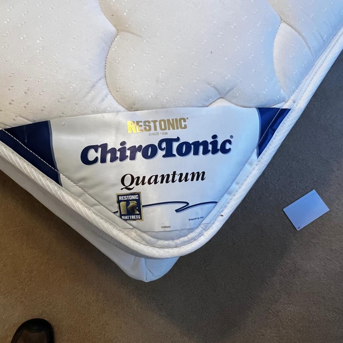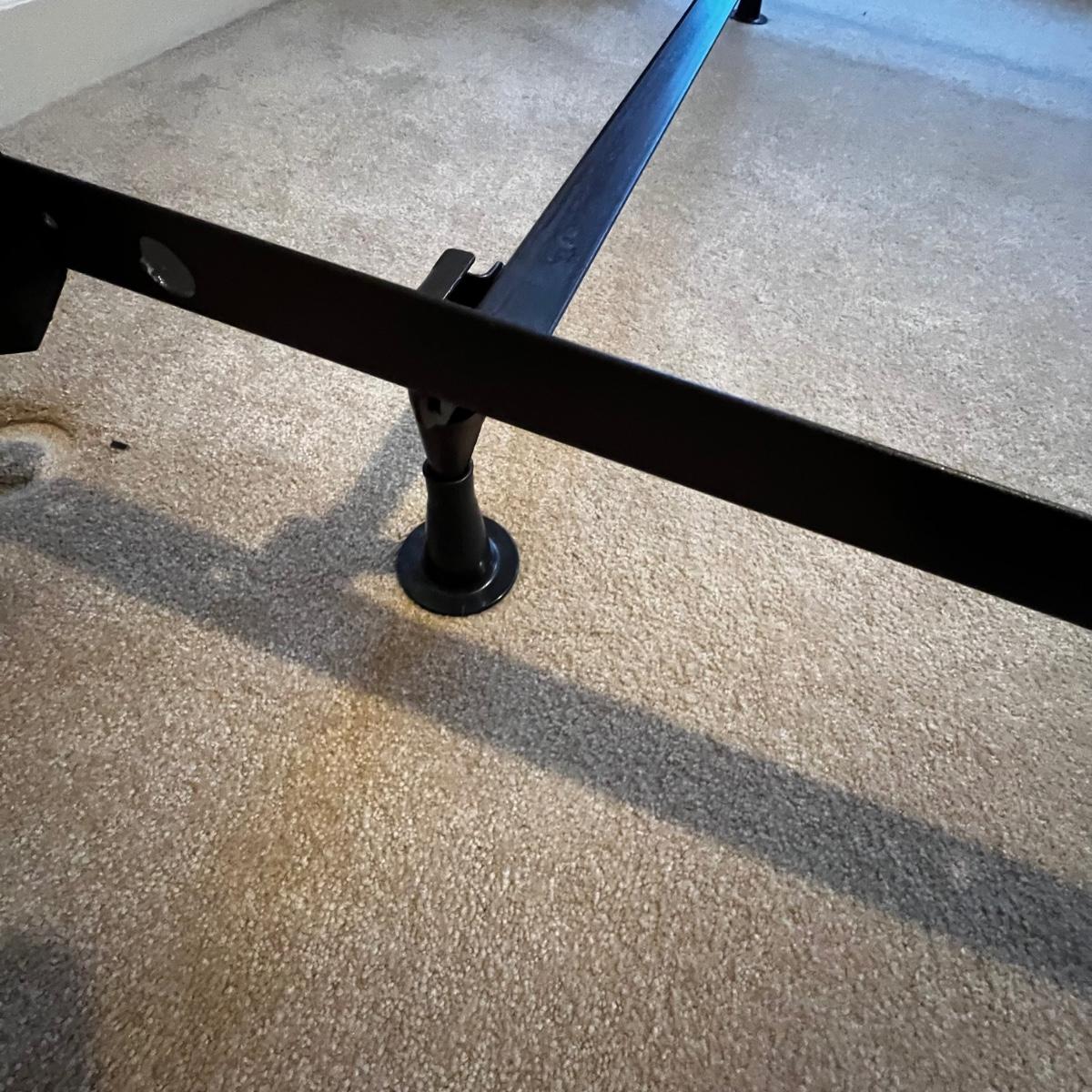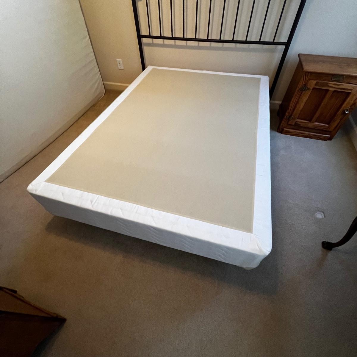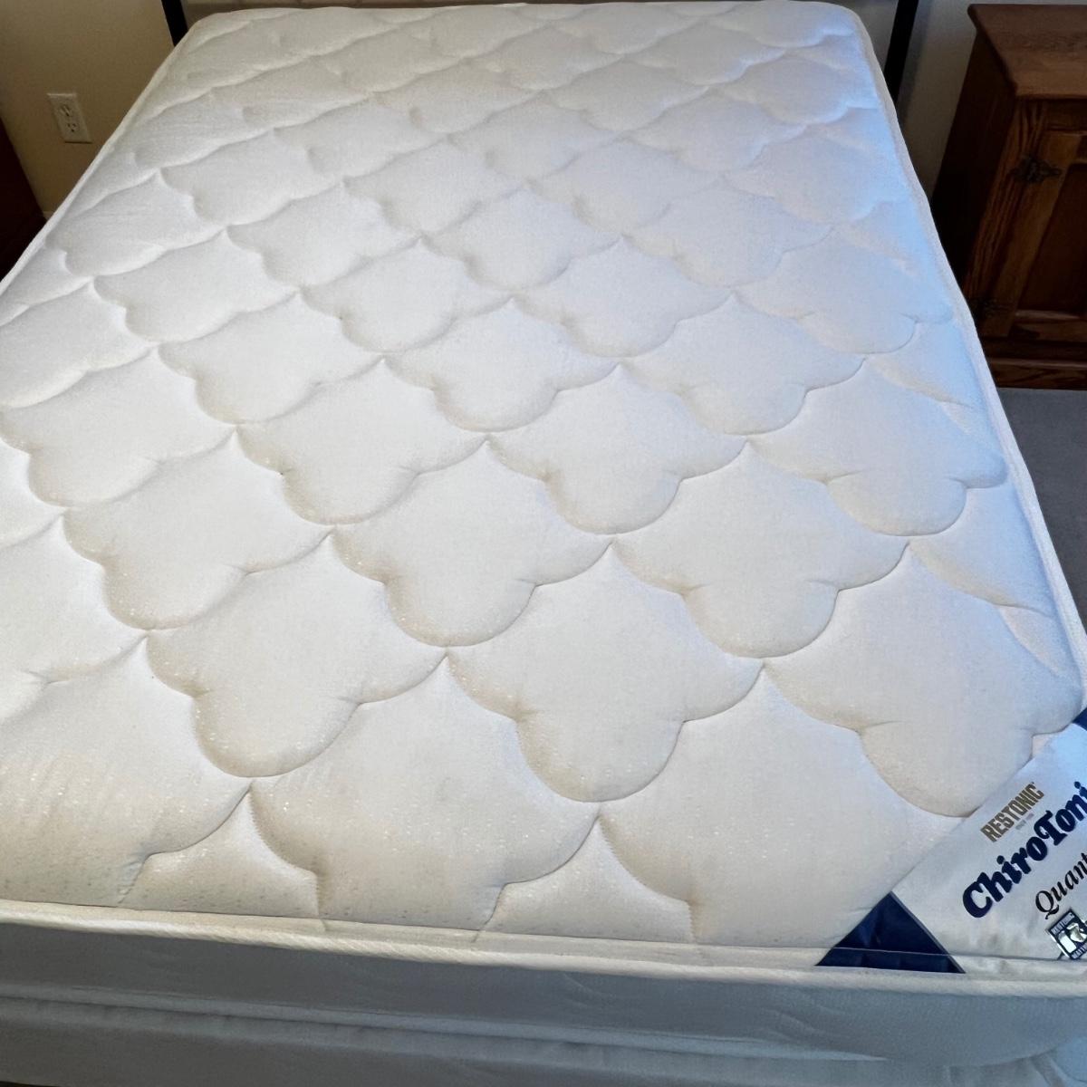 This metal headboard is newer but has a vintage look. It has a dark brown, almost black finish. Headboard measures 61” x 60”H. The mattress and boxspring are available to the winning bidder if desired. See photos for tools needed to dismantle the bed as this will be the responsibility of the winner.