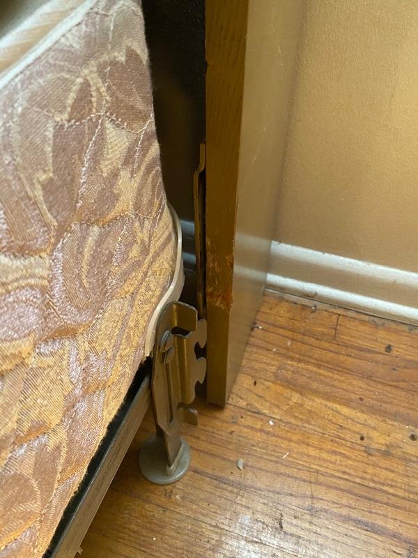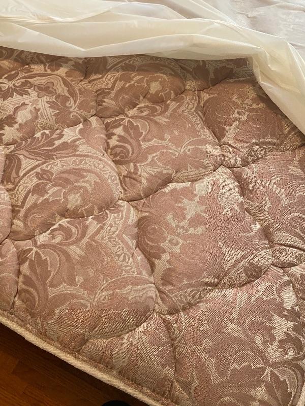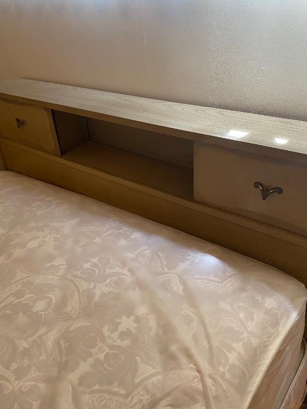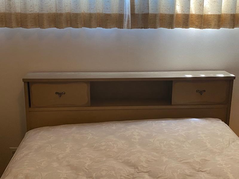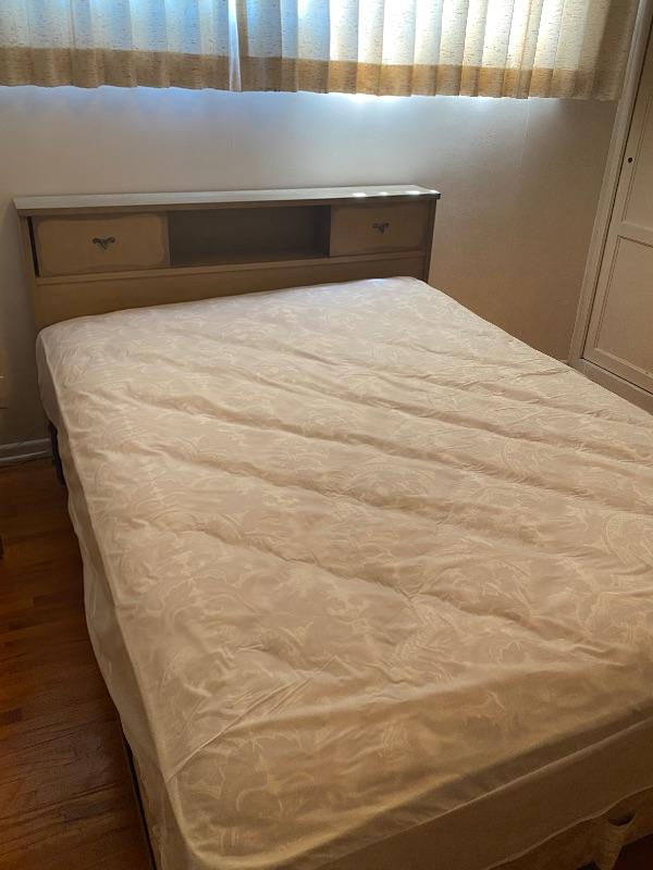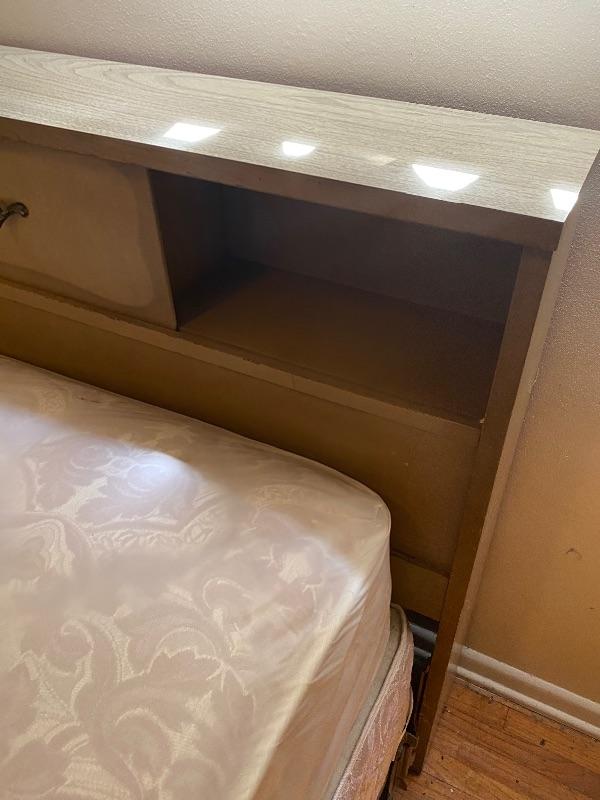 Vintage Mid Century Head Board. Had sliding doors on each side. Veneer top is in great shape. Some wear to edges on the sides. Back board a little loose. Mattress and box spring included. Mattress is in a waterproof cover, looks to be in very good condition. Headboard measures 56”x8” and is 36” tall. Mattress is flip able.