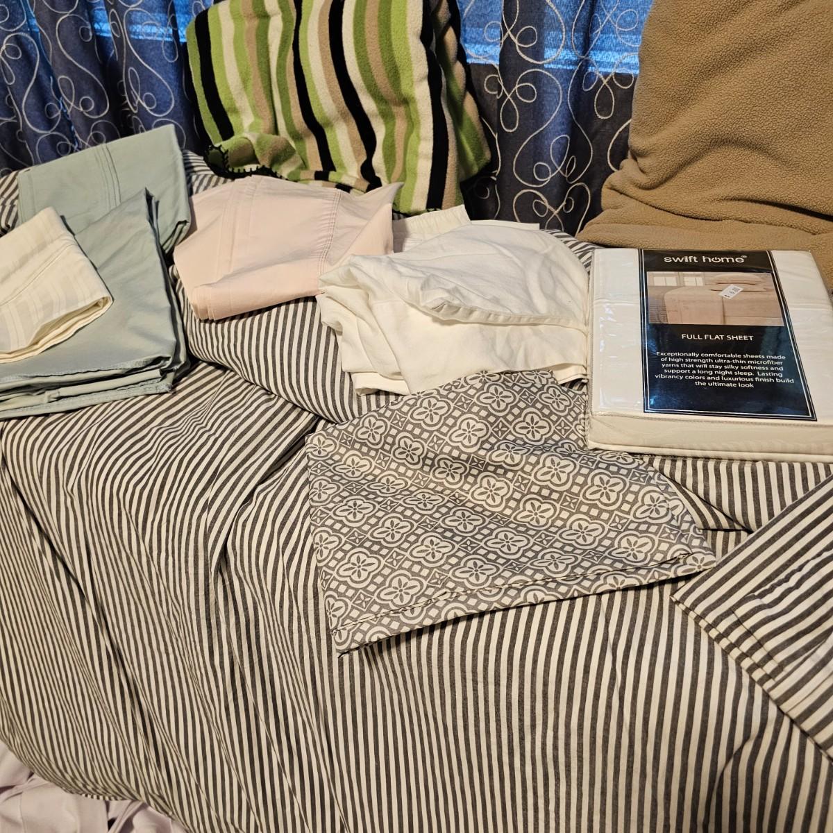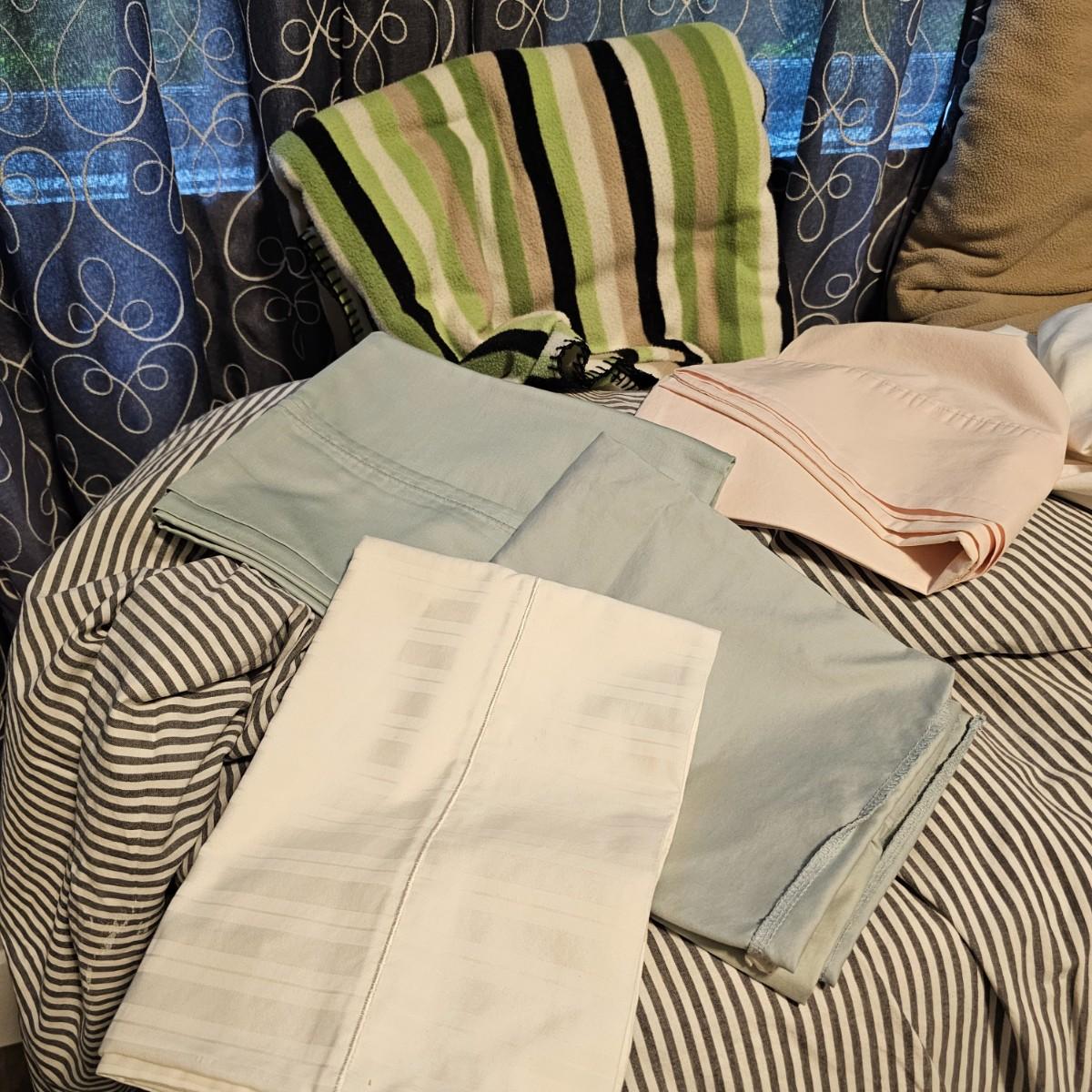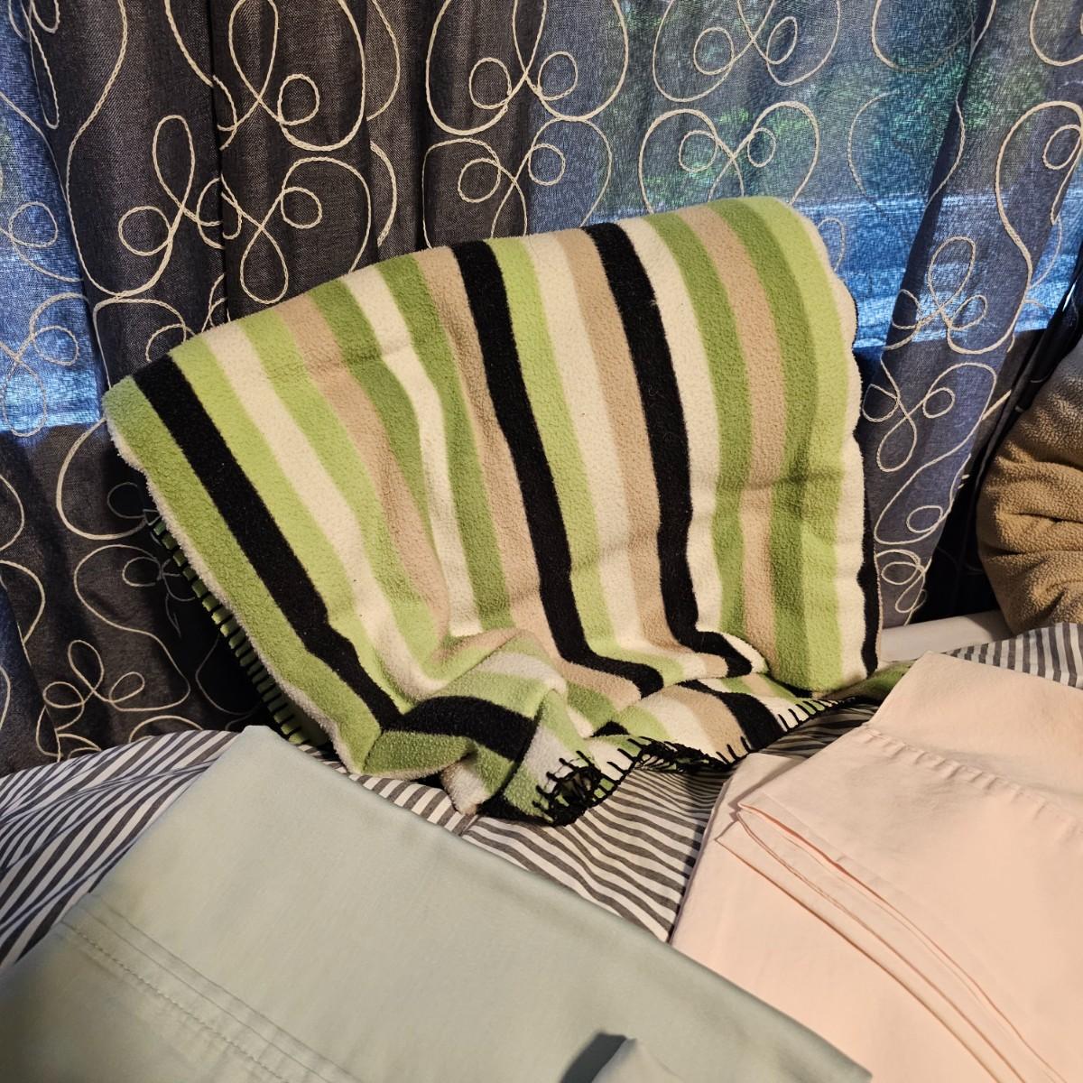 One striped bedspread, 80" x 80". Mark near bottom edge. Nine regular size pillowcases, assorted colors. Two blankets, green is 56" x 96", brown is 84" x 88". Also includes one NIB flat sheet. See photos for details. Local pickup only.