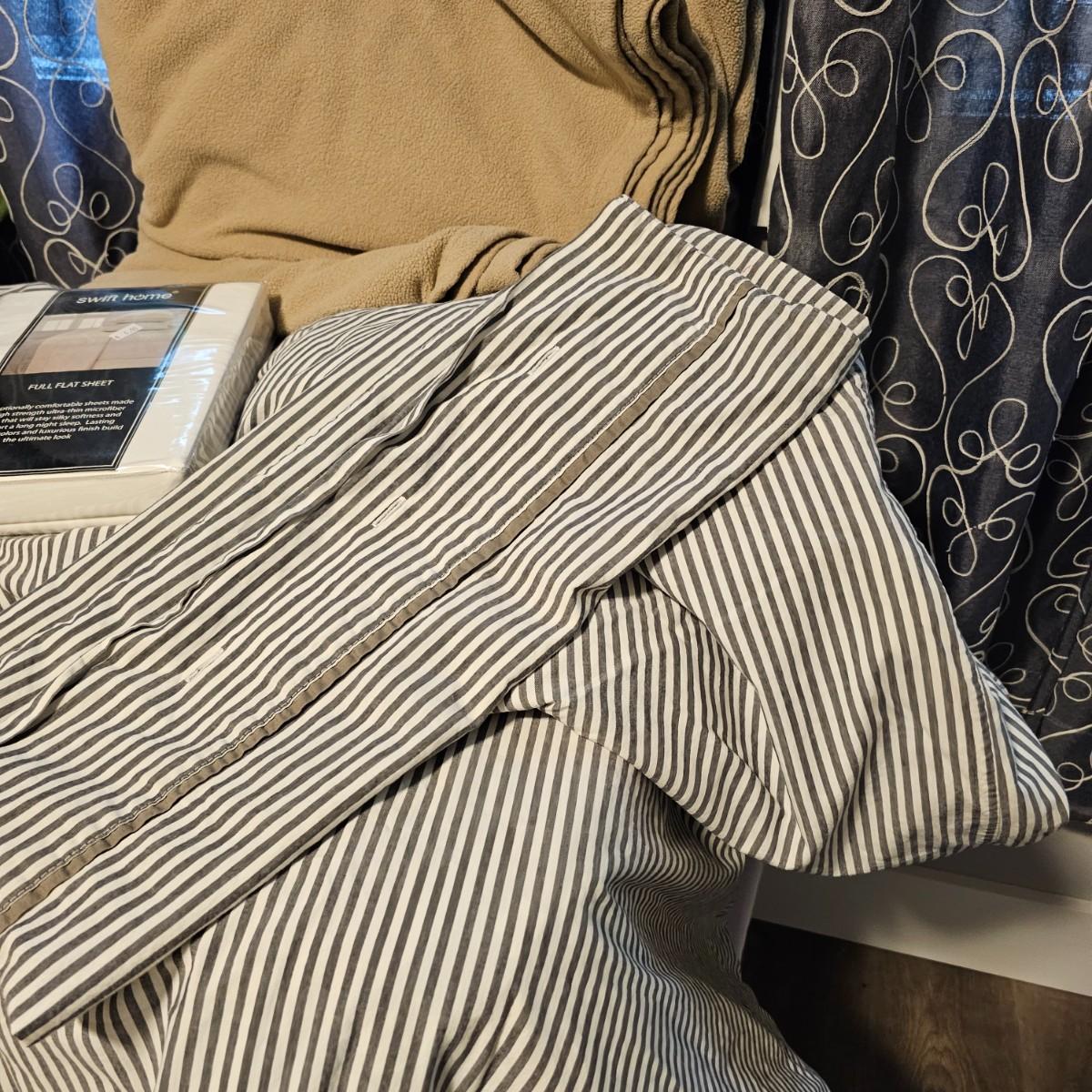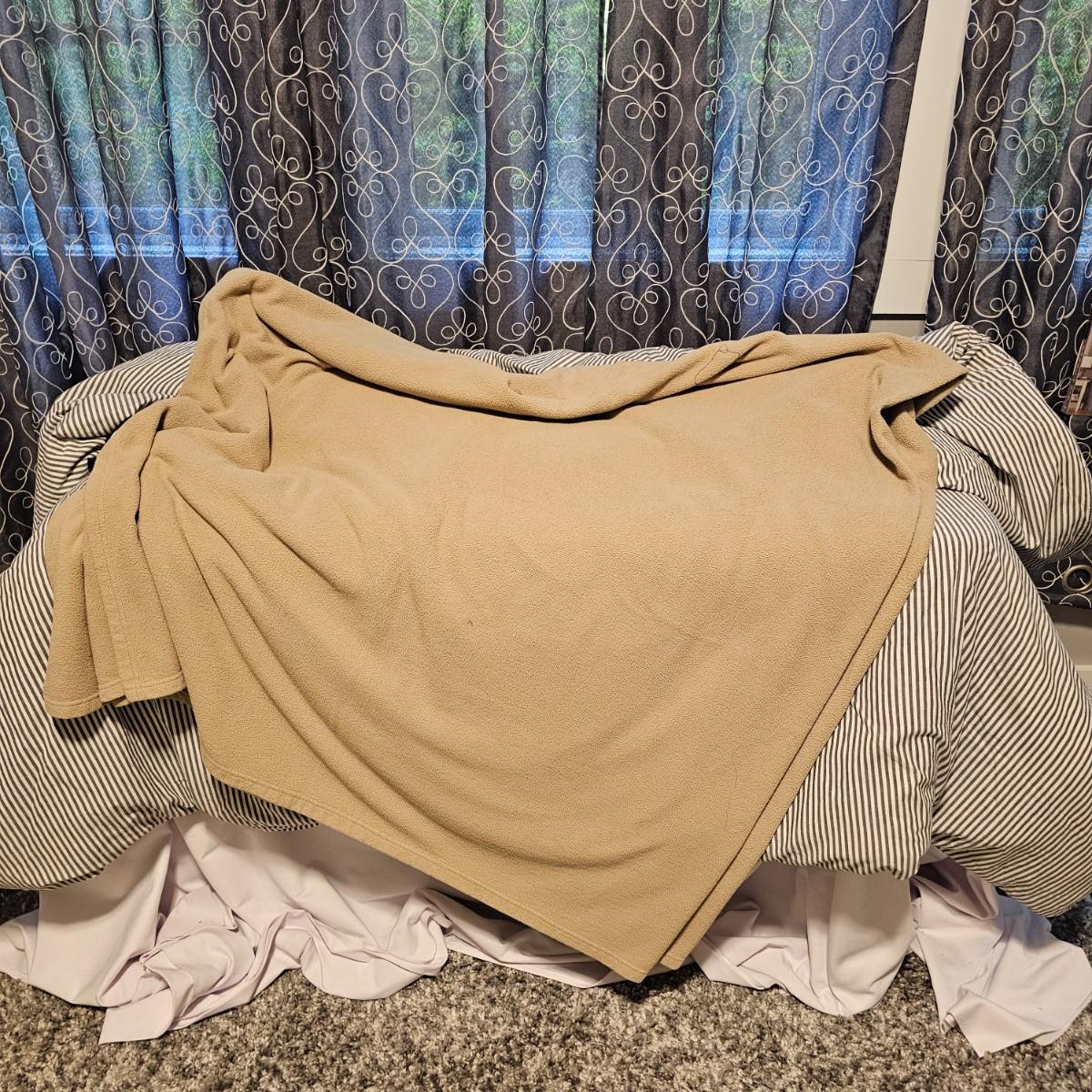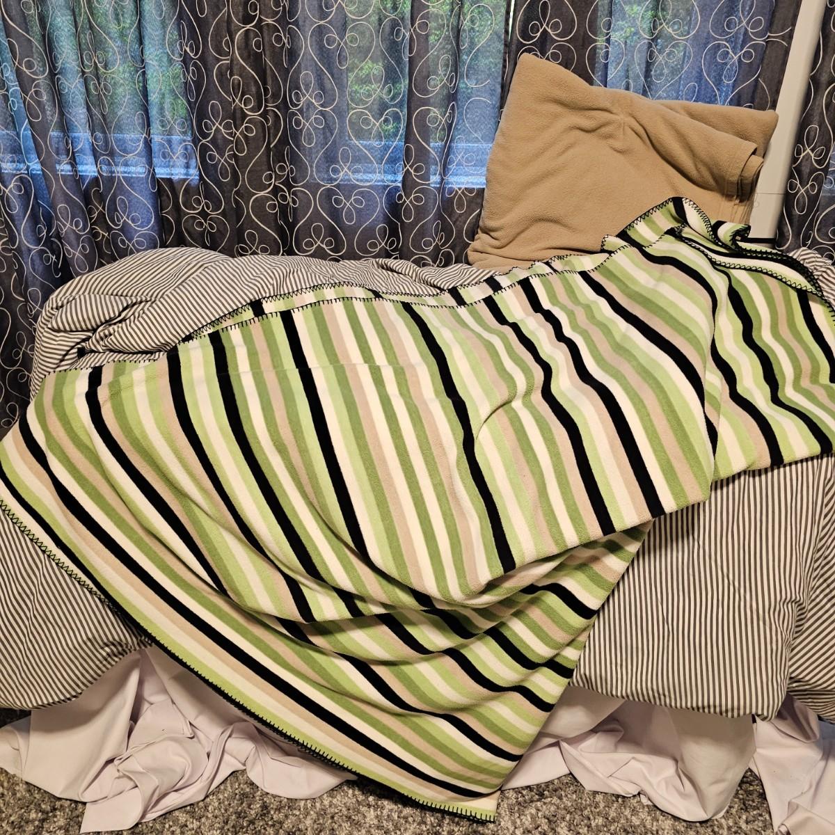One striped bedspread, 80" x 80". Mark near bottom edge. Nine regular size pillowcases, assorted colors. Two blankets, green is 56" x 96", brown is 84" x 88". Also includes one NIB flat sheet. See photos for details. Local pickup only.