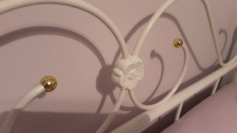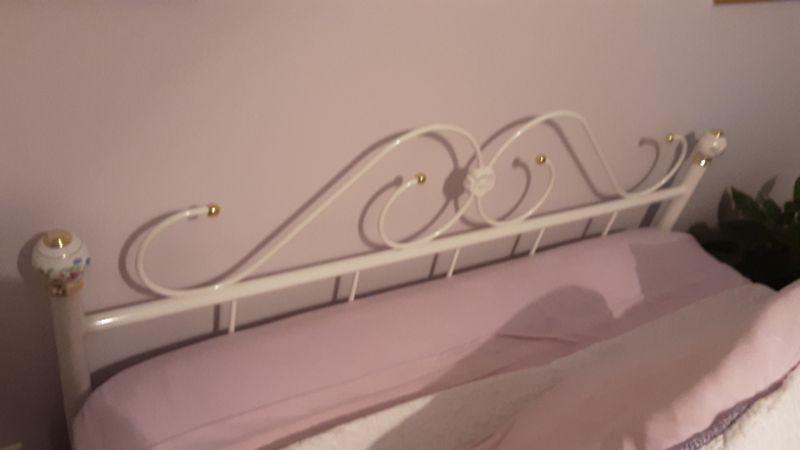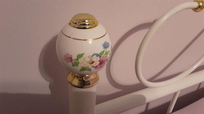 Full Size White Metal Scrolled head board and frame with floral bed knobs