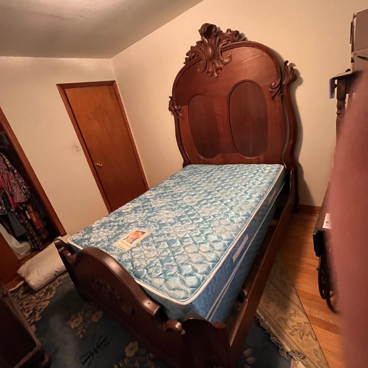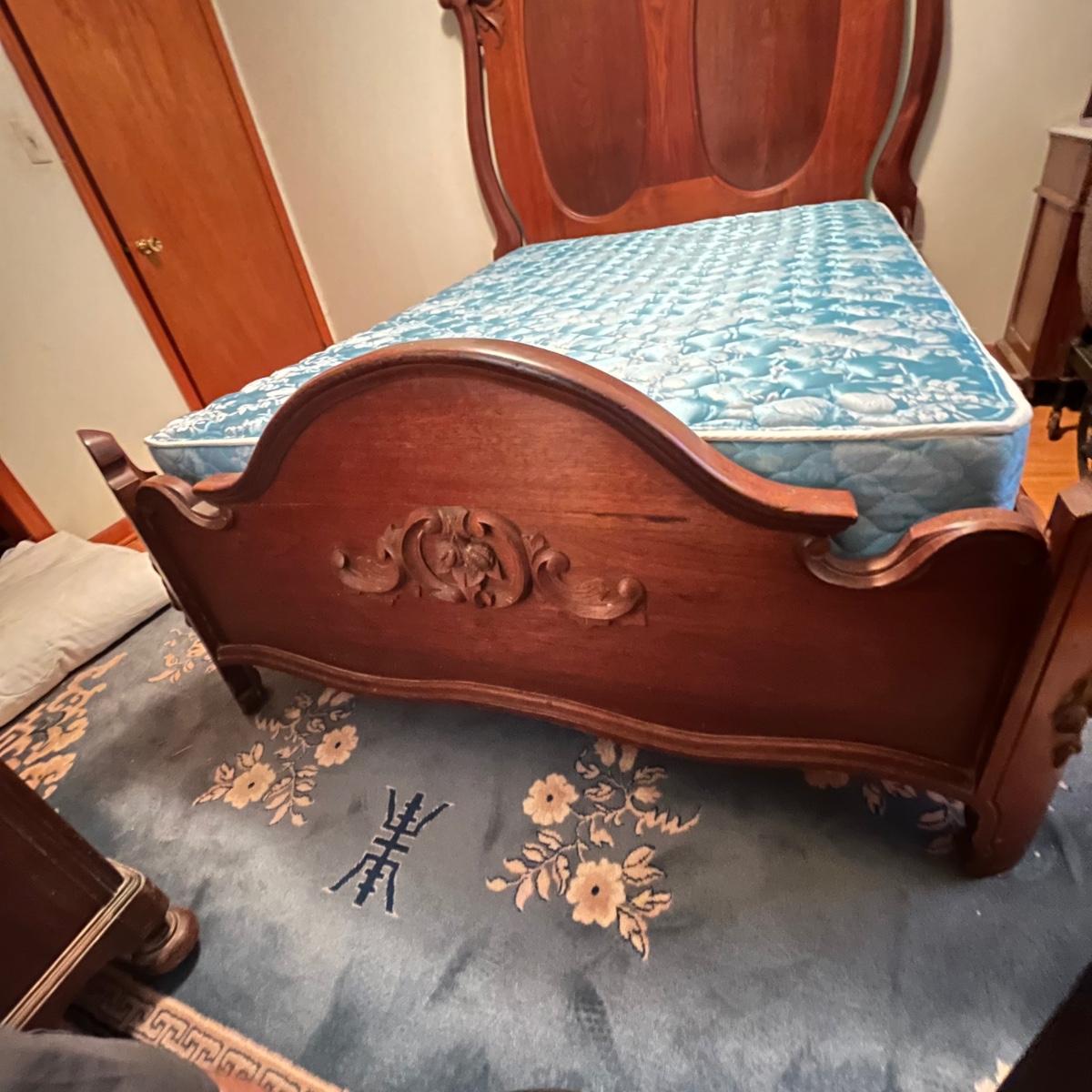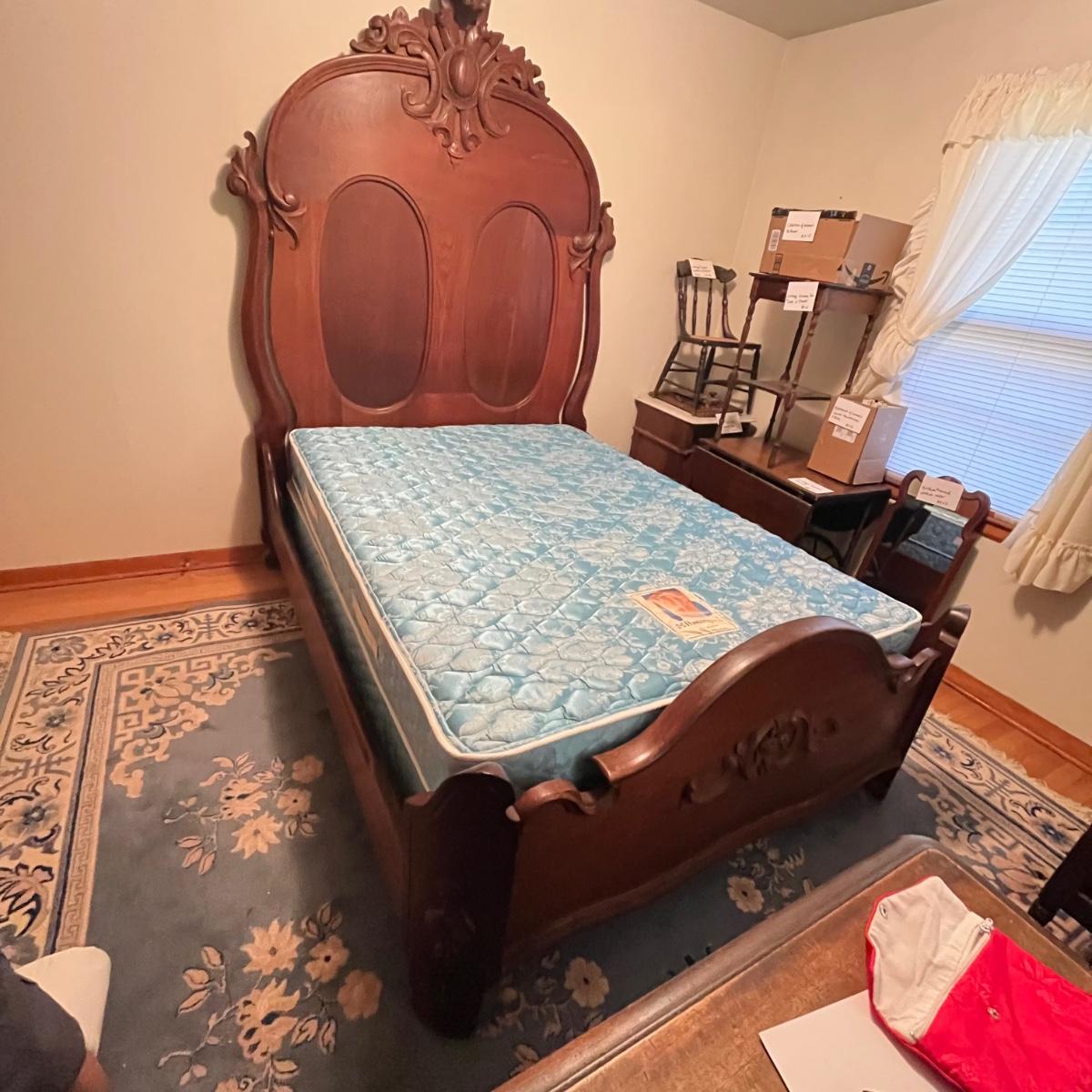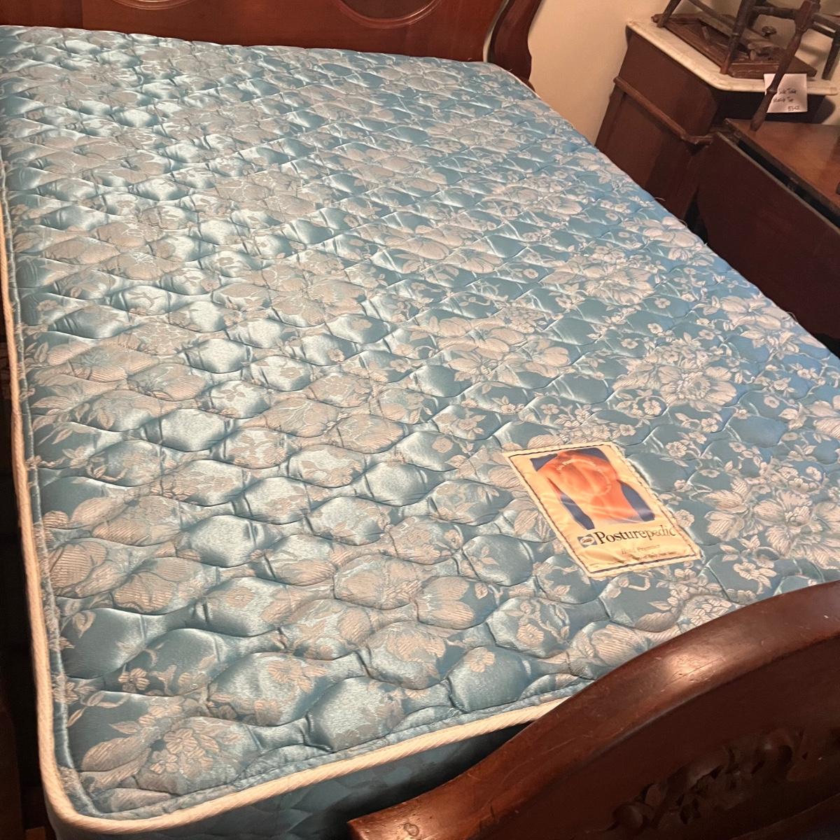 Lot includes a ornate full size wooden bed with a large headboard and footboard. Bed has some gouges that are hidden by mattress. Sealy Posturepedic mattress and box spring are available to the winning bidder if desired. Frame attaches to the headboard with nuts and bolts, but is already disassembled. Measures 60” x 78” x 84”. The winning bidder will need to bring help as item is substantial. The winning bidder is also responsible for disassembling the bed frame.