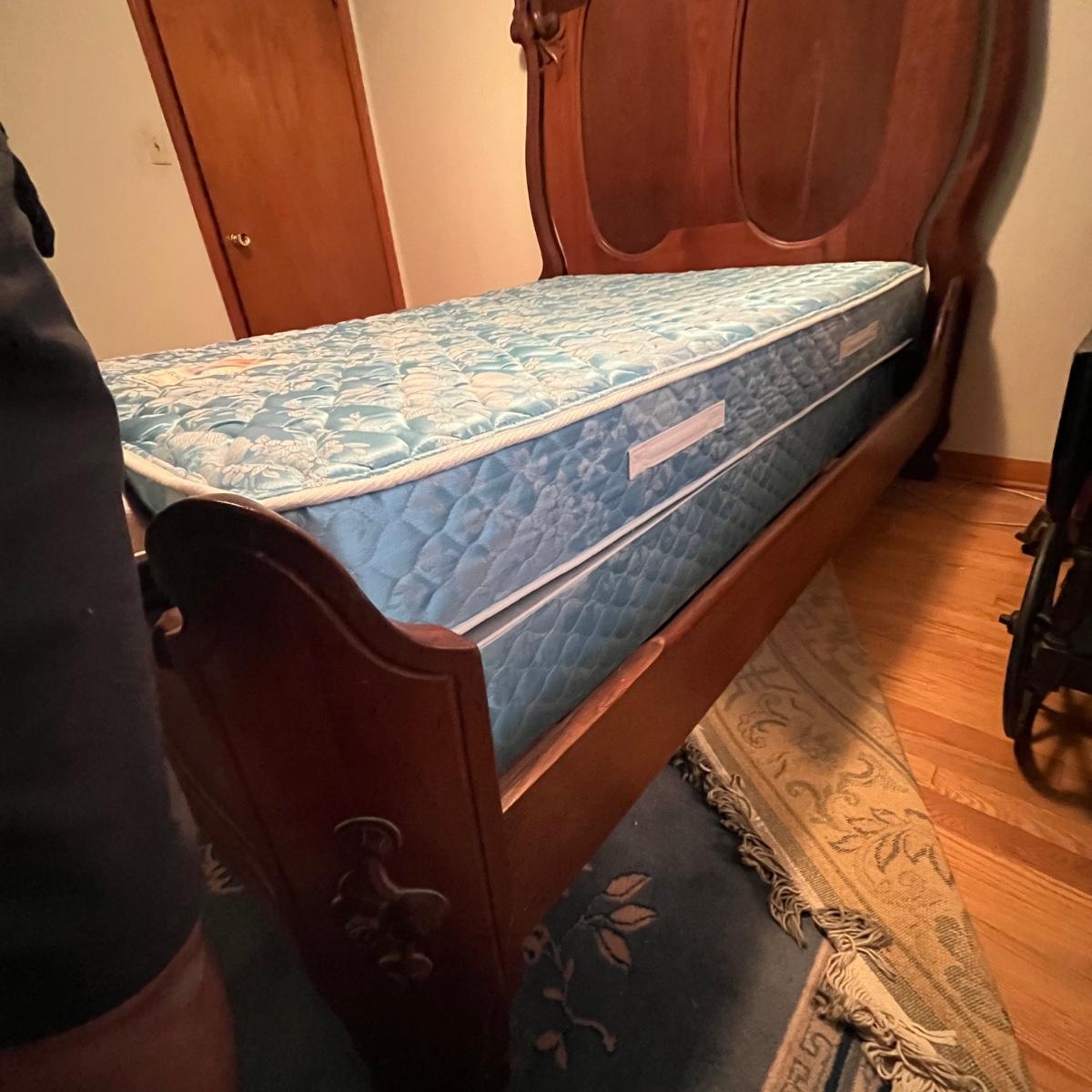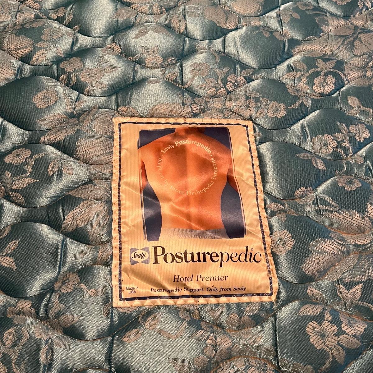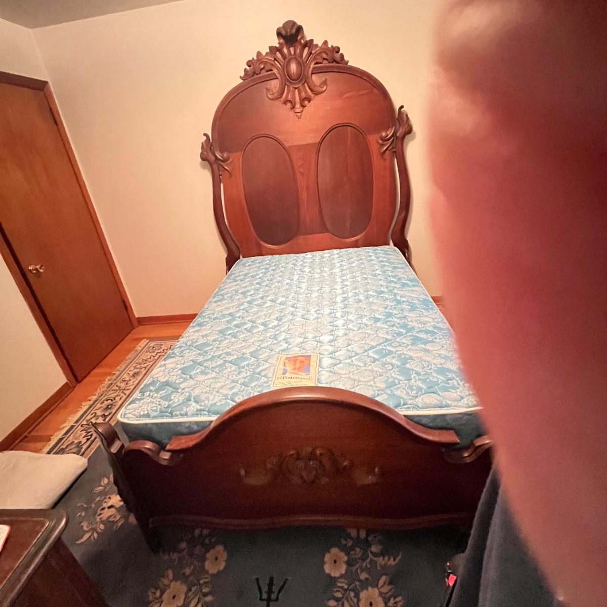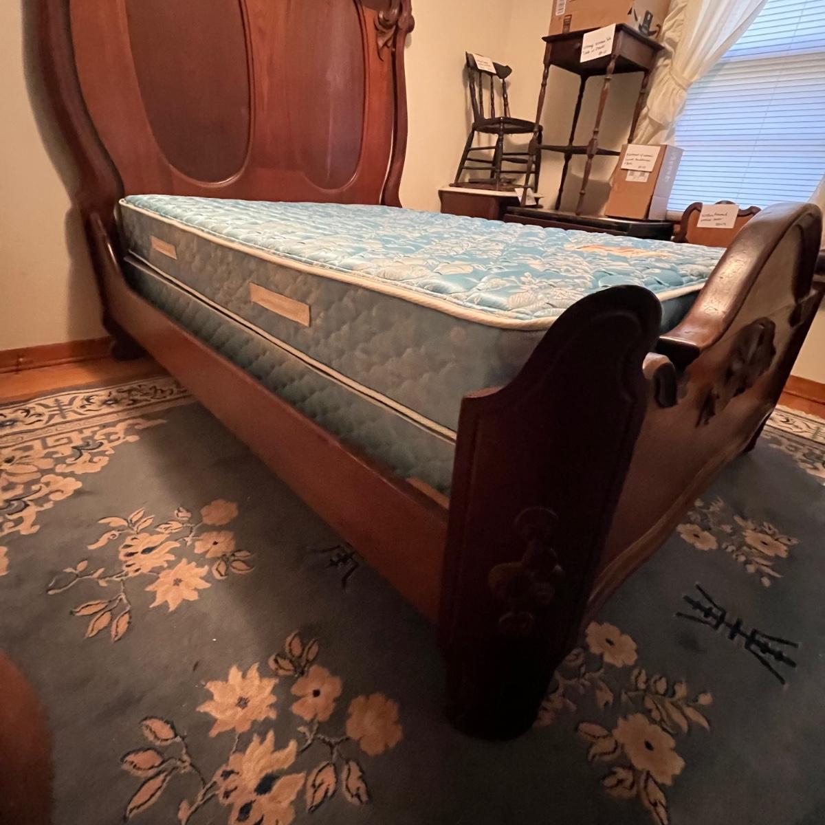 Lot includes a ornate full size wooden bed with a large headboard and footboard. Bed has some gouges that are hidden by mattress. Sealy Posturepedic mattress and box spring are available to the winning bidder if desired. Frame attaches to the headboard with nuts and bolts, but is already disassembled. Measures 60” x 78” x 84”. The winning bidder will need to bring help as item is substantial. The winning bidder is also responsible for disassembling the bed frame.