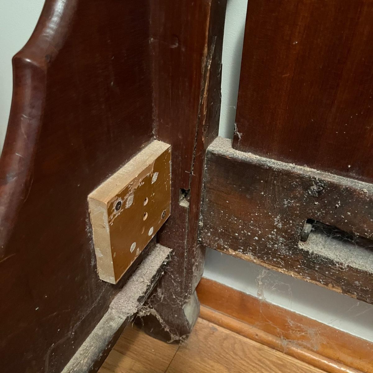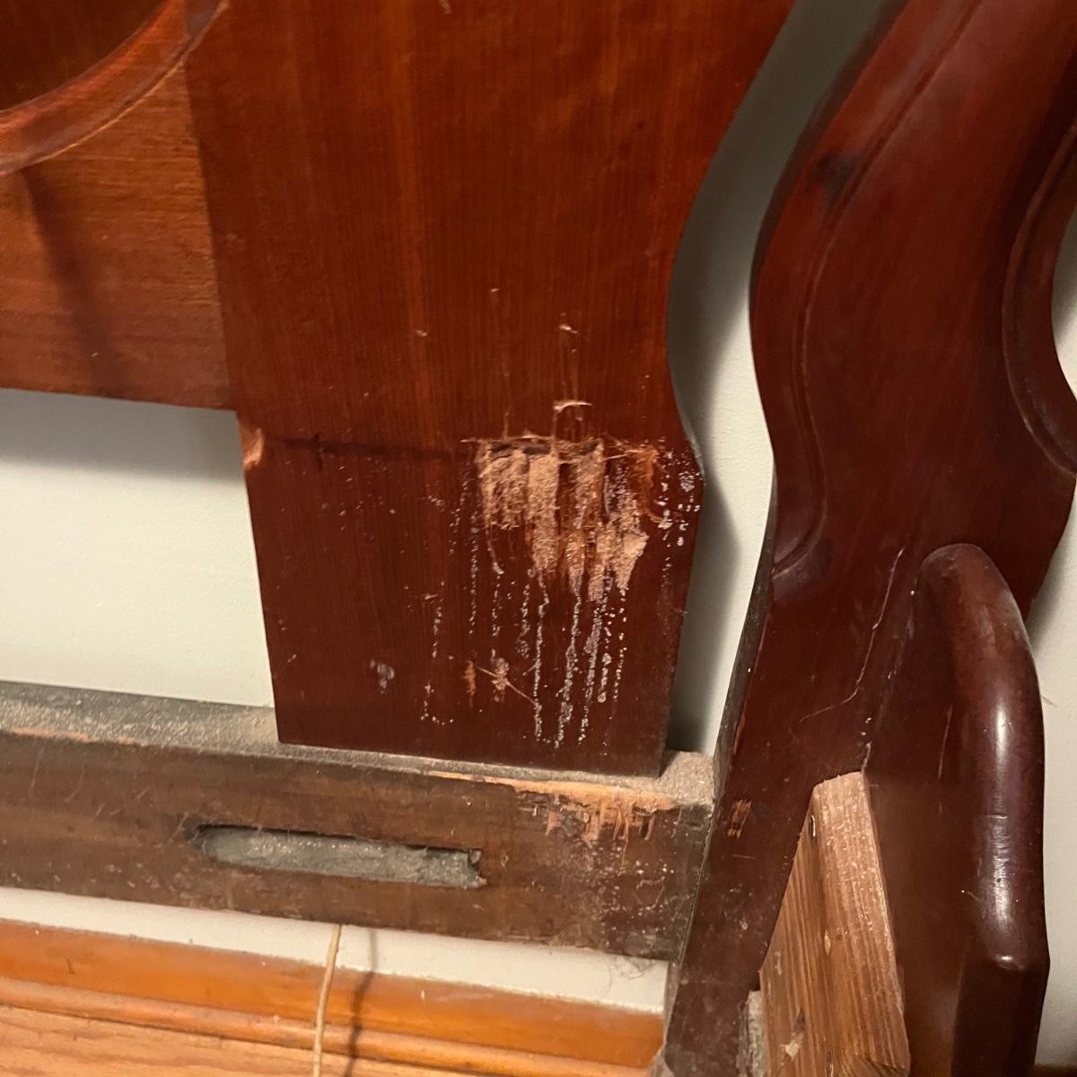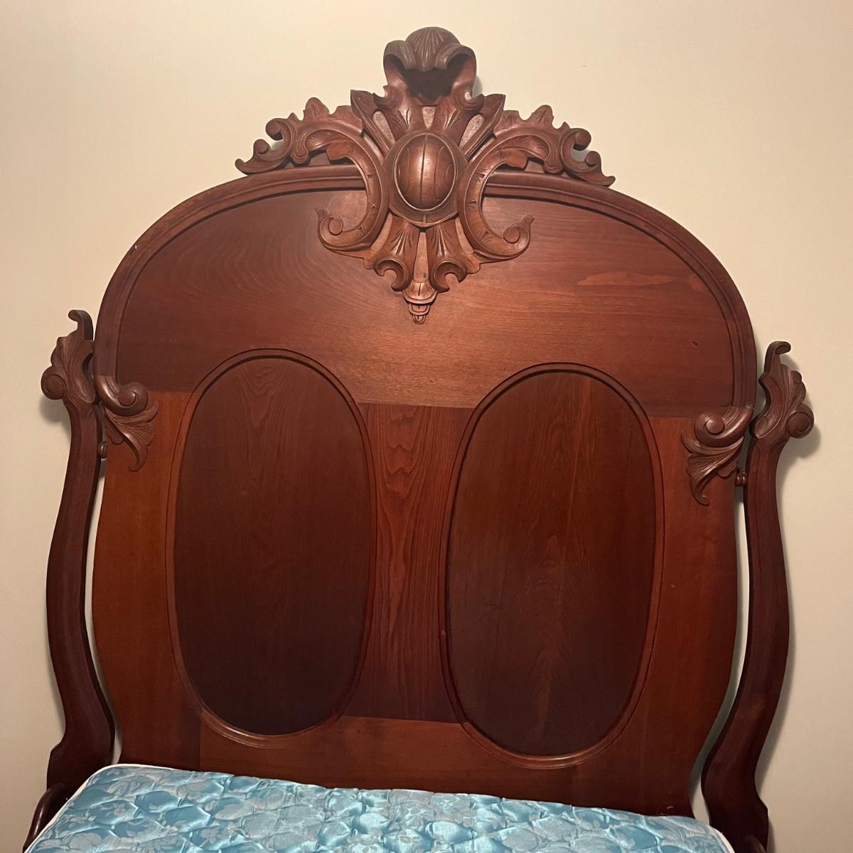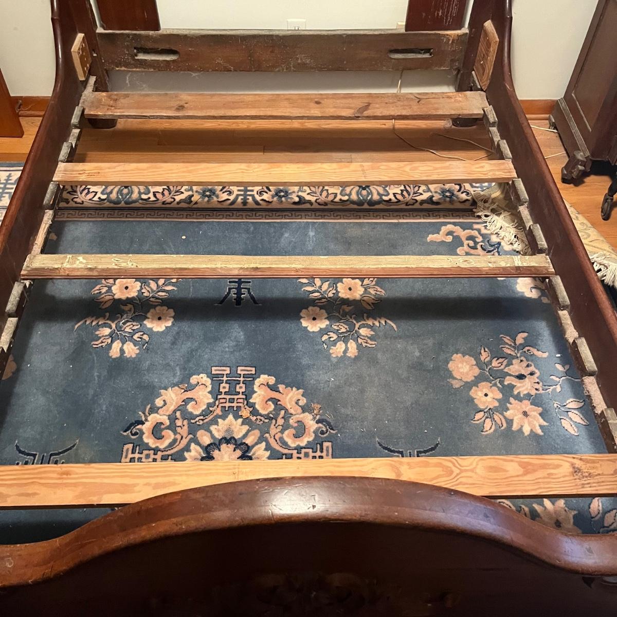 Lot includes a ornate full size wooden bed with a large headboard and footboard. Bed has some gouges that are hidden by mattress. Sealy Posturepedic mattress and box spring are available to the winning bidder if desired. Frame attaches to the headboard with nuts and bolts, but is already disassembled. Measures 60” x 78” x 84”. The winning bidder will need to bring help as item is substantial. The winning bidder is also responsible for disassembling the bed frame.
