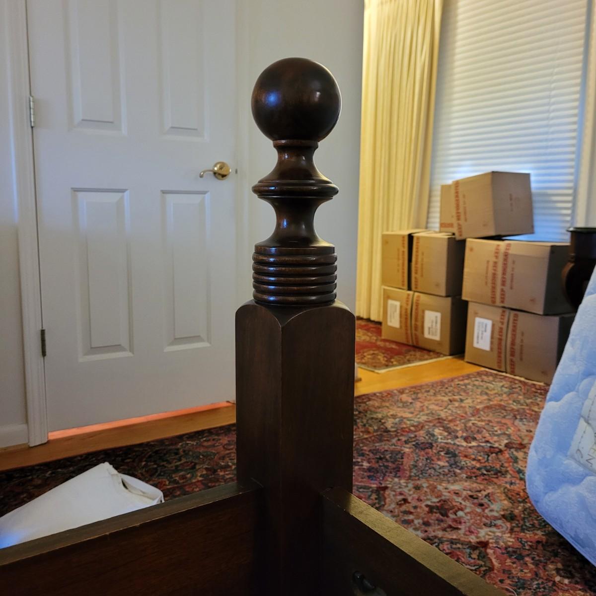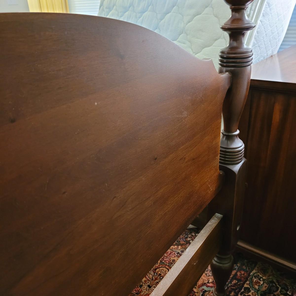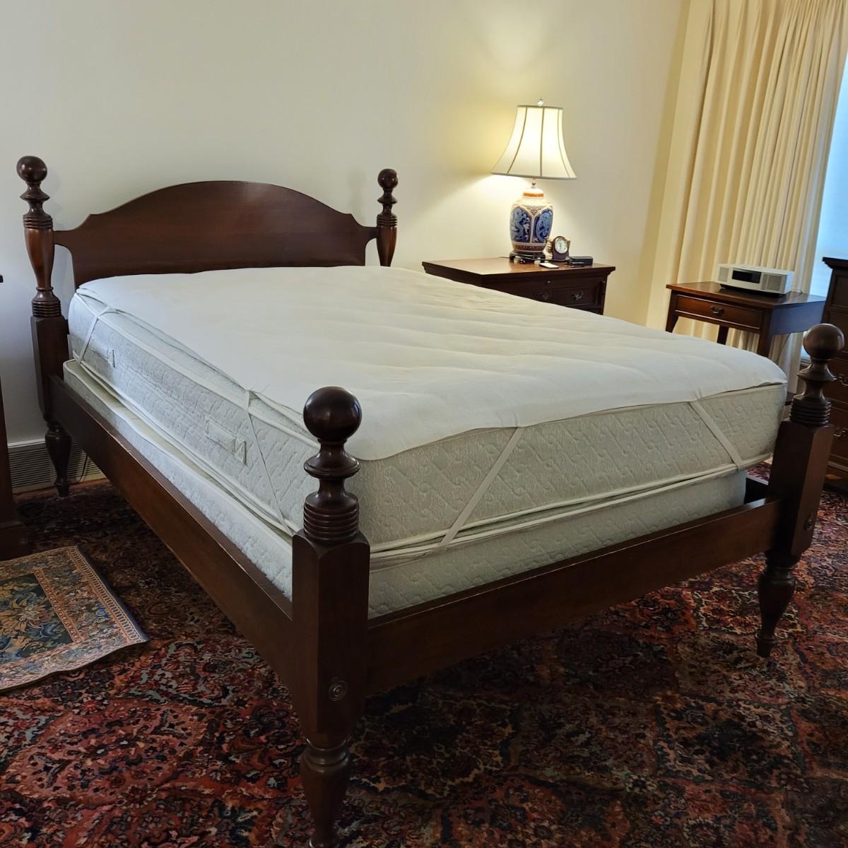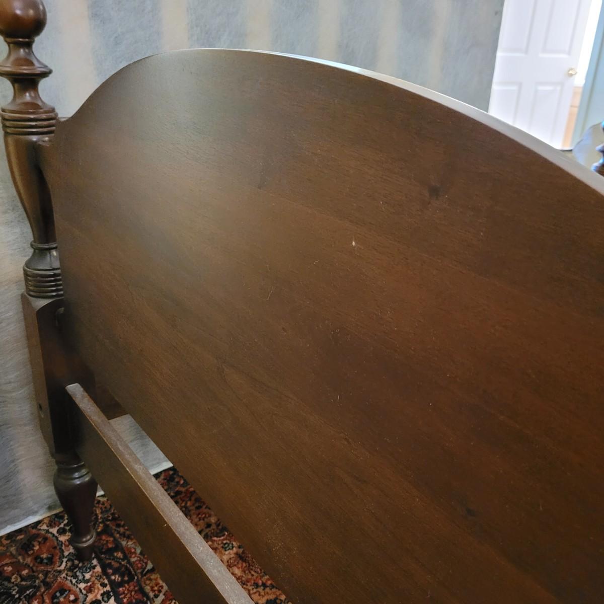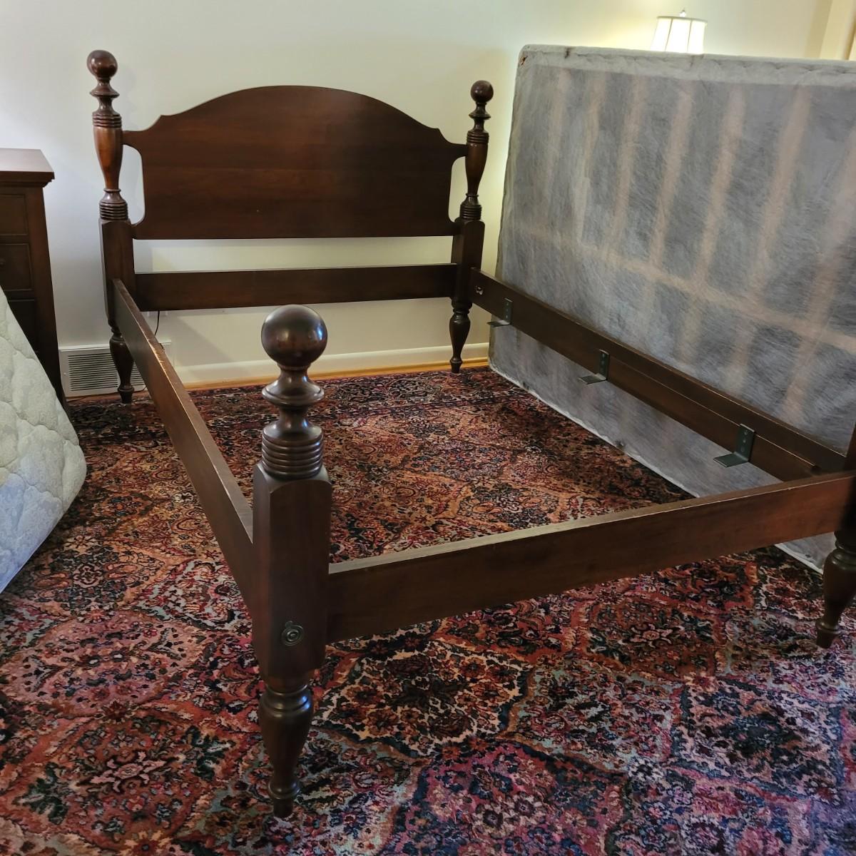 Beautiful solid dark wood cannonball poster style bed in very good condition with very few scratches (see photos). Frame measures approximately 58"L x82"W x36"H at foot, 48"H at head. Mattress pad not included. Mattress and box spring are available to the winning bidder if desired. Ethan Allen pillowtop mattress is clean and in good condition. Local pickup only. Items are large and heavy. The winning bidder must please bring help to move and load. Winning bidder will also need to disassemble bed frame.