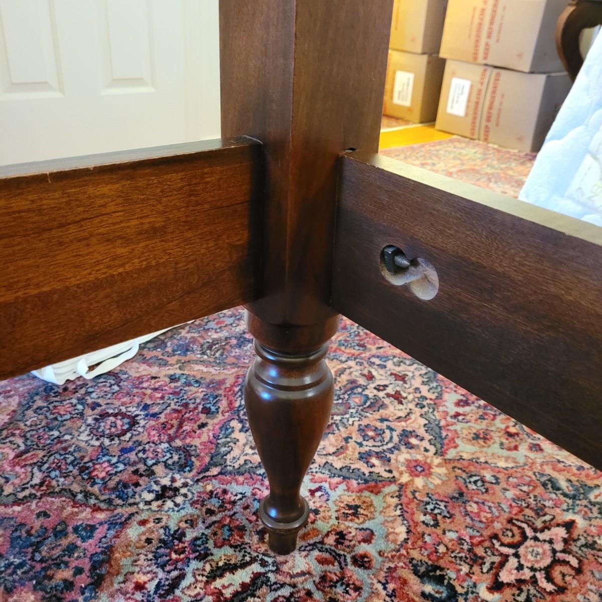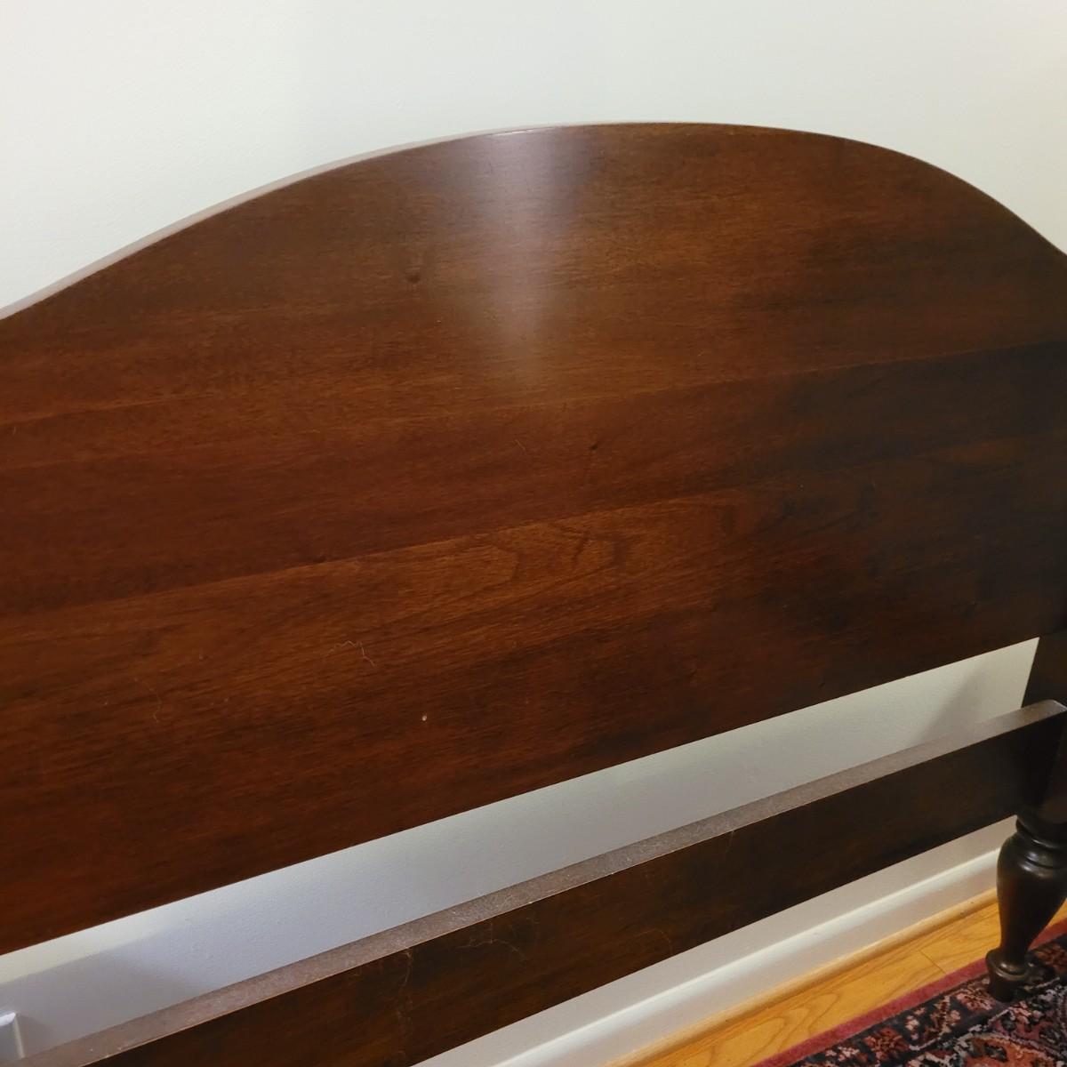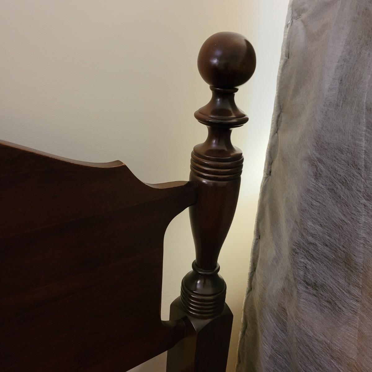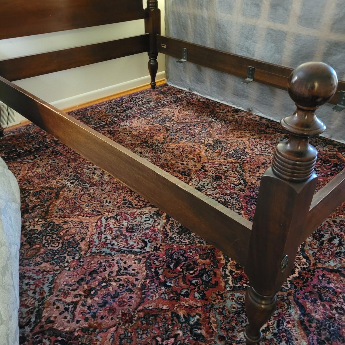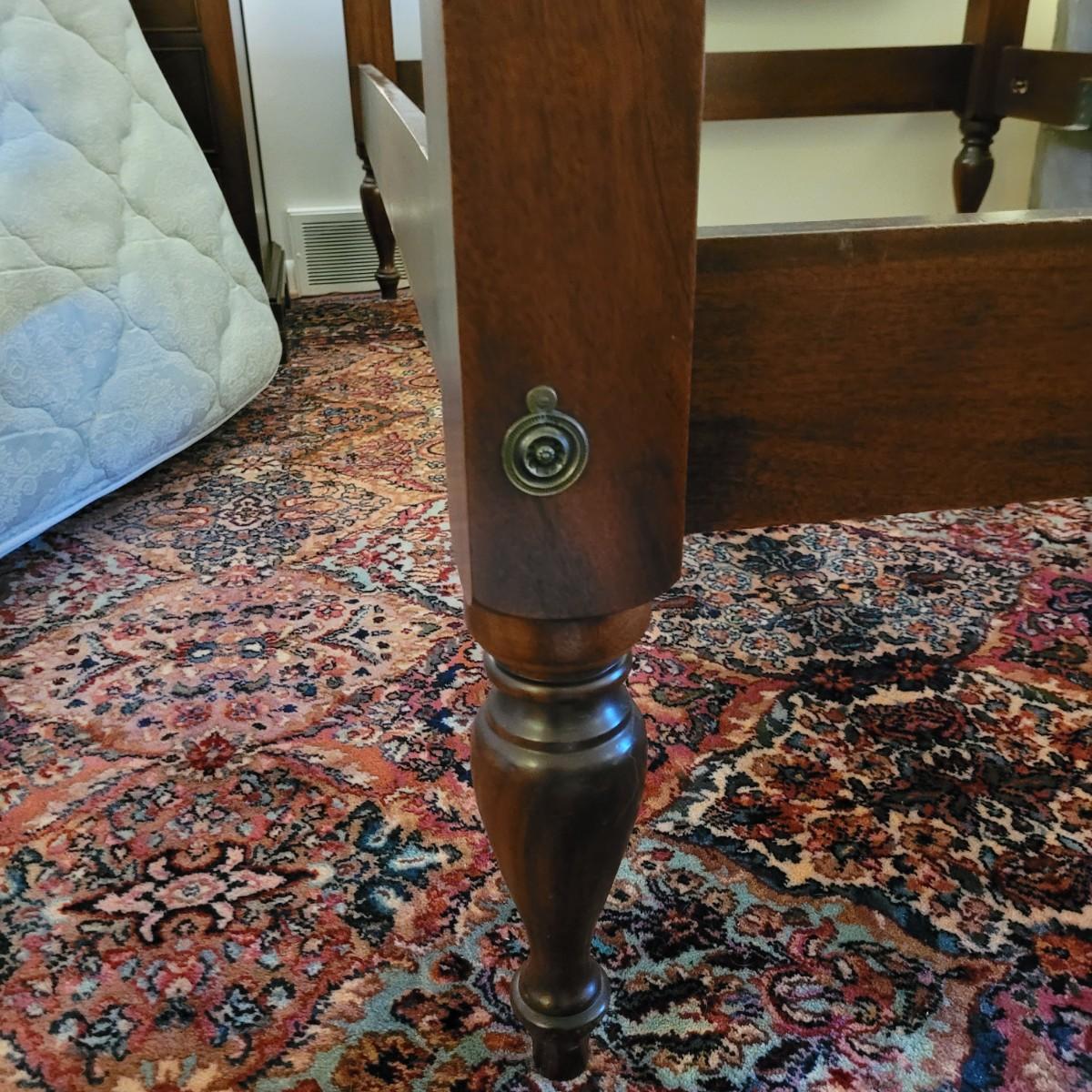 Beautiful solid dark wood cannonball poster style bed in very good condition with very few scratches (see photos). Frame measures approximately 58"L x82"W x36"H at foot, 48"H at head. Mattress pad not included. Mattress and box spring are available to the winning bidder if desired. Ethan Allen pillowtop mattress is clean and in good condition. Local pickup only. Items are large and heavy. The winning bidder must please bring help to move and load. Winning bidder will also need to disassemble bed frame.