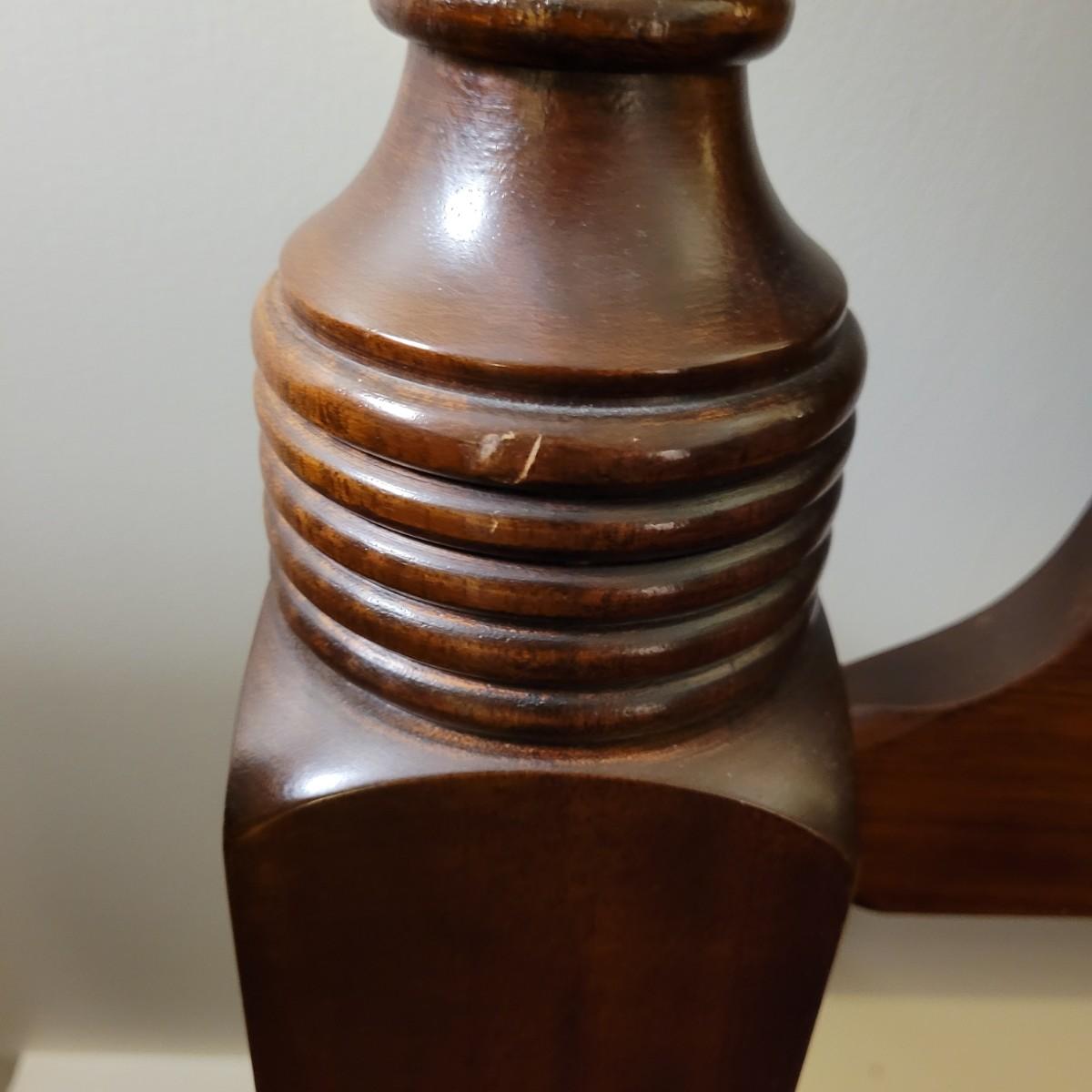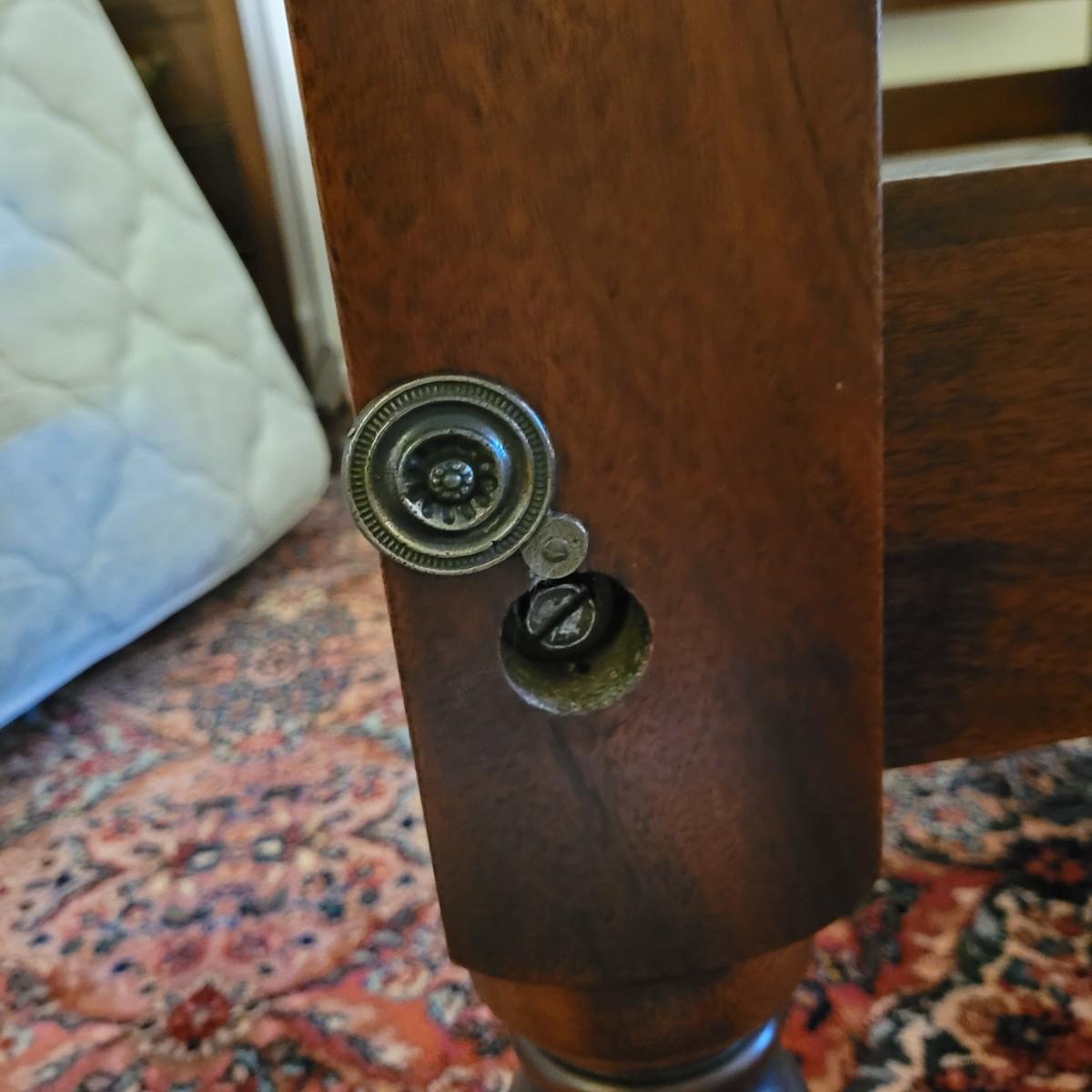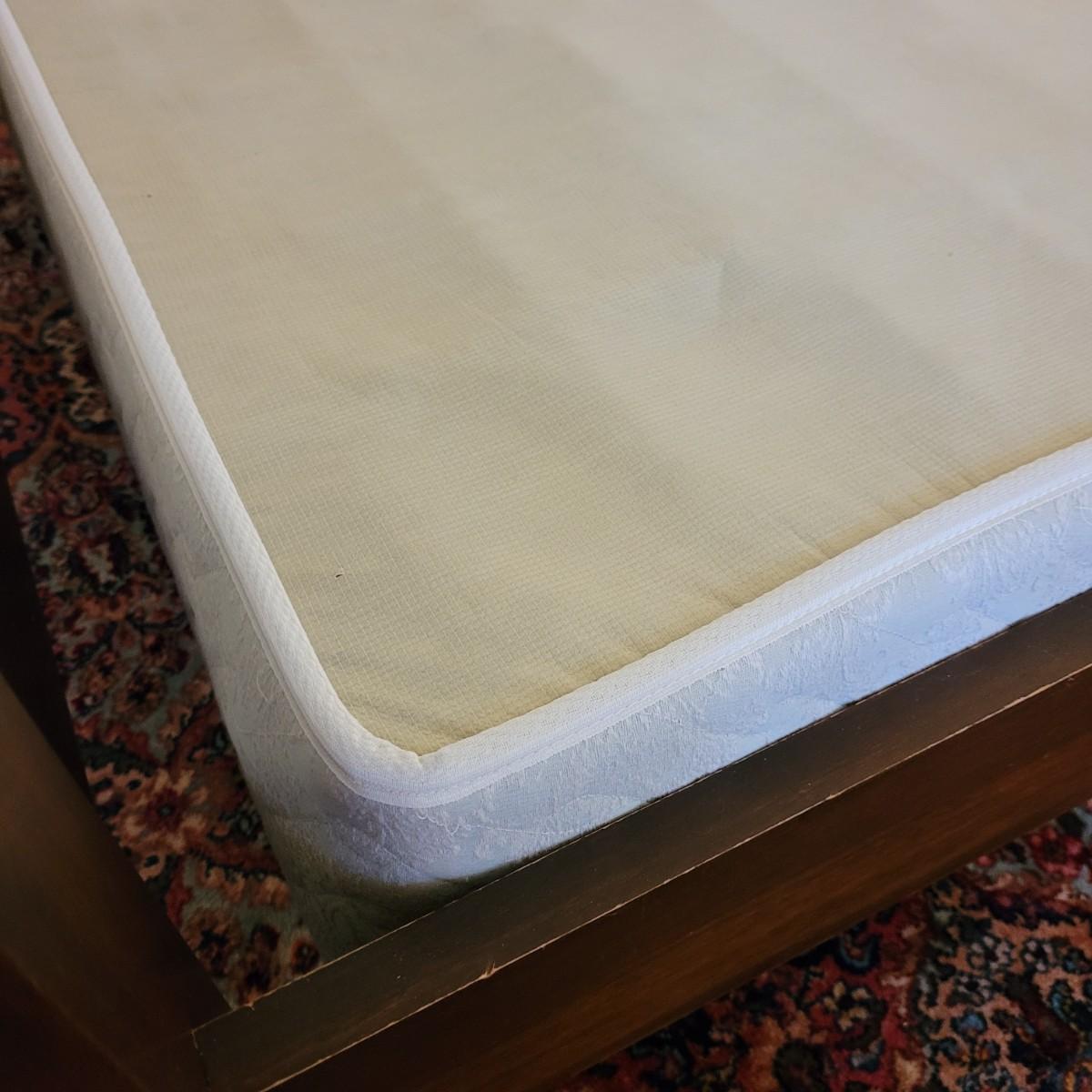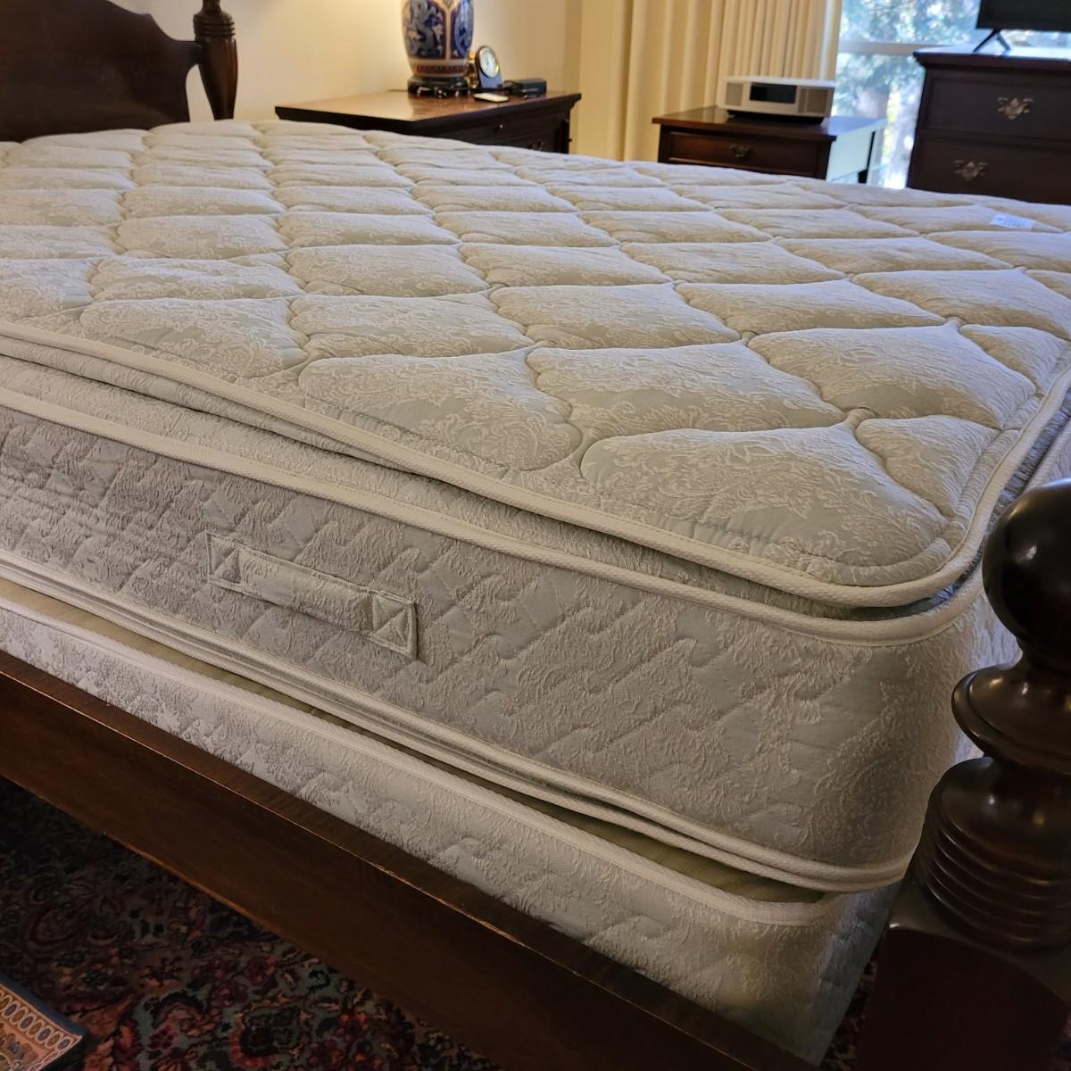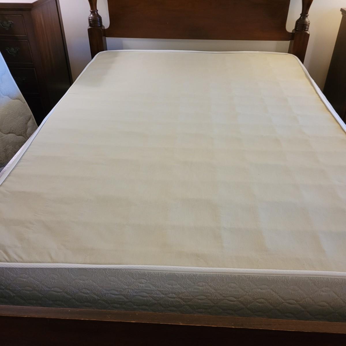 Beautiful solid dark wood cannonball poster style bed in very good condition with very few scratches (see photos). Frame measures approximately 58"L x82"W x36"H at foot, 48"H at head. Mattress pad not included. Mattress and box spring are available to the winning bidder if desired. Ethan Allen pillowtop mattress is clean and in good condition. Local pickup only. Items are large and heavy. The winning bidder must please bring help to move and load. Winning bidder will also need to disassemble bed frame.