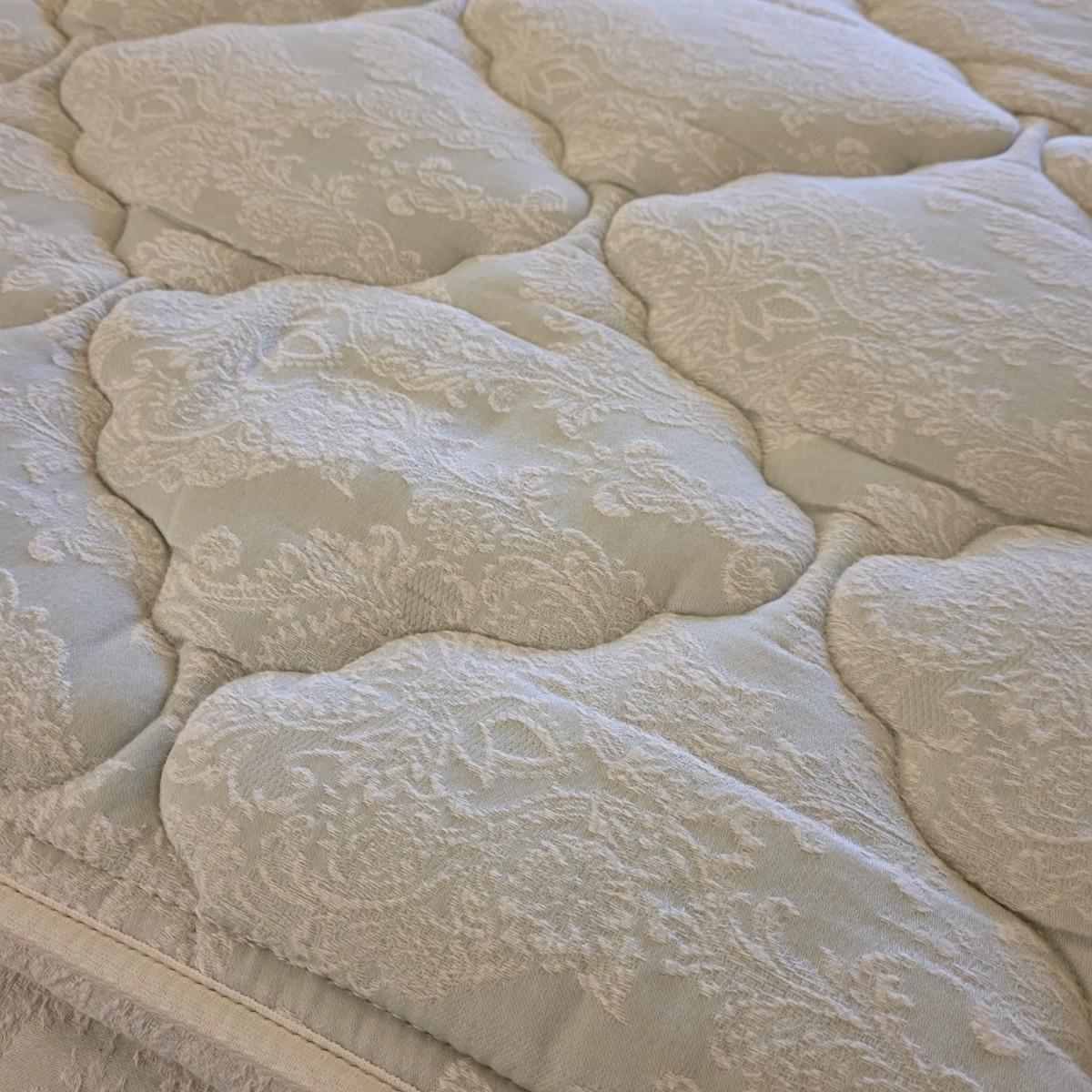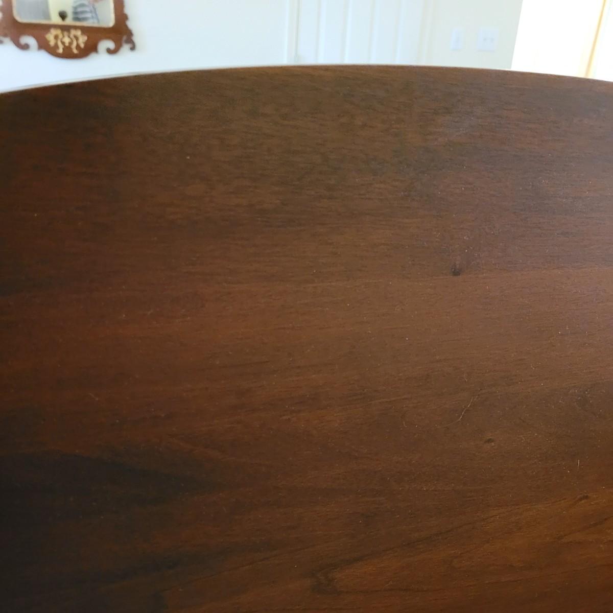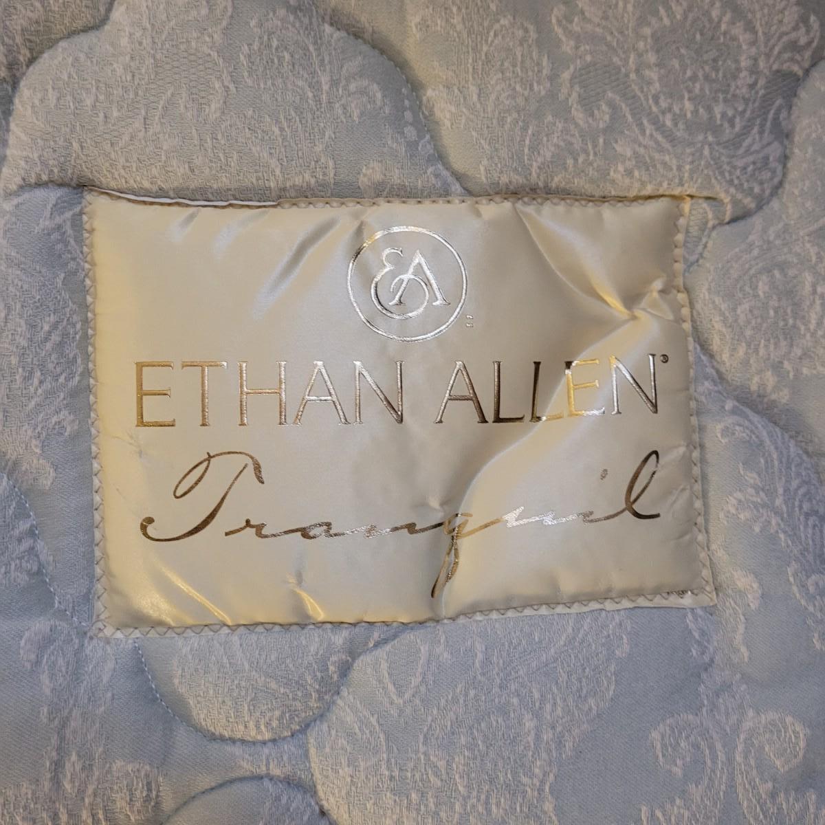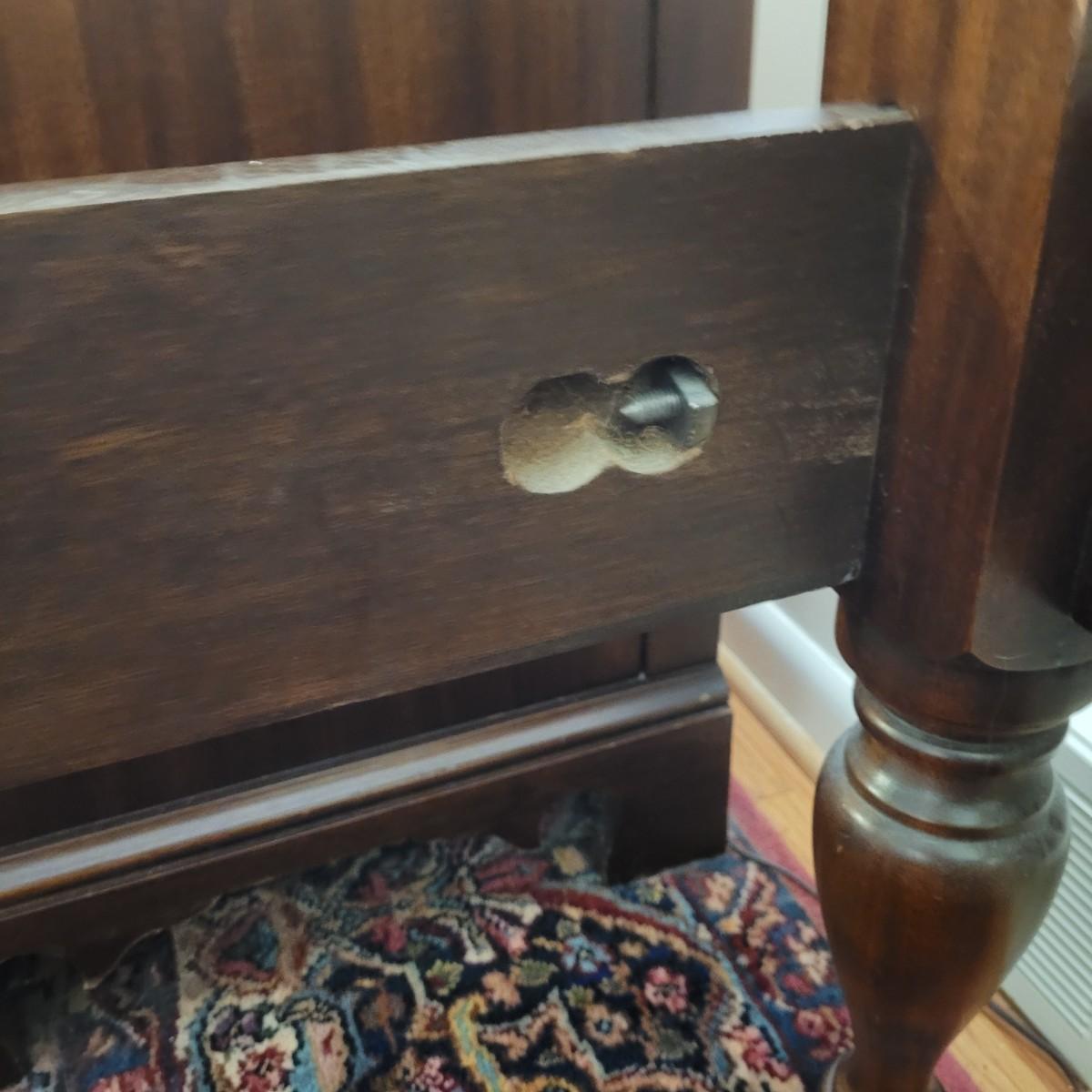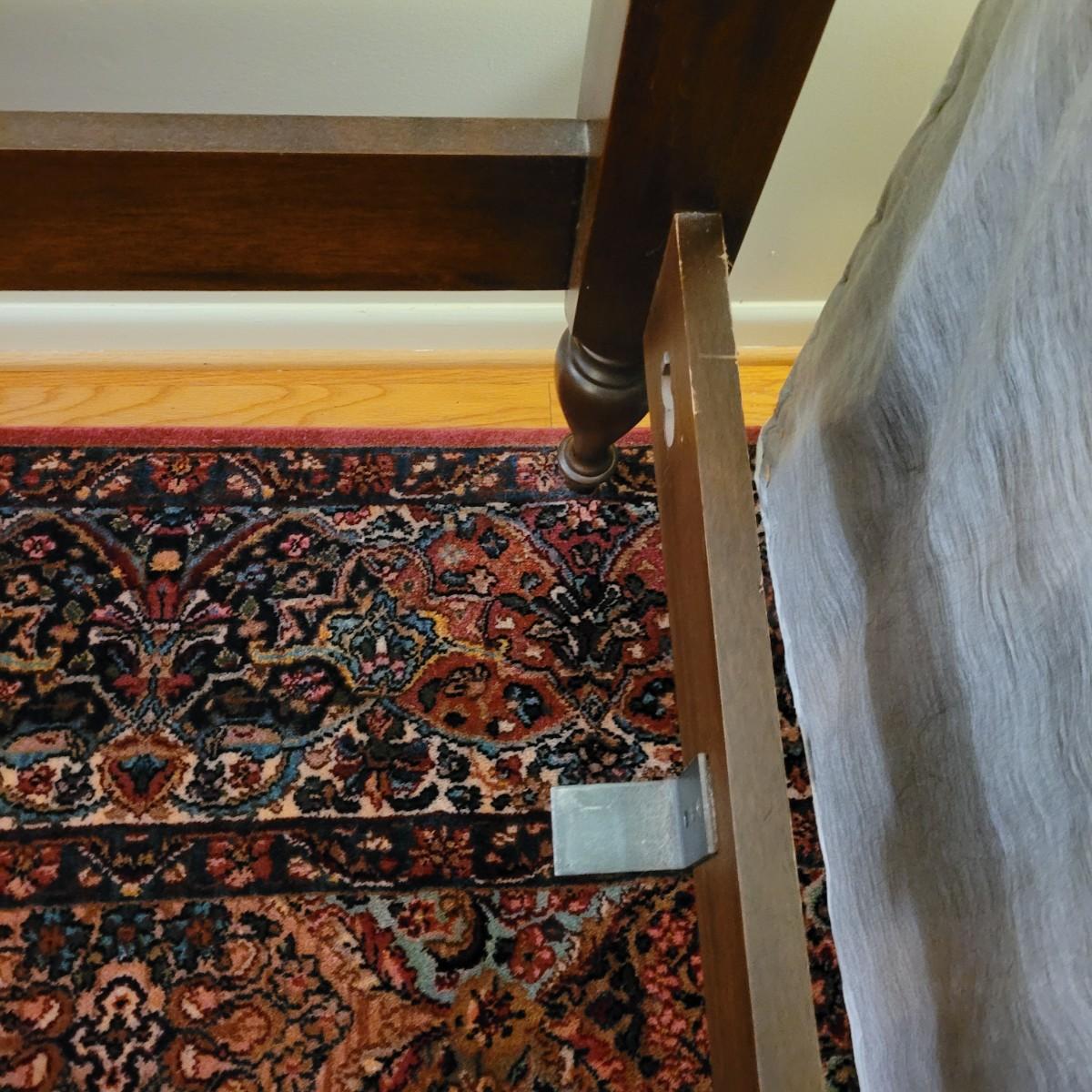 Beautiful solid dark wood cannonball poster style bed in very good condition with very few scratches (see photos). Frame measures approximately 58"L x82"W x36"H at foot, 48"H at head. Mattress pad not included. Mattress and box spring are available to the winning bidder if desired. Ethan Allen pillowtop mattress is clean and in good condition. Local pickup only. Items are large and heavy. The winning bidder must please bring help to move and load. Winning bidder will also need to disassemble bed frame.
