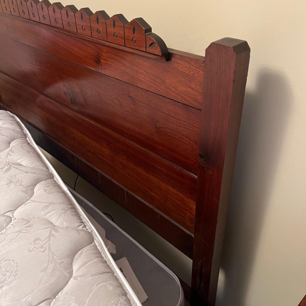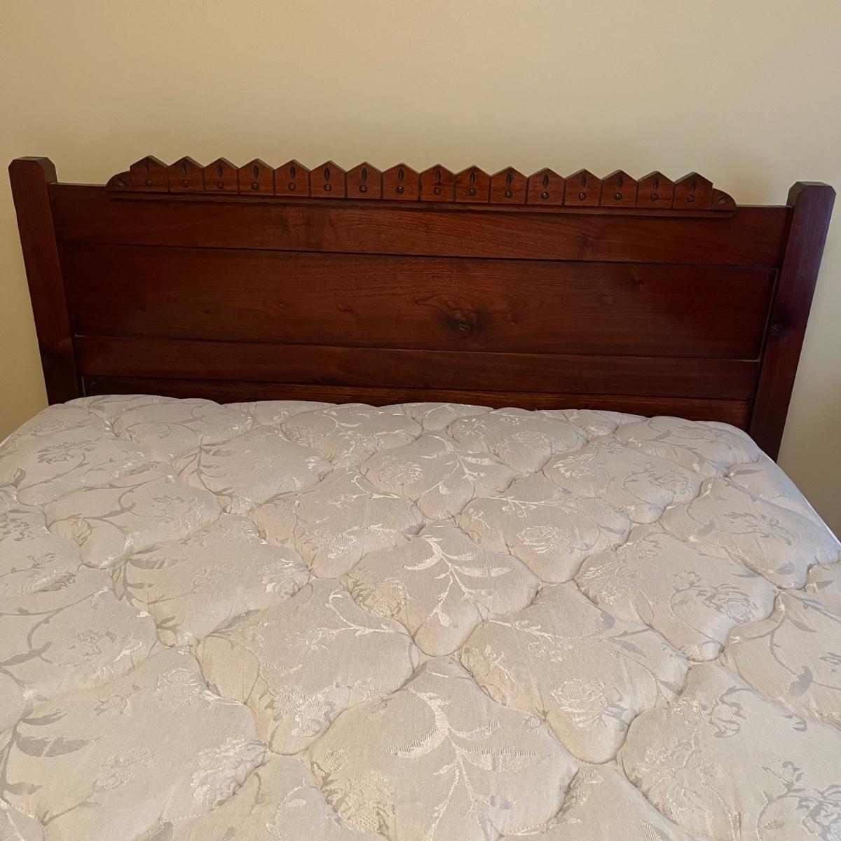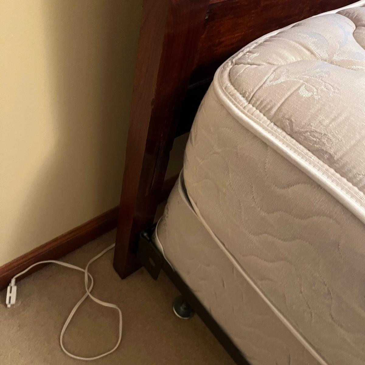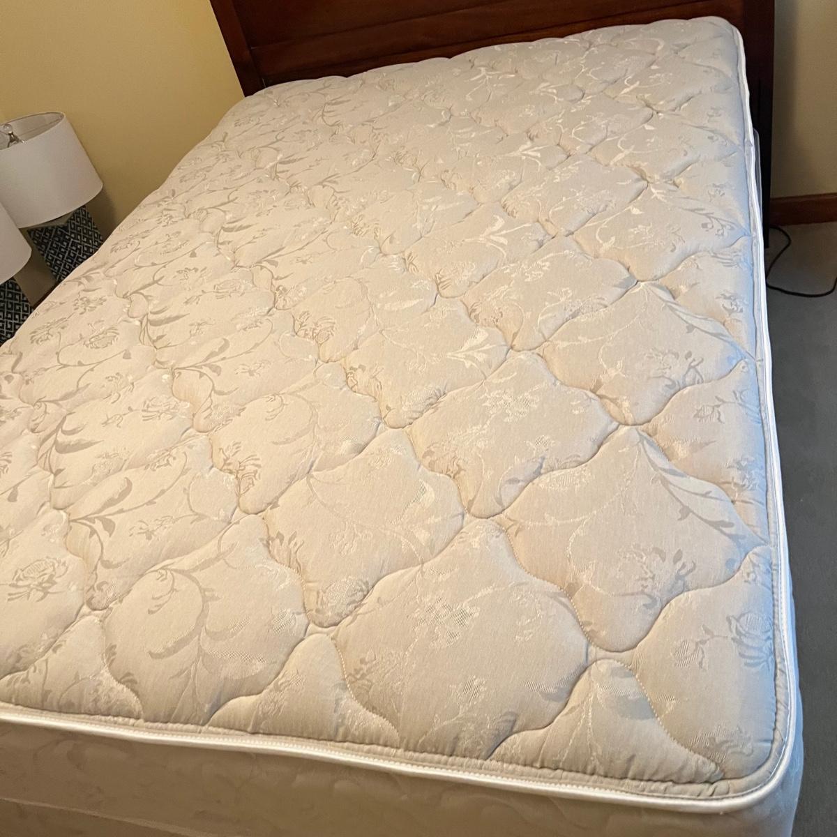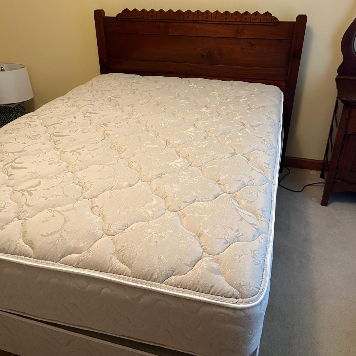 Lot includes a full size wooden headboard with metal bed frame. The headboard measures 56” x 43”H. The Serta mattress and box spring are available to winning bidder but not required.