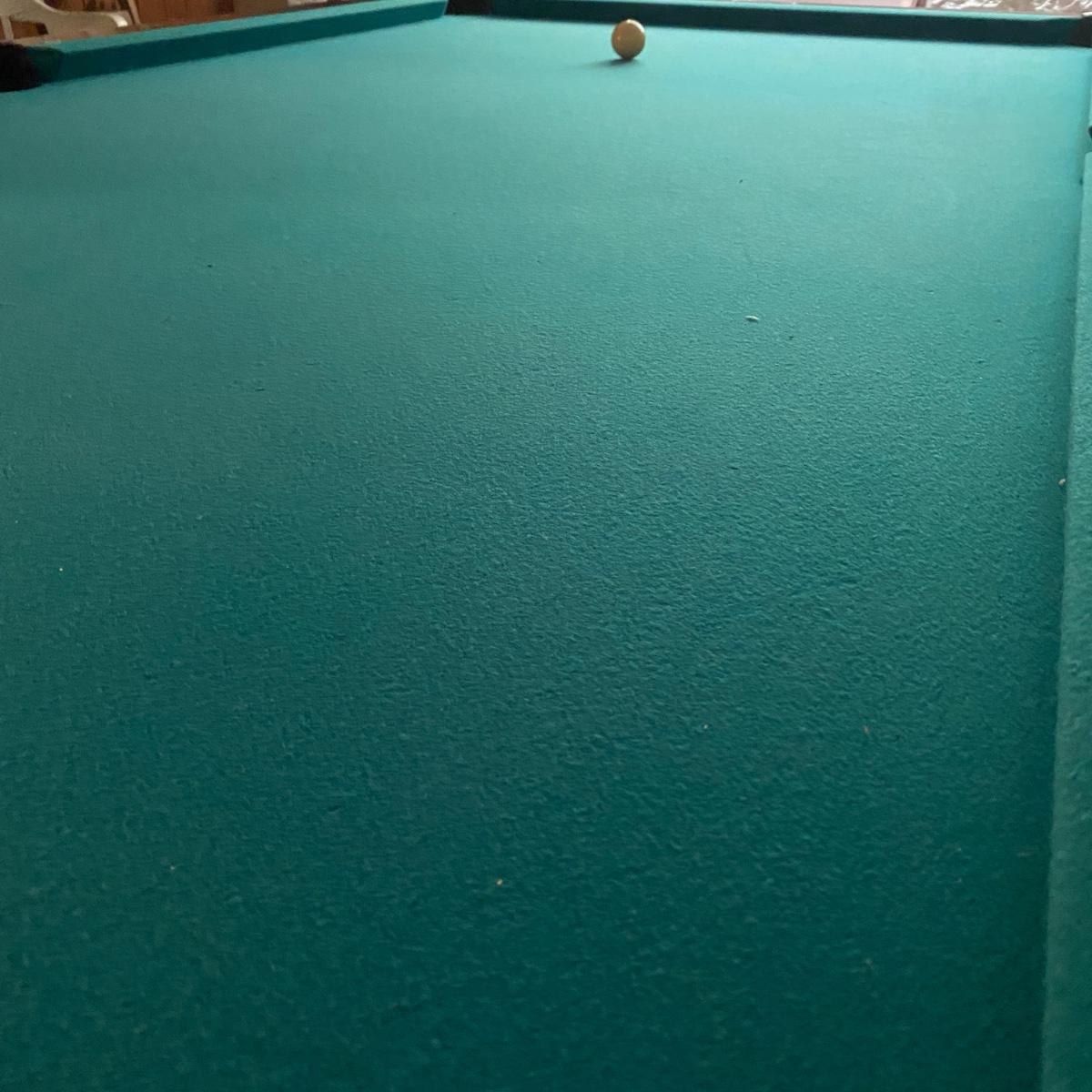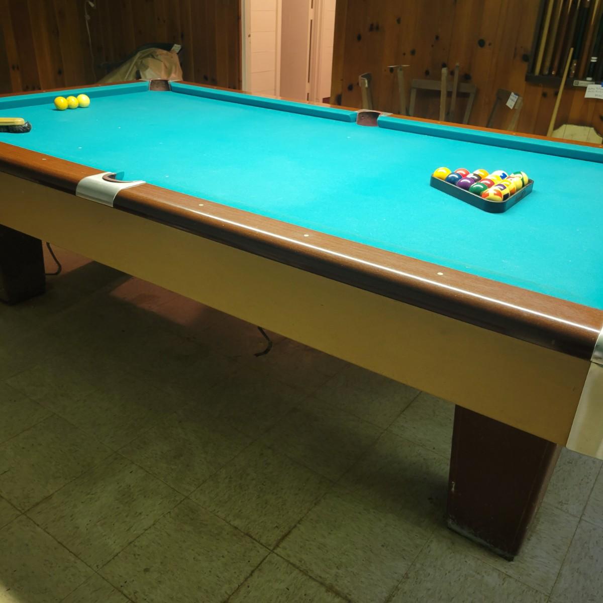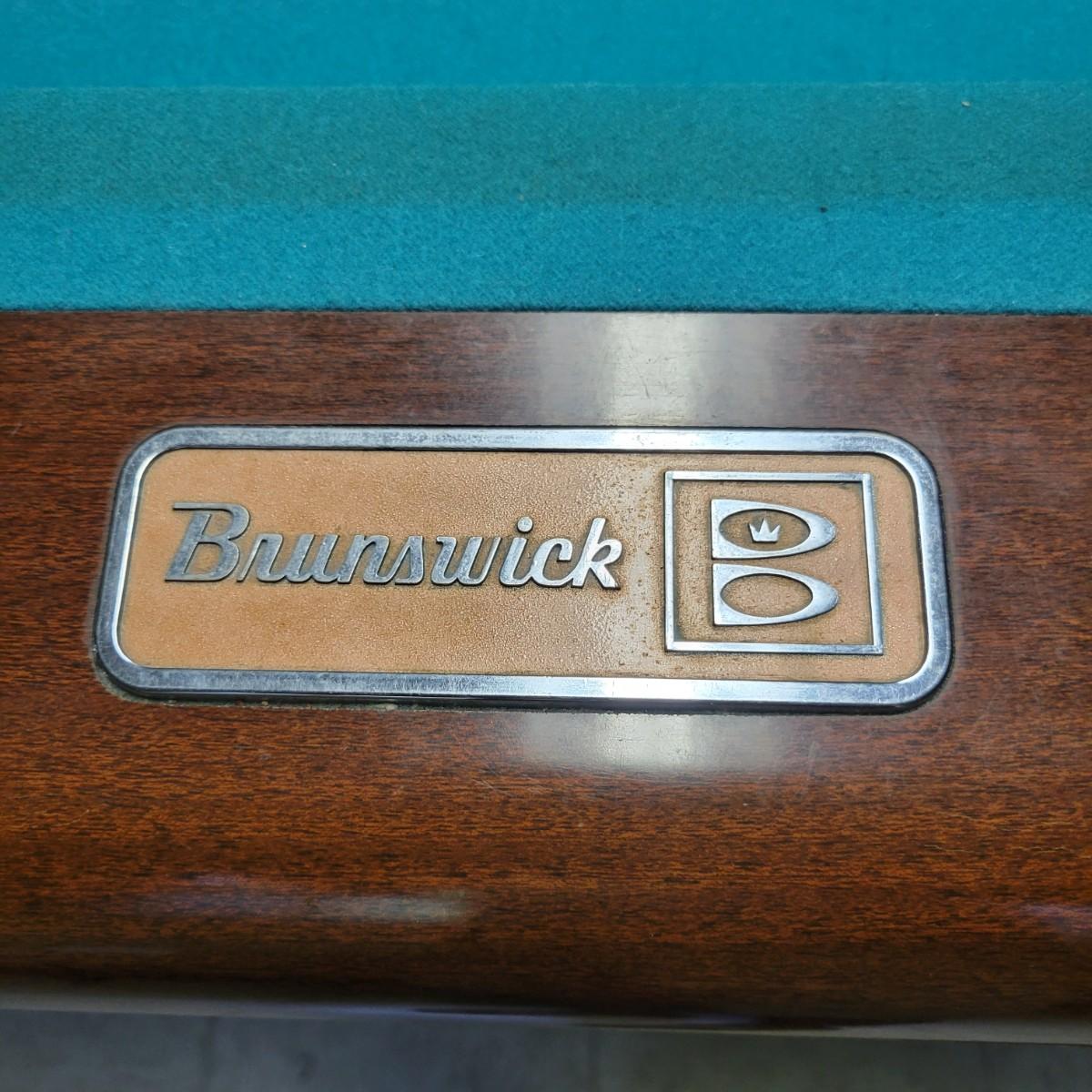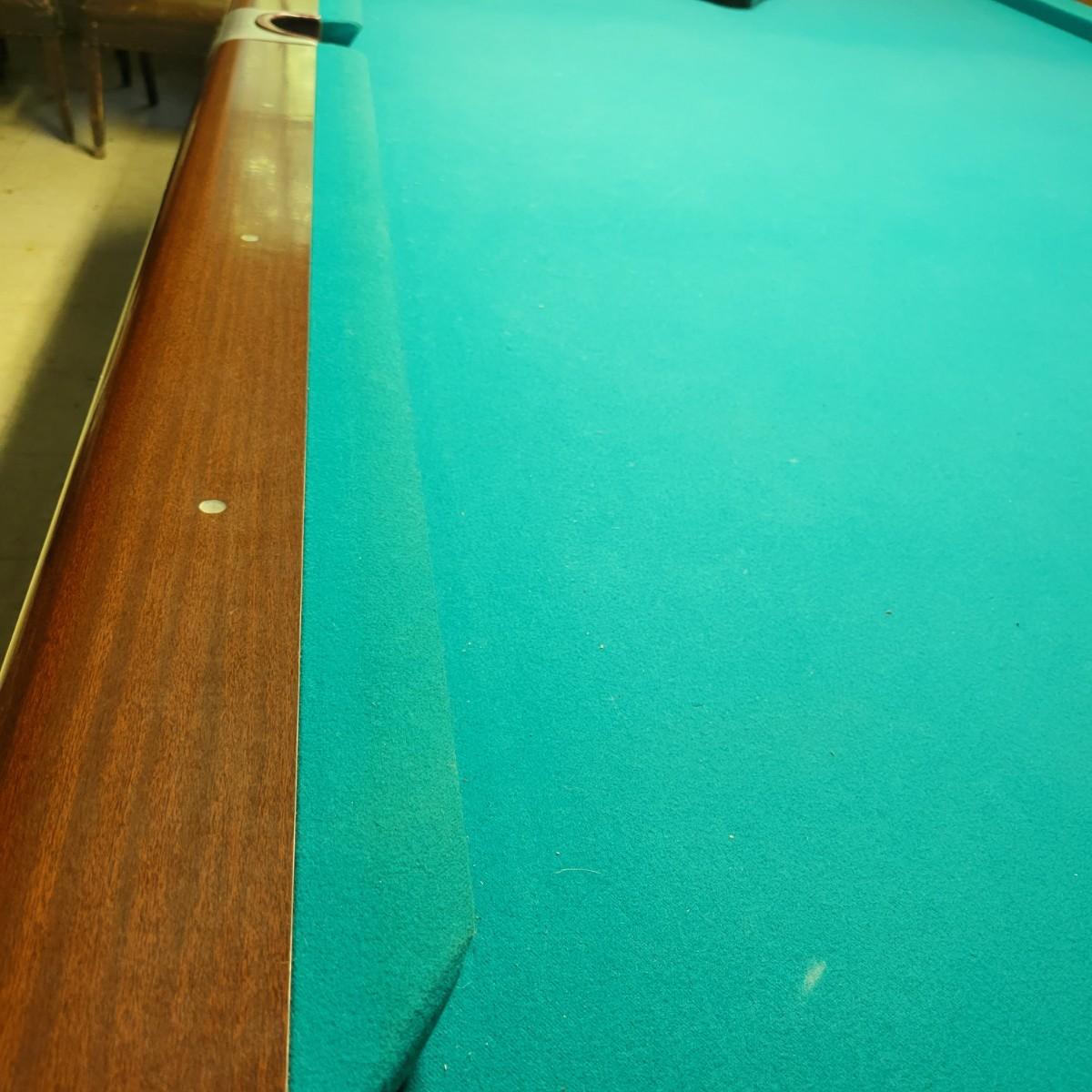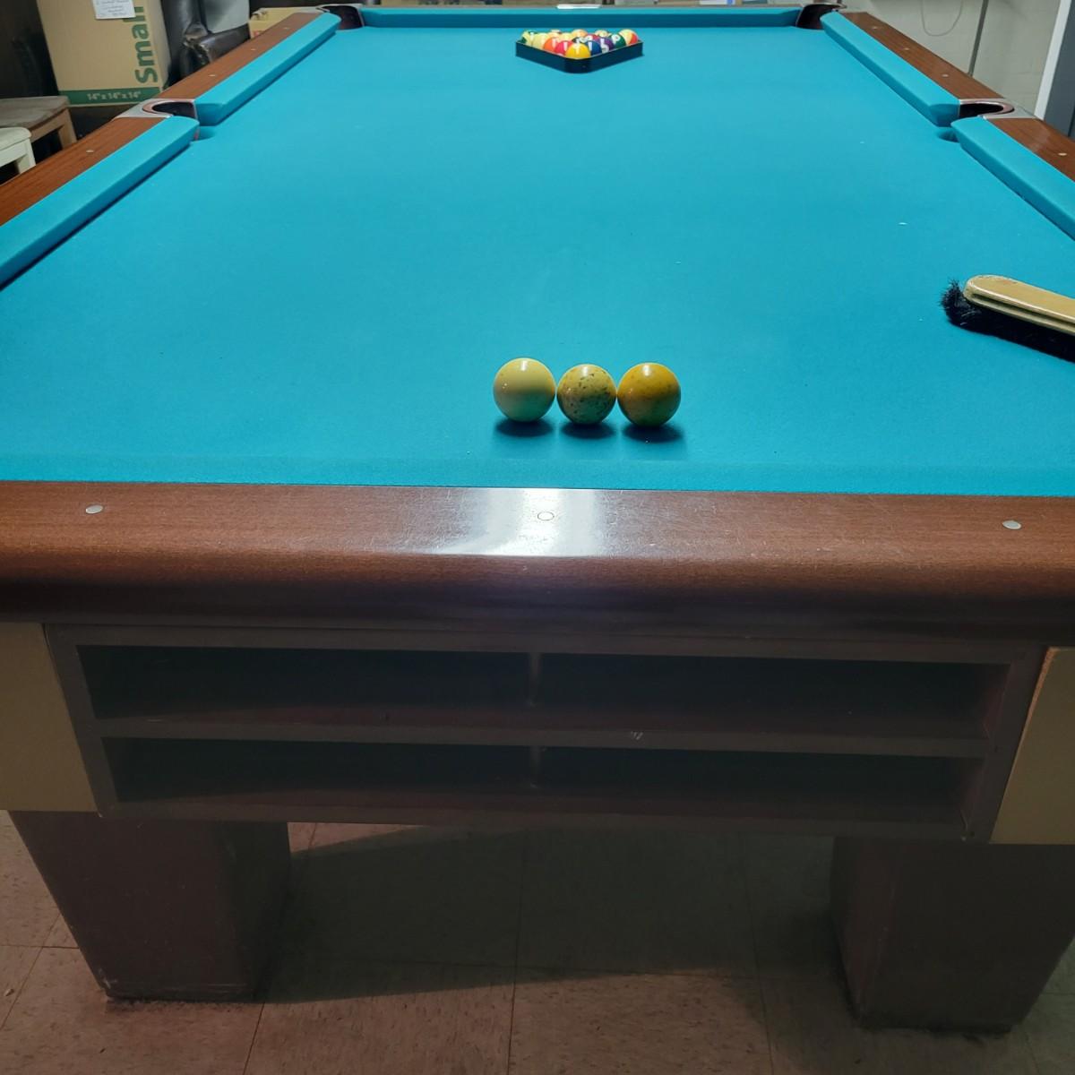 A full sized Brunswick pool table in good condition. Felt has no tears or runs. It appears it has a 1" slate top. Table is constructed of wood, composite sides and aluminum pocket corners. Includes a rack, a full set of balls and 3 cue balls. Also included is an 8' overhead fluorescent light with a felt wrap around shade. This auction has an additional lot of cues and balls; bid on both lots to get a full set of pool accessories! The lamp is hardwired and the winning bidder will need to remove the electrical caps to remove the lamp. This is a very large and heavy table that will require disassembly and moving by the winning bidder. It is recommended to contact a professional that moves and sets up pool tables. Table measures approximately 112" x 63" x 32". Overhead light measures approximately 8' x 12". Local pickup only