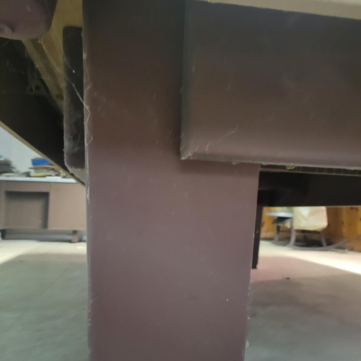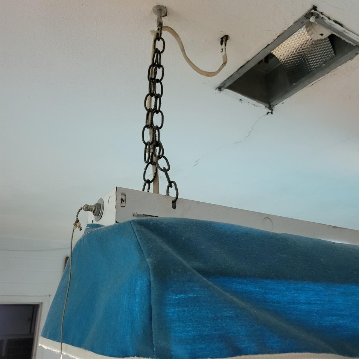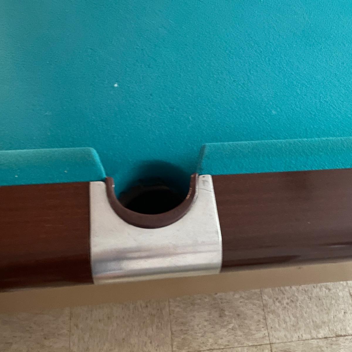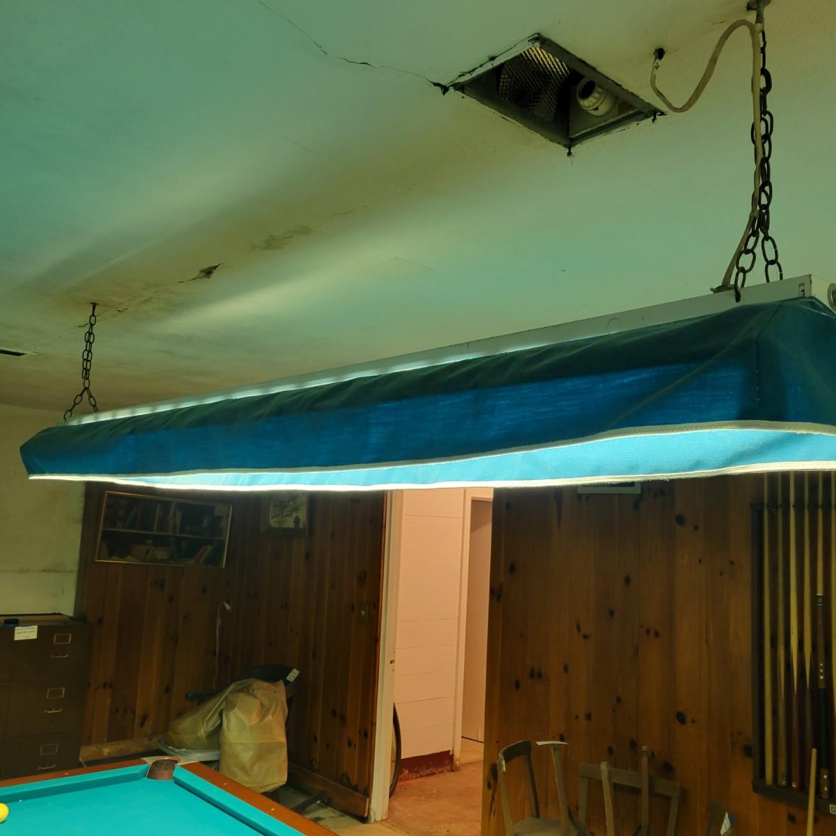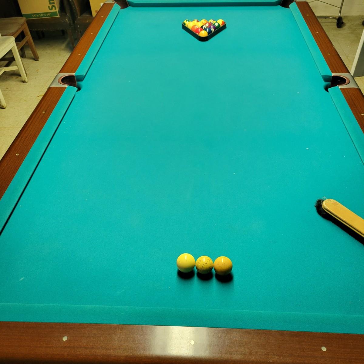 A full sized Brunswick pool table in good condition. Felt has no tears or runs. It appears it has a 1" slate top. Table is constructed of wood, composite sides and aluminum pocket corners. Includes a rack, a full set of balls and 3 cue balls. Also included is an 8' overhead fluorescent light with a felt wrap around shade. This auction has an additional lot of cues and balls; bid on both lots to get a full set of pool accessories! The lamp is hardwired and the winning bidder will need to remove the electrical caps to remove the lamp. This is a very large and heavy table that will require disassembly and moving by the winning bidder. It is recommended to contact a professional that moves and sets up pool tables. Table measures approximately 112" x 63" x 32". Overhead light measures approximately 8' x 12". Local pickup only