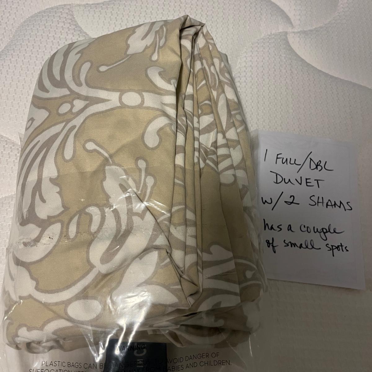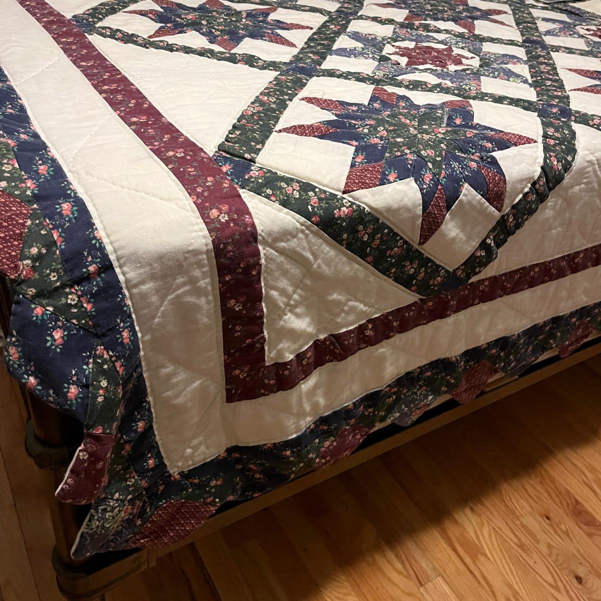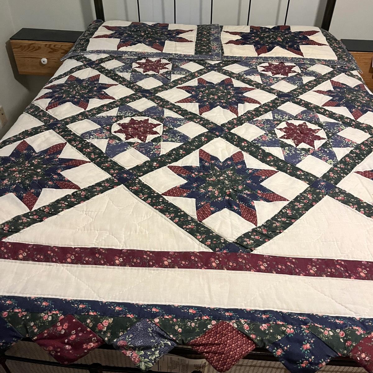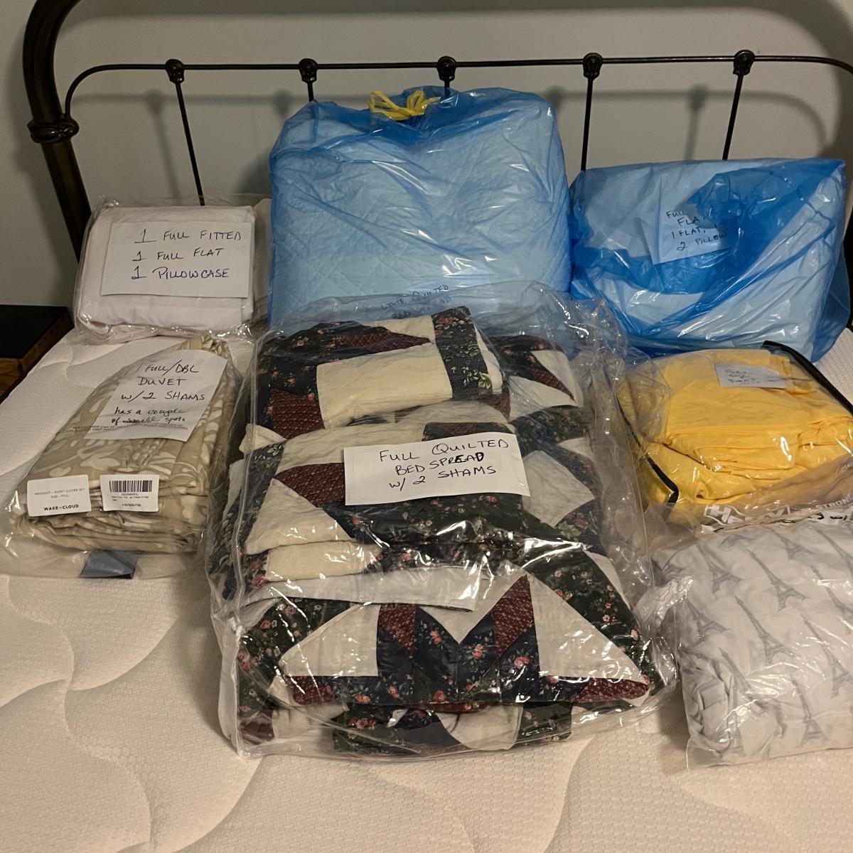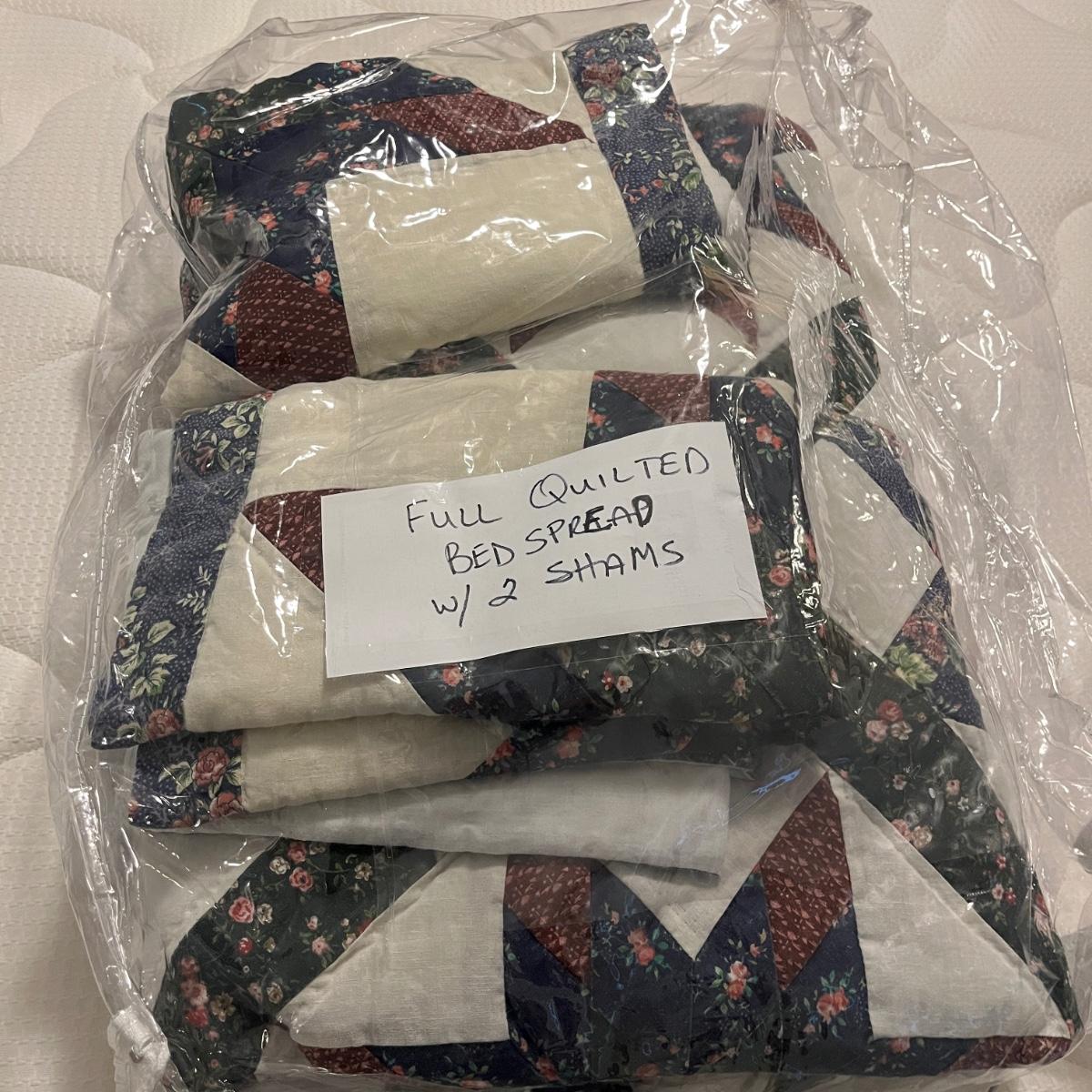 Lot includes two quilted bedspreads, two duvets and three sheet sets all are full size. Star quilt measures 76” x 86”. See images for more information.