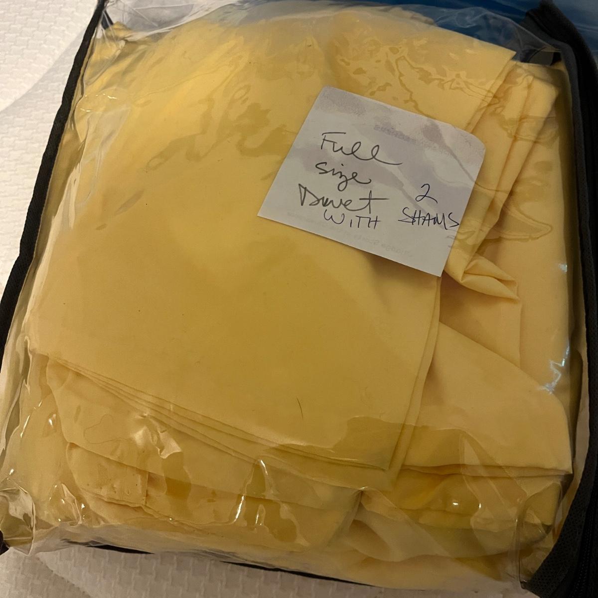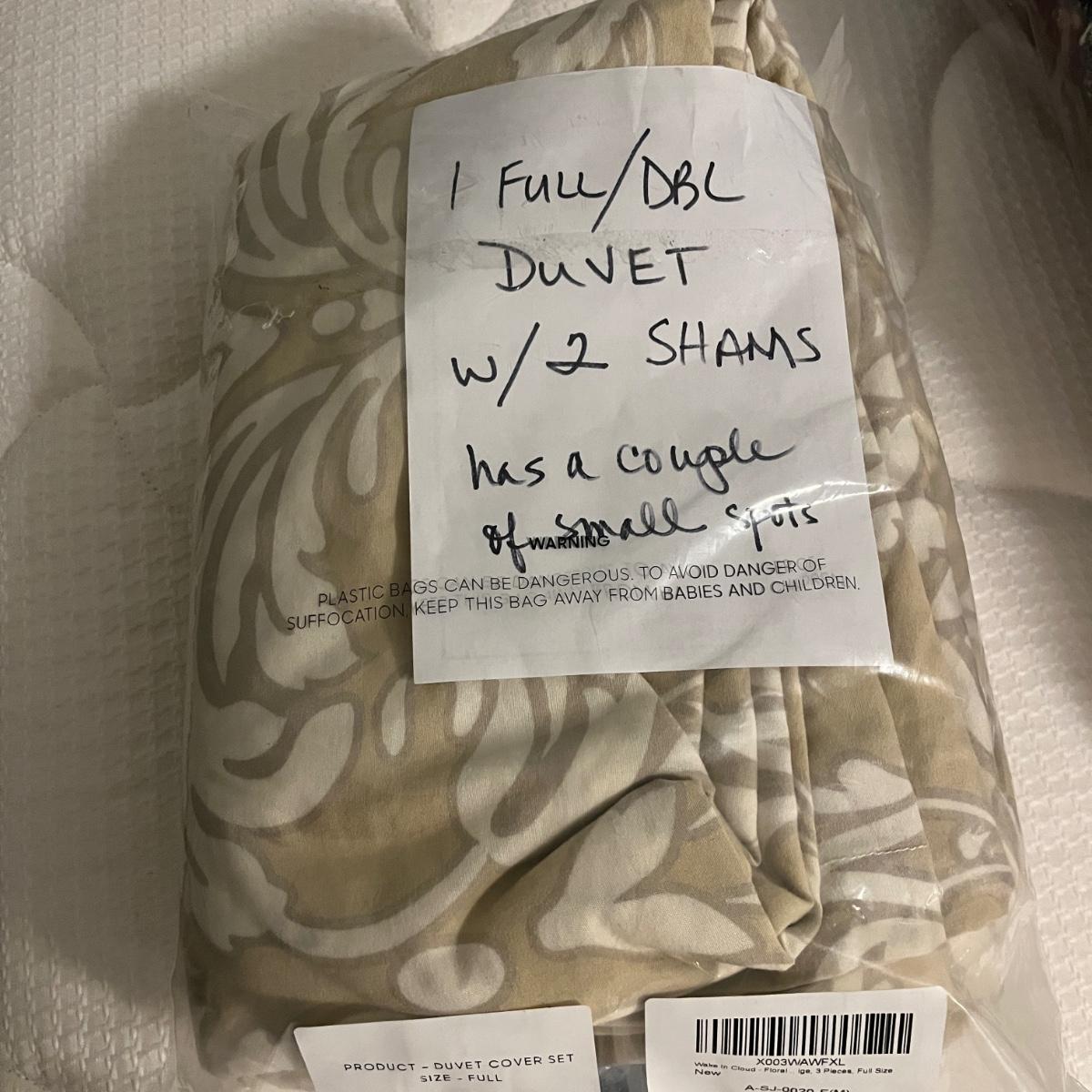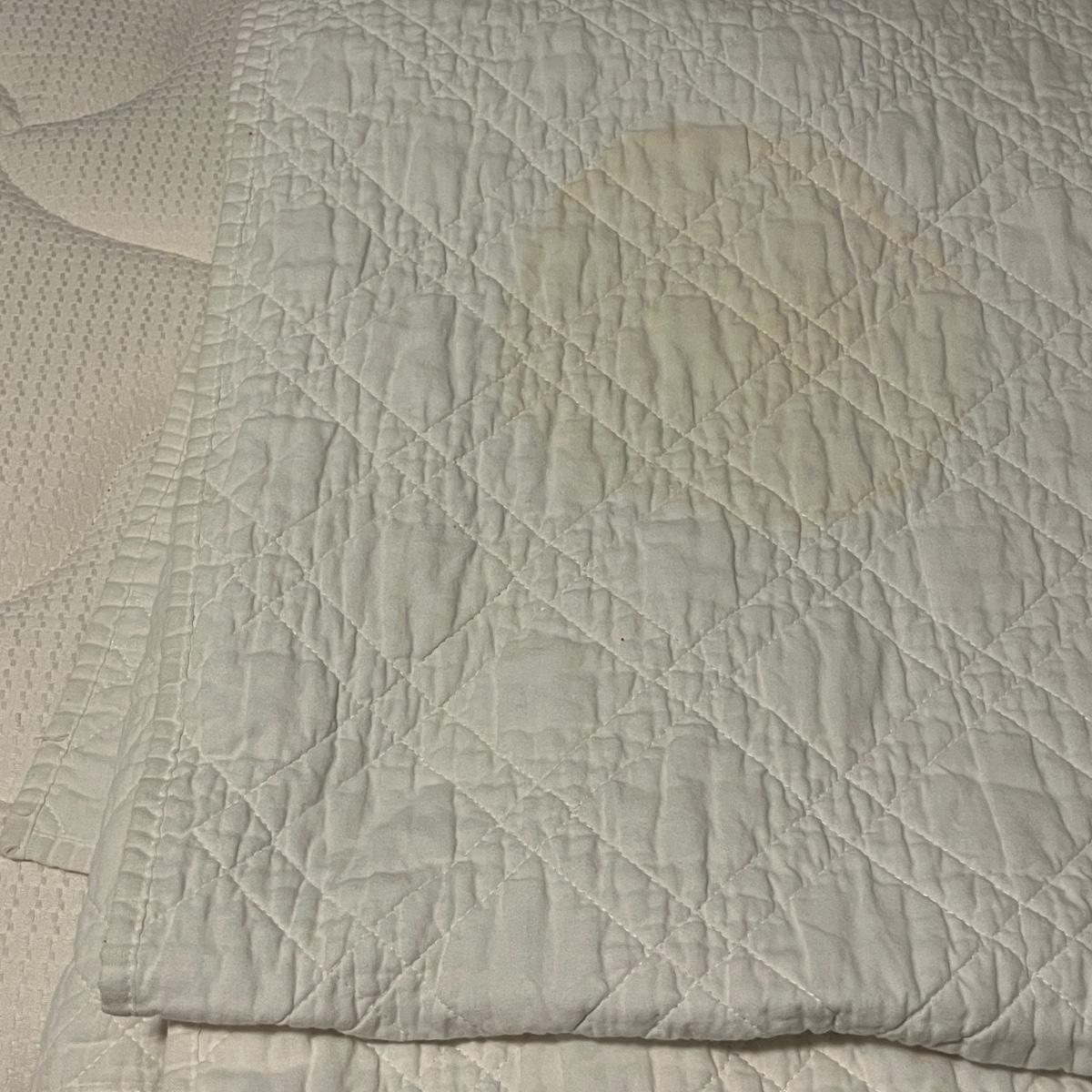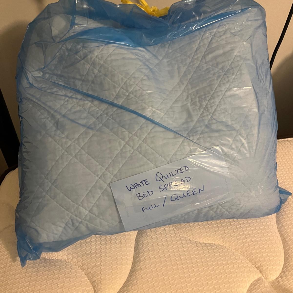 Lot includes two quilted bedspreads, two duvets and three sheet sets all are full size. Star quilt measures 76” x 86”. See images for more information.