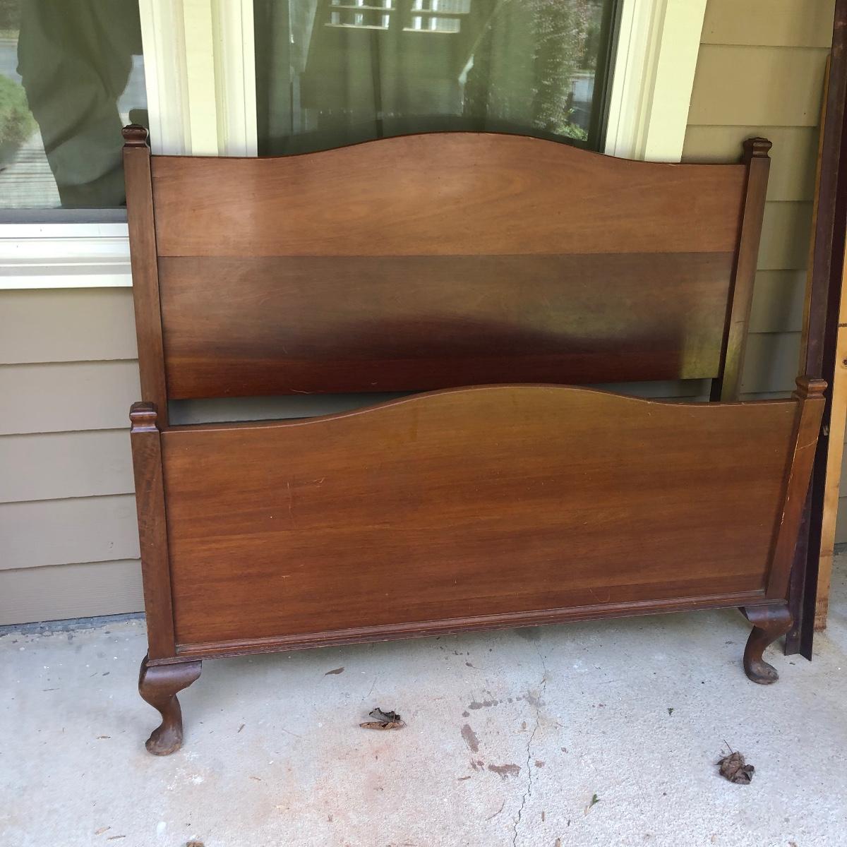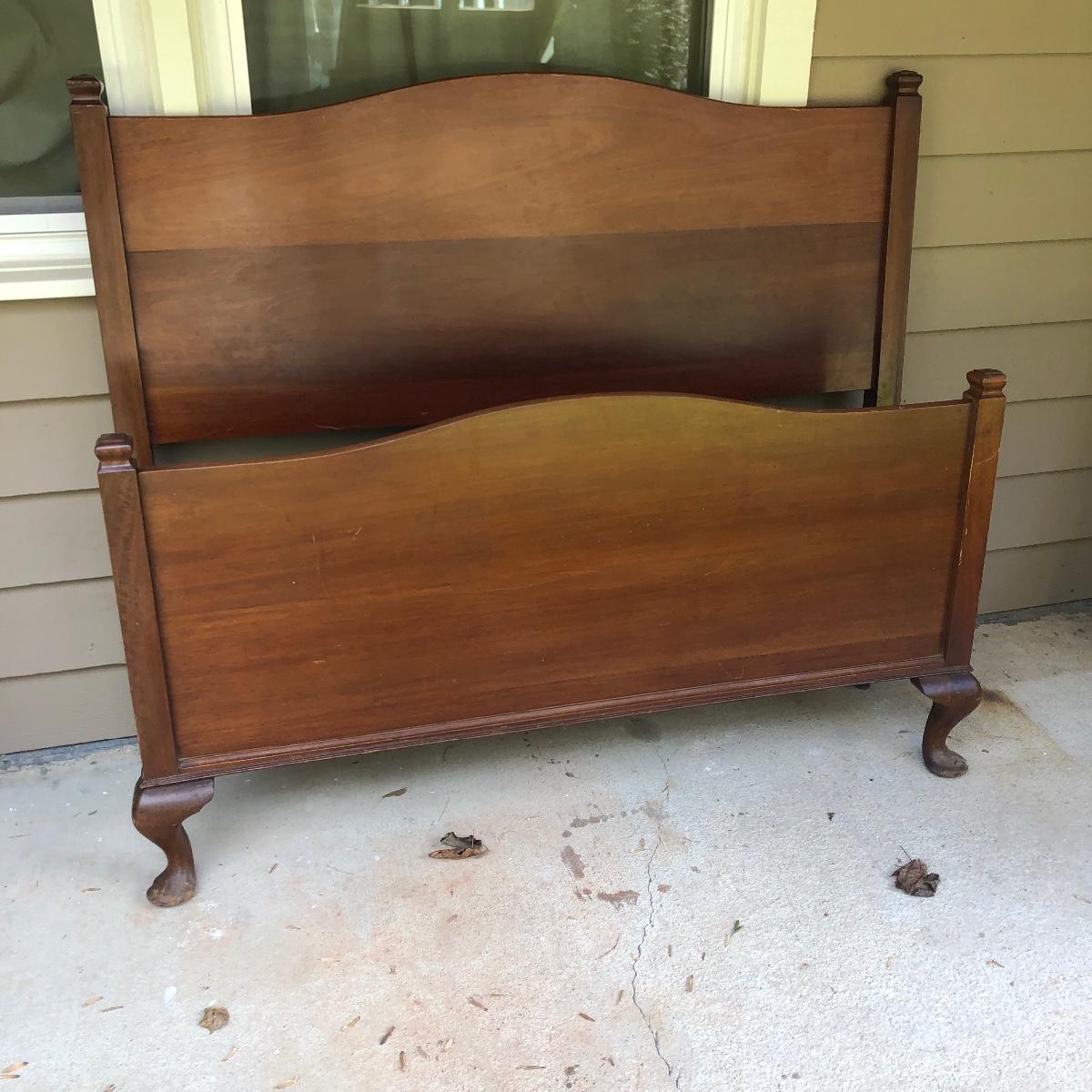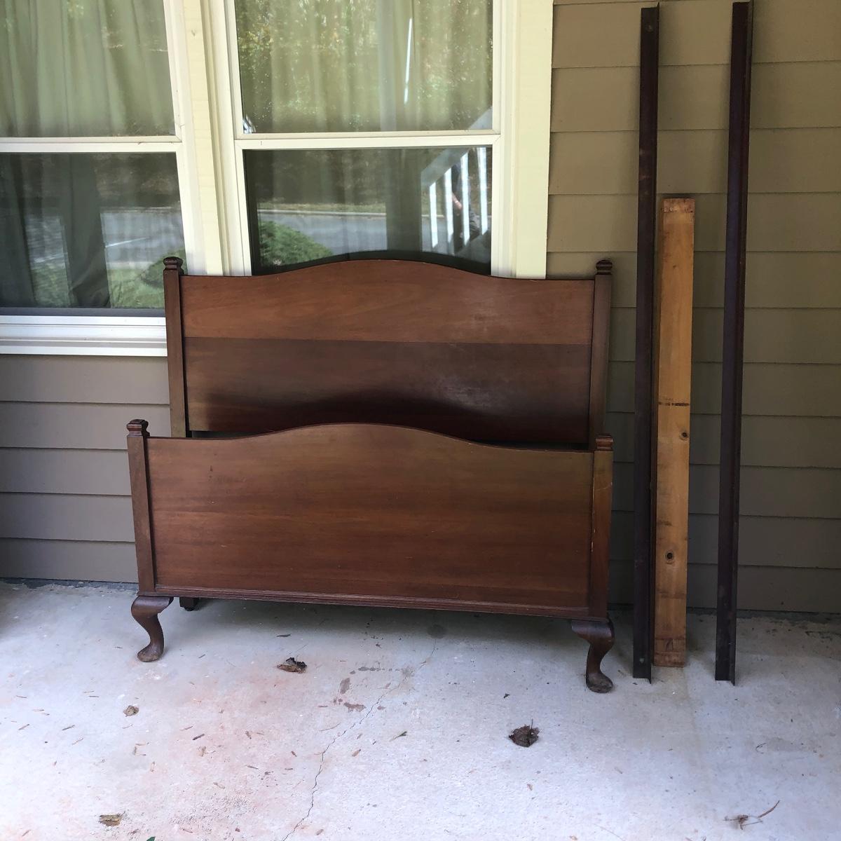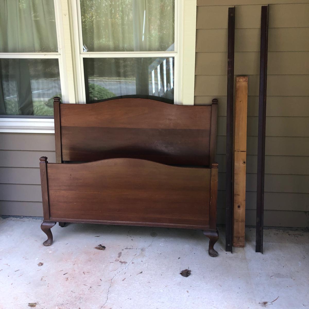 Lot includes a wooden full sized bed that includes headboard and footboard with iron frame. Bed has some scratches and nicks, see pictures. Headboard measures 46” x 54”.