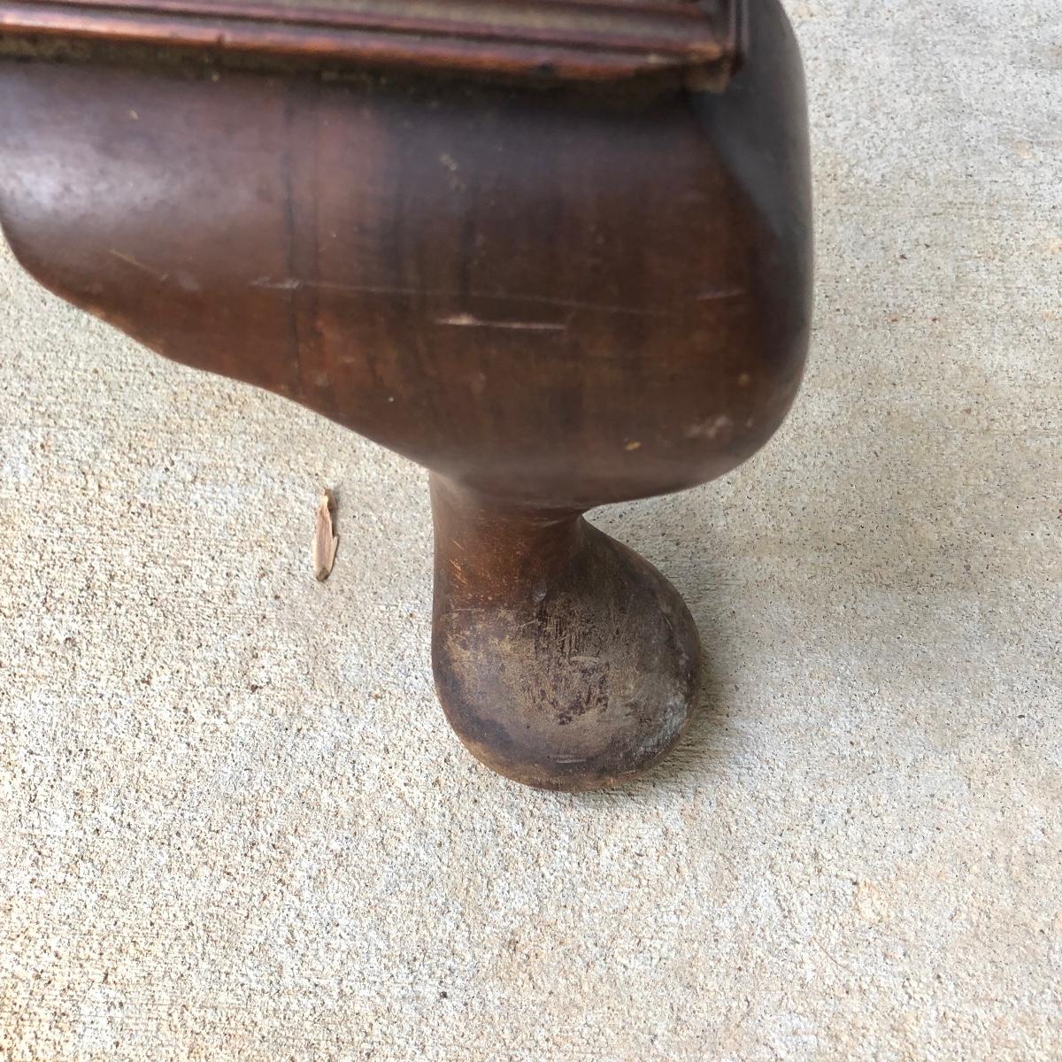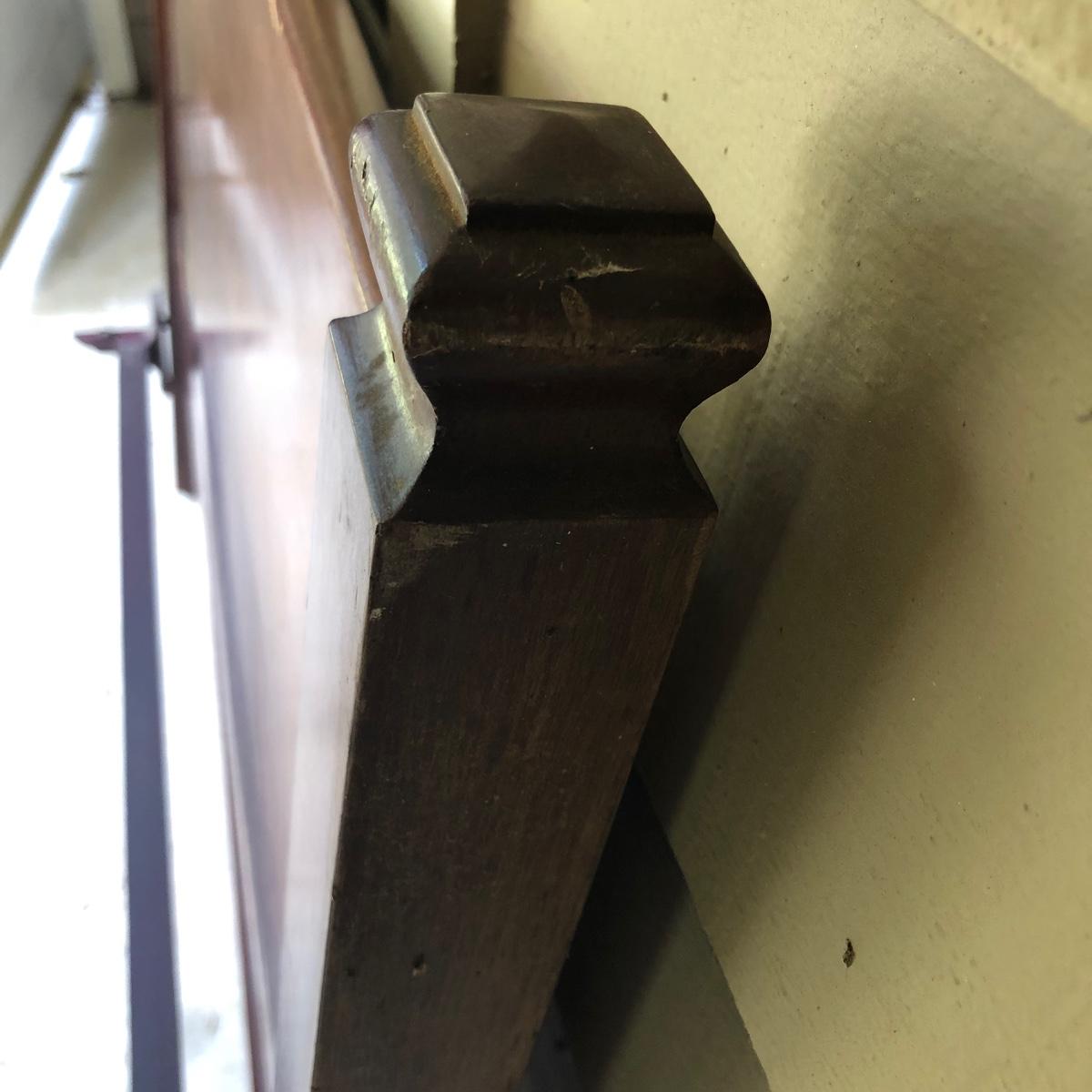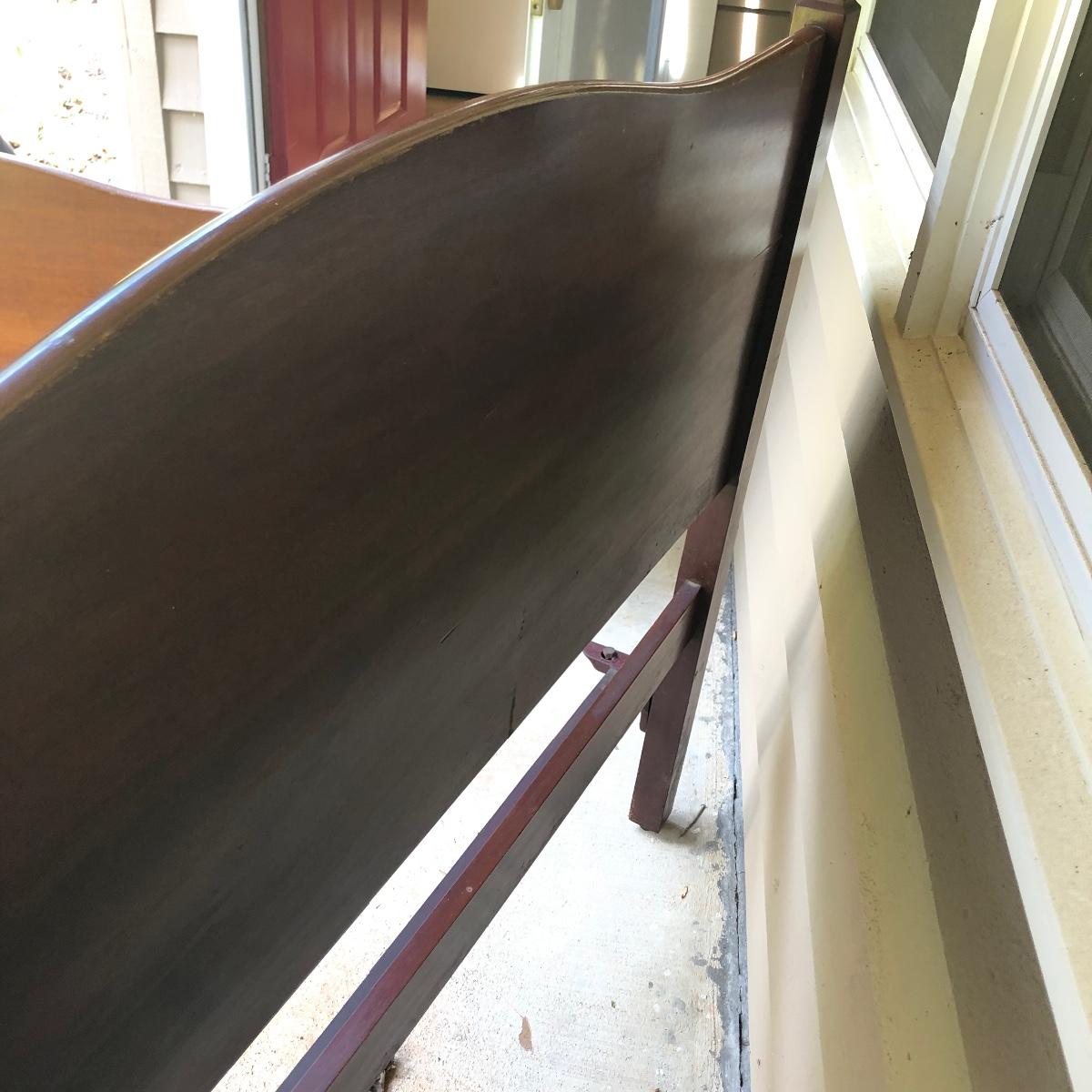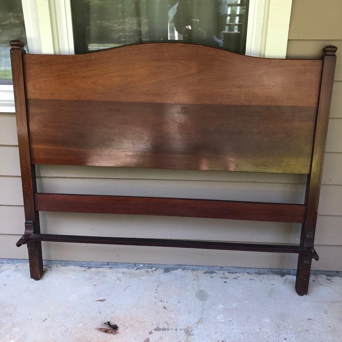 Lot includes a wooden full sized bed that includes headboard and footboard with iron frame. Bed has some scratches and nicks, see pictures. Headboard measures 46” x 54”.